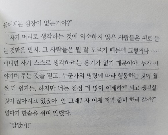 "... 아무것도 절대로 믿어서는 안돼. 어떠한 단어도 구호도 크게 이야기해서는 안 되고 누구를 비판하거나 칭찬해서도 안돼. 머리로만 생각하고 심장으로만 들어야 해. 마음은 절대로 배신하지 않아." "심장으로 듣는다는 것이 무슨 말이야? 심장은 뛰기만 하잖아." "단어로 표현할 수 없는 것들을 그렇게 말해. 네가 언젠가 쿠프라노프 씨네가 왜 유배되었냐고 물은 적 있지? 그때 내가 혁명 후에 재산이 많았던 모든 부농들이 인민의 적 또는 착취자라고 한다고 설명해 주었잖아. 그리고 수천 명의 부농들의 재산을 몰수했다고. 너는 그때 내 이야기를 듣고 물어봤어. '부농들은 좋은 사람들이잖아요. 다른 사람들을 도와주기도 하고 우리도 도와줬잖아요. 일을 잘하고 정직한데 왜 그들이 적이야?'라고 말이야. 그게 바로 심장으로 듣는다고 이야기하는 거야. 너는 귀로 인민의 적들에 대해서 듣지만 네 심장은 믿지 않고 그것이 실제로 그렇지 않다는 것을 느끼잖아." "그런데 왜 많은 사람들은 귀로 듣는 것을 믿는 거야? 그 사람들에게는 심장이 없는 거야?" "자기 머리로 생각하는 것에 익숙하지 않은 사람들은 귀로 듣는 것만을 믿지. 그 사람들은 뭘 잘 모르기 때문에 그렇거나...... 아니면 자기 스스로 생각하려는 용기가 없기 때문이야. 누가 이야기해주는 것을 믿고, 누군가의 명령에 따라 행동하는 것이 훨씬 쉽거든. 하지만 너는 점점 더 많이 이해하게 되고 생각할 것이 많아지고 있잖아, 안 그래?" (194-195p)