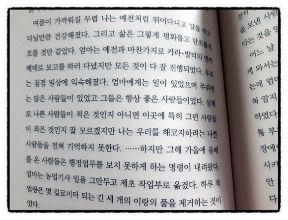 피의 숙청, 사회주의 혁명, 스탈린, 2차 세계대전, 강제 이주. 1930년대 역사책 속 몇 줄 속에 엘랴는 살았다. 마치 소설 태백산맥을 읽는 느낌이었다. 역사책에서는 보이지 않는 사람의 시간을 보는 것 같았다. 실화에 바탕을 두었다는 것이 믿기힘들었다.