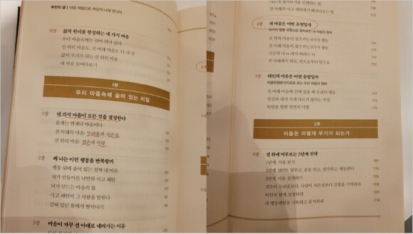 생각보다 많은 분량이었지만 천천히 목차를 살펴보니 관심이 생기는 챕터가 눈에 들어왔다. 1부 1장에 있는 "네가지 마음이 모든것을 결정한다" 두려움과 자존심, 겸손과 사랑 4장에 있는 16가지 행동유형으로 알아보는 내 마음의 형태