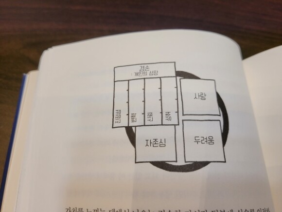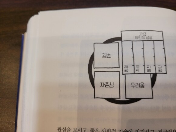 44p. 우리 마음은 이 네가지로 구성되어 있다. - 용기 있는 겸손: 개인의 성장에 초점을 둔다. - 성장 중심의 사랑: 타인의 성장에 초점을 둔다. - 자아 중심의 자존심: 자기 과시에 초점을 둔다. - 자기 제한적 두려움: 자기 보호에 초점을 둔다.