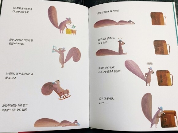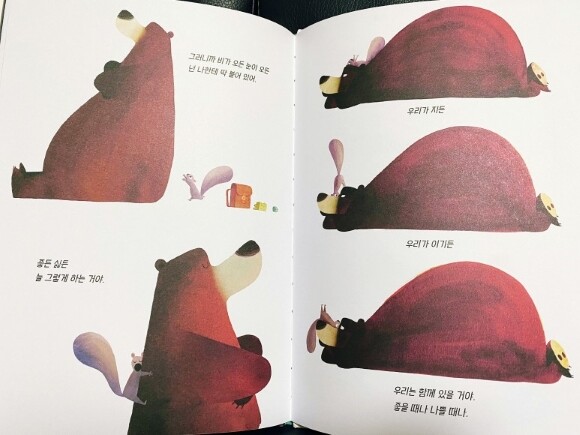 매일 같은 일상에~ 어쩌면 더 불편함을 느끼고 툴툴거리지 않았나 하는 반성을 하게 되었어요. 그림책 읽어주다 보면 ㅎㅎ 제가 더 반성하는 시간이 됩니다!!! 우리 곁에 있는 소중한 가족, 친구, 나를 중심으로 연관된 좋은 사람들. 익숙함보다는 소중함을 더 알고, 다람쥐와 곰이 떼려야 뗄 수 없는 관계처럼..