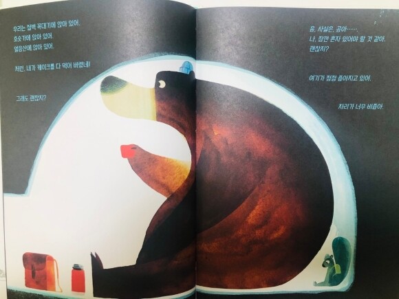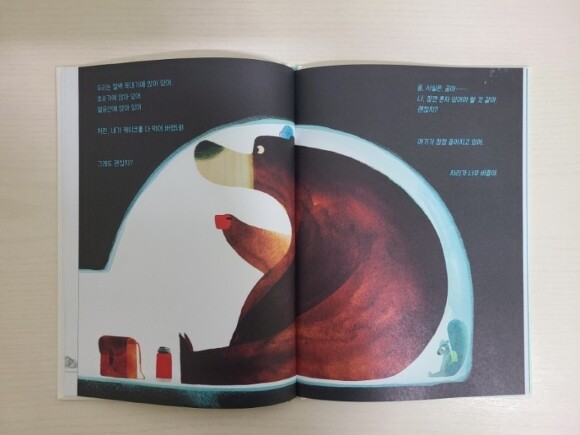 이 책에서 계속 나와 네가 잘 맞다고 강조하는 걸 보면 실제로는 그렇지 않다는 말이다. 곰은 너무 큰 몸을 갖고 있고 쥐는 너무나 작다. 그러니 잘 맞지 않는다. 그래서 인지 둘은 계속 강조한다. 우리는 잘 맞다고 그리고 네가 있어야 한다고 말이다.