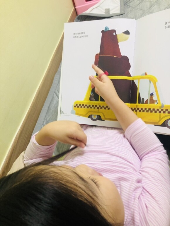 문장 하나하나 읽어주는데~ 정말 사랑하는 친구, 가족이구나 생각이 들었어요. 택시 위로 삐쭉 올라온 덩치 큰 곰의 모습을 보며~ 깔깔깔 웃기도 하고, 너무 작은 다람쥐는 어디 있냐며 찾기도 하고요. 따스한 내용을 읽어주다 보니~ 더 많은 사랑을 해줘야겠다 생각이 들었어요.