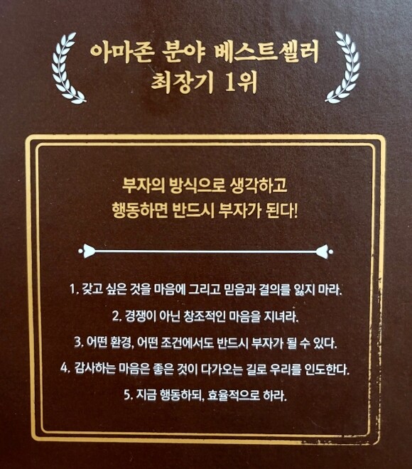 마지막으로, 이 책 초반에 가장 인상깊었던 구절. "살아 있는 모든 생명체는 성장하고 발전하기 위해 존재하고, 계발할 수 있는 모든 면을 최대한으로 계발할 양도 불가의 권리가 있다. 살아갈 권리가 있다는 말은 인간에게 몸과 마음과 영혼이 성장하는 데 필요한 모든 것을 뜻대로 사용할 권리가 있다는 의미이고, 이는 곧 부자가 될 권리가 있다는 뜻이다."