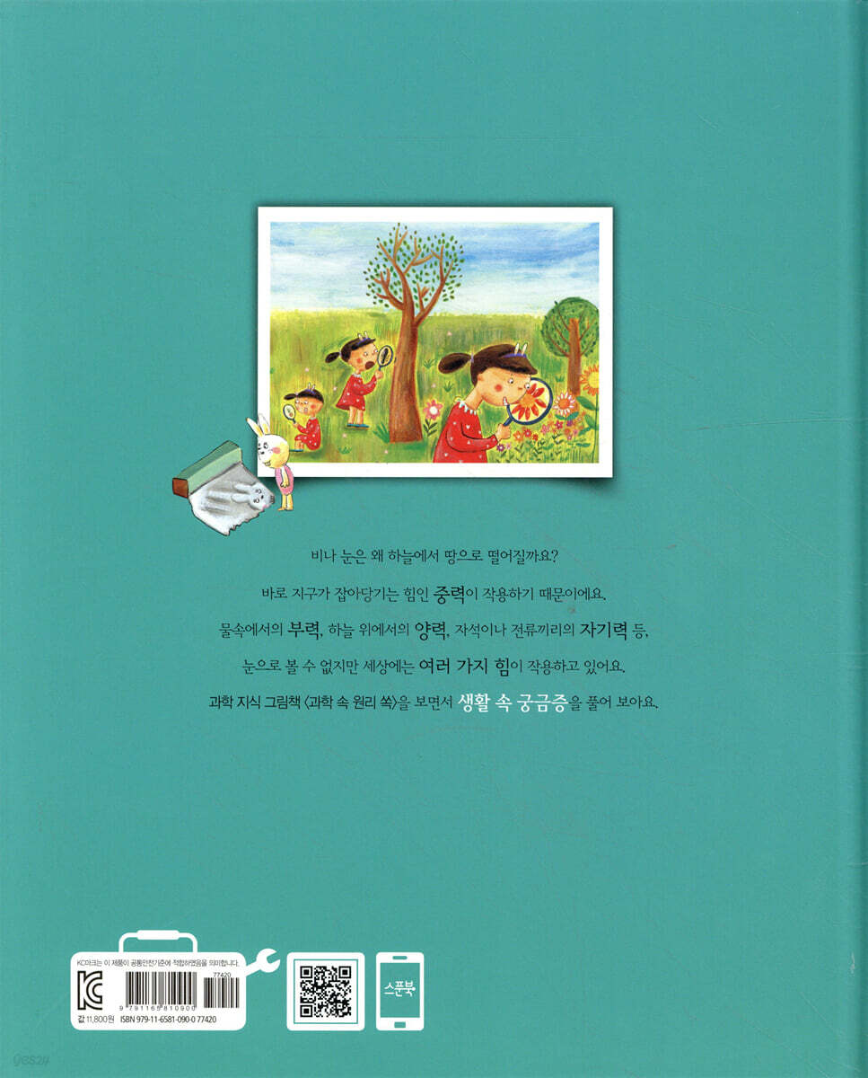 《빛의 요정을 본 적이 있나요?》는 일곱 살 ‘거울 공주’ 도희가 일상생활에서 유용하게 쓰이는 거울과 렌즈의 성질을 하나씩 깨우쳐 가는 과정을 흥미롭게 그린 과학 지식 그림책이에요. 멋 내기를 좋아하는 도희는 ‘거울 공주’예요. 시시때때로 거울을 들여다보아서 엄마 아빠가 지어 준 별명이지요. 오랫동안 거울을 바라보던 도희는 문득 뭔가가 궁금해졌어요. 거울 속의 나는 왜 왼쪽과 오른쪽이 뒤바뀌어 보일까? 숟가락 안쪽과 바깥쪽으로 비춰 본 내 모습은 왜 다를까? 대형 마트 한쪽 구석에는 왜 볼록 거울이 설치되어 있는 걸까? 현미경 속에는 왜 오목 거울이 들어 있을까? 안경알도 거울처럼 오목하거나 볼록할까? 볼록 렌즈와 오목 렌즈는 어떻게 다를까? 이렇게 도희의 질문은 꼬리에 꼬리를 물고 이어집니다. 도희는 직접 거울과 렌즈를 관찰하고 체험해 보면서 스스로 해답을 찾아갑니다. 옆에서 엄마 아빠가 과학적 원리를 덧붙여 설명해 주니, 흔하디흔한 거울과 렌즈가 도희에겐 신기한 장난감이자 계속 알고 싶은 탐구 대상이 되지요. 아이들은 과학이 우리 생활과 아주 가깝고 또 재미있다는 것을 이 책을 통해 느끼게 될 거예요. 일러스트와 사진으로 한눈에 보는 비주얼 과학 이 책은 거울 공주 도희가 일상생활 속에서 거울과 렌즈를 관찰하고, 그 성질을 깨우쳐 가는 과정을 아기자기한 일러스트로 묘사하고 있어요. 날마다 거울을 안 보는 사람은 거의 없을 거예요. 안경, 카메라 등에 쓰이는 렌즈도 우리에겐 없어서는 안 될 필수품이지요. 이 책을 보면 거울과 렌즈가 우리 일상 속에 깊숙이 들어와 있다는 것을 알 수 있어요. 또 그것에 어떤 성질이 깃들어 있기에 우리에게 유용하게 쓰이는지 그림으로 확인할 수 있답니다. 더 자세한 지식을 알려 주는 정보 박스에는 만화 일러스트와 세밀화 등을 함께 곁들여서 정보가 한눈에 쏙쏙 들어온답니다. 초등《과학》교과서의 개념과 원리도 알기 쉽게 쏙쏙! 이 그림책을 읽어 두면 초등학교 과학 공부가 어렵지 않고 즐거워져요. 초등《과학》교과서에서 다루는 주요 개념과 원리를 알기 쉽게 잘 설명해 주니까요. 실제로 초등학교 과학 시간에는 ‘그림자와 거울’, ‘빛과 렌즈’ 등을 배우는데, 이 책을 읽고 나면 나중에 아이가 학교 공부를 따라가는 데에도 큰 도움이 될 거예요. 이 책의 부록 《미리 보는 교과서》 코너에서는 초등 교과서에서 다루는 과학 지식을 미리 알려 주고, 《재미있는 과학 이야기》 코너에서는 예비 초등생 및 저학년 아이들의 호기심을 불러일으키는 과학 이야기가 가득 담겨 있어요. 또 이 책의 핵심 내용을 한 번 더 되짚어 주는 ‘재미있는 만화’도 실려 있어 아이들의 ‘스스로 학습’을 도와줄 거예요. 귀로 들으면서 즐길 수 있는 ‘오디오북 서비스’ 제공! 이 그림책은 오디오북도 함께 즐길 수 있어요. 이 책의 앞 면지에 실려 있는 QR 코드를 스마트폰으로 스캔하면 오디오북 서비스를 바로 이용할 수 있어요. 부모님이 아이를 깨우거나 재울 때, 또는 장거리 여행 시 차 안에서도 책과 스마트폰만 있으면 언제든지 신기하고 흥미로운 과학의 세계에 풍덩 빠져 마음껏 놀 수 있어요. 아이들이 일상에서 습관처럼 늘 오디오북을 듣다 보면 과학이 좀 더 재미있고 친근하게 느껴질 거예요. 「과학 속 원리 쏙」은 6, 7세 유아부터 초등 저학년까지 읽을 수 있는 과학 지식 그림책 시리즈예요. 이야기를 재미있게 읽다 보면 저절로 과학의 원리와 개념을 깨우칠 수 있답니다. 생물, 환경, 인체, 물리, 화학, 지구과학, 응용과학 등 7개 영역의 지식을 폭넓게 담아 아이들의 호기심을 자극하고 창의적 사고력을 쑥쑥 키워 줄 거예요. * 누리과정 교과 연계 환경과 생활 - 빛과 우리 생활 지구와 환경 - 우리가 사는 지구 * 초등 교과 연계 4학년 2학기 『과학』 3. 그림자와 거울 6학년 1학기 『과학』 5. 빛과 렌즈 |