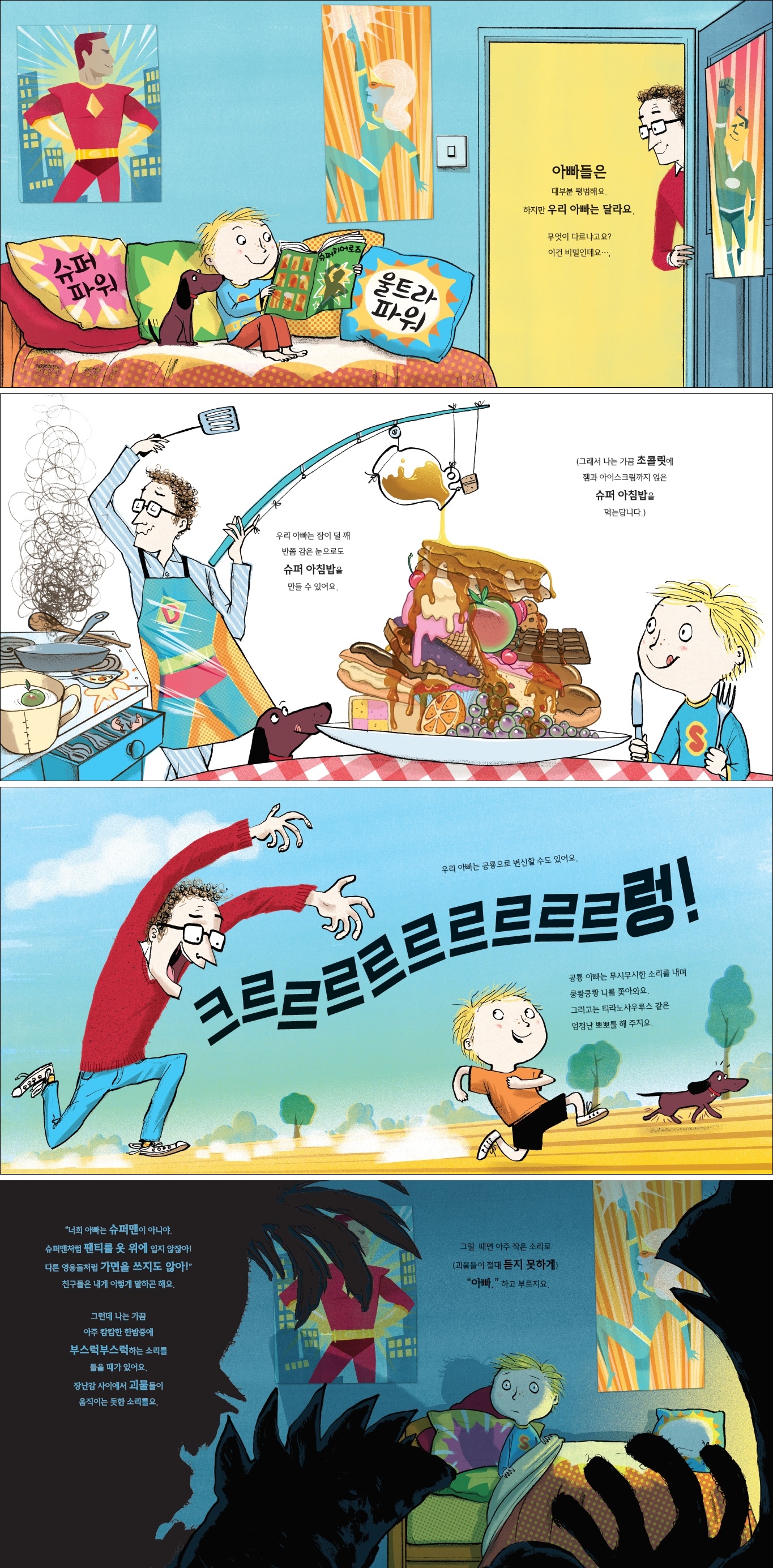 주인공 아이는 아빠의 능력을 열거하며 마치 슈퍼맨 같다고 자랑스레 말하지만, 사실 어른들이 보기엔 아빠의 행동 하나하나가 대단하기는커녕 오히려 엉성해 보이기만 합니다. 하지만 아이의 눈에는 심지어 아빠의 코 고는 소리나, 강아지 점보를 번쩍 들어올리는 모습도 멋지기만 합니다.
