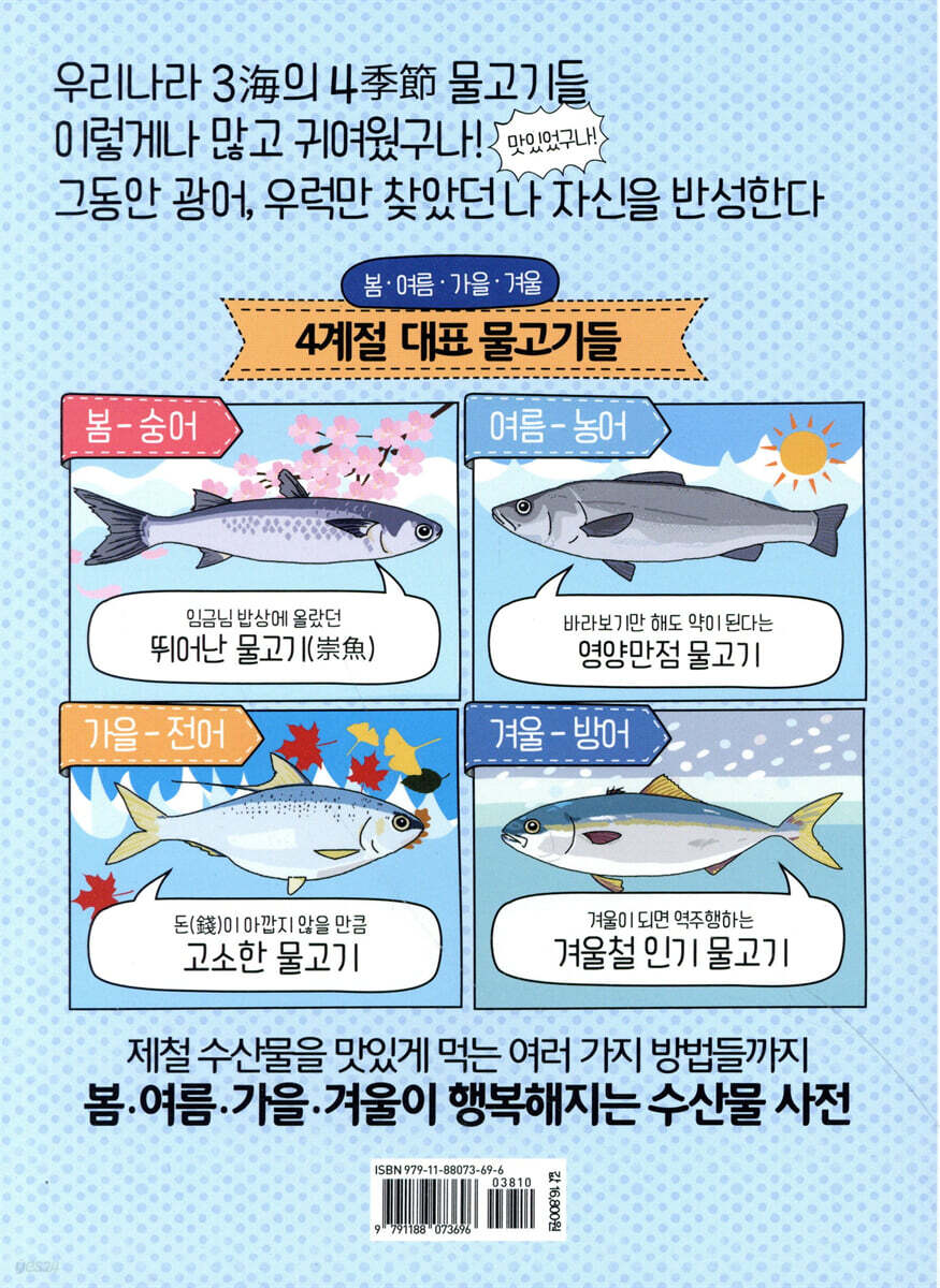 어류는 언제 가장 맛이 좋을까? CHAPTER 1. 봄의 바다 꽃게 대게 도미의 세계 멍게 숭어 임연수어 주꾸미 쥐노래미 학공치 홍어 CHAPTER 2. 여름의 바다 농어 다금바리 도다리의 세계 민어 병어 성게 오징어의 세계 장어의 세계 CHAPTER 3. 가을의 바다 갈치 개복치 고등어 꽁치 낙지 말쥐치 망둥어 삼치 전복 전어 CHAPTER 4. 겨울의 바다 굴 넙치 눈볼대 도루묵 명태의 세계 문어 방어 복어 새우의 세계 아귀 전갱이 조개의 세계 조피볼락 청어 CHAPTER 5. 더 넓은 바다 고래 바닷가재 연어 참치 철갑상어 킹크랩 감수자의 글 참고문헌 |