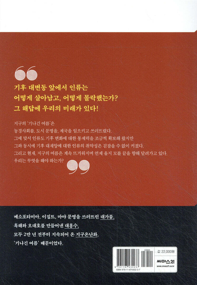 책머리에 ㆍ 적응과 실패의 도돌이표 01. 강물은 결코 복종하지 않는다 펌프와 컨베이어 벨트 02. 마지막 빙하기의 혹독한 세계 / 기원전 18000~기원전 13500년 03. 대온난화, 신대륙의 문을 열다 / 기원전 15000~기원전 11000년 04. 열기를 품은 컨베이어 벨트의 세계 일주 / 기원전 15000~기원전 11000년 05. 천 년의 추위, 천 년의 가뭄 / 기원전 11000~기원전 10000년 수백 년의 여름 06. 흑해에 잠겨버린 거대한 오아시스 / 기원전 10000~기원전 4000년 07. 도시와 문명의 실질적 지배자 / 기원전 6200~기원전 1900년 08. 사하라의 소 / 기원전 6000~기원전 3100년 행운과 불행의 차이 09. 엘니뇨, 대기와 대양의 춤 / 기원전 2200~기원전 1200년 10. 화산 폭발과 마른 안개 / 기원전 1200~기원후 900년 11. 모두가 한배에 탄 운명임을 깨닫다 / 1~1200년 12. 취약성의 문턱을 넘어버린 결과 / 1~1200년 마치며 ㆍ 불안한 지구의 여름 / 1200년~현대 주 찾아보기 |