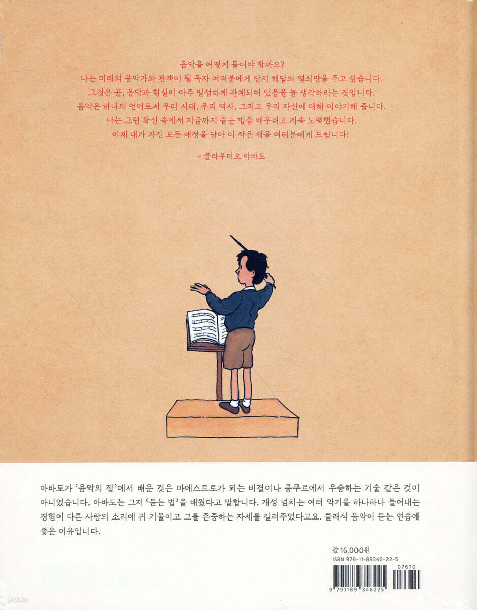 --- p.6 일곱 살이 되었을 때, 밀라노 스칼라 극장에 처음 갔어요. 그때 내 자리는 극장 천장에 가장 가까운 곳이었어요. 그 높은 곳에서 객석 난간에 다가가니까, 저 아래 멀리 있는 수많은 음악가들이 자그맣게 보였어요. 꿈에 나타났던 많은 꼬마 음악가들처럼요! 그리고 그들 앞에는 자신의 조그마한 손가락을 움직이며 놀라운 소리를 솟아나게 하는 한 사람이 서 있었어요. --- p.10 아빠가 일러주신 음악의 비밀 가운데 나를 그때부터 늘 놀랍게 했던 가장 중요한 비밀이 하나 있어요. 연주할 줄 안다고 해서 음악을 들을 줄도 아는 것은 아니라는 사실이에요. 그러니까 다른 사람과 함께 연주한다는 것은 악기를 그냥 연주하는 게 아니라 상대방의 연주를 주의 깊게 듣고, 받아들이고, 가장 신비한 부분까지 이해하려고 하는 것을 뜻한다고 아빠는 가르쳐 주셨지요. 음악에서와 마찬가지로 인생을 살아갈 때도 다른 사람을 이해하려면 그들의 말을 꼭 들을 줄 알아야 해요. 지금도 나는 오케스트라와 함께, 성악가 혹은 솔리스트와 협연을 해야 할 때 아빠가 일러주신 소중한 가르침을 기억합니다. --- p.14 어떻게 음악을 들어야 할까요? 나는 미래의 음악가와 관객이 될 독자 여러분에게 단지 해답의 열쇠만을 주고 싶습니다. 그것은 곧, 음악과 현실이 아주 밀접하게 관계가 있음을 늘 생각하라는 것입니다. 왜냐하면 모든 음악은 바로 그 시대를 반영하고 묘사하기 때문입니다. --- p.43 |