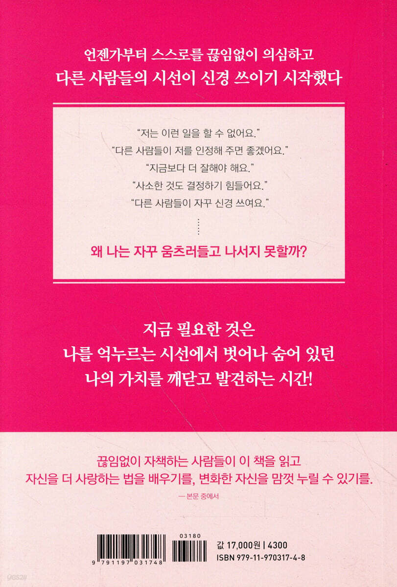 자신감이 없는 이들은 이런 일을 자주 겪는다. 그들은 필요하고 원하는 것을 과감하게 요청하지 않는다. 이는 몇 가지 선입견 때문이다. ‘관심을 끌면 안 돼.’, ‘그것은 다른 사람을 귀찮게 하는 거야.’, ‘그 사람은 내가 필요한 게 뭔지 알 거야.’, ‘부탁할 필요 없어. 어차피 거절당할 테니까.’ ---pp.27,28 자신감이 부족하면 끊임없이 다른 사람들과 자신을 비교한다. 아멜리는 가장 친한 친구 줄리아에게 “너 프랑스어 시험 100점 만점에 90점 받았지. 나는 88점밖에 못 받았는데.”라고 말했다. 가장 친한 친구이지만 더 좋은 점수를 받았기에 강한 질투심을 느낀다. 이런 이들은 우울감에 집중한 나머지, 친구들에게 더 이상 관심을 보이지 않을 수도 있다. 친구들은 무시당했다고 느끼고 ‘진짜 자기중심적인 사람’이라고 생각하며 결국 거리감을 둔다. 하지만 자신감을 회복한다면 다른 사람들과 비교할 필요도, 좋은 기분을 느끼려고 내가 더 낫다고 느낄 필요도 없다. 타인을 비교 대상으로 삼는 소유적 관계에서 있는 그대로를 인정하는 자유로운 관계로 넘어가는 것이다. ---p.45 ‘자기 부인’ 행동을 하기로 결심할 수 있다 ---p.다른 사람들이 원하는 대로 행동한다. 다른 사람들의 마음에 들고 싶어서 그들이 보고 싶어 하는 영화를 보러 가고, 그들이 가고 싶어 하는 식당에 가며, 그들이 고른 휴가지로 휴가를 간다. 이런 사람들의 최우선 과제는 타인과 갈등을 빚지 않는 것이며, 거부당하지 않기 위해 그 사람의 심기를 거스르지 않는 것이다. 그리하여 “다른 사람들에게 동의하면 그들도 나를 거부하지 않고 받아 줄 거야.”라고 생각하며 안심한다. ---pp.95,96 모든 문제는 결정하는 데 있는 것이 아니라 오히려 결정하지 않는다는 데 있다. 어쩌면 이렇게 말할지도 모른다. “아무 결정도 하지 않으면 가만히 있을 수 있어요!” 물론 그렇긴 하지만 결정을 내리지 않는다고 해서 결정을 내린다는 생각 자체를 버려서는 안 된다. 그렇게 되면 미루자는 생각만 가득찰 것이다. 오늘 결정할 일을 끊임없이 내일로 미룬다. 결정하지 않겠다는 것도 결정이다. 결정하지 않겠다는 것은 하지 않겠다는 결정이며 부정적인 결과를 초래할 수 있다. 결정을 못해 미루는 사람은 인생에서 성장하기 힘들다. ---p.135 에마뉘엘에게 긍정적인 말을 해 주는 사빈을 중간에 멈추게 하느라 애를 먹었다. 사빈은 에마뉘엘에게 얼마나 좋은 친구일 수 있는지는 알았지만 자기 자신에게 얼마나 끔찍한 적군일 수 있는지는 알지 못했다. 하지만 두 상황은 정말 똑같았다. 나는 사빈에게 이렇게 조언했다. “친구에게는 마음을 진정할 수 있는 환경을 만들어 주었지만 정작 자기 자신에게는 그러지 않았어요. 에마뉘엘에게 그랬듯이 앞으로는 스스로에게 건설적인 말을 하면 어떨까요?” ---p.186 제일 처음 할 행동의 선택 기준은 이것이다. 첫째, 감당할 수 있는 난이도여야 한다. 둘째, 조만간 실현할 수 있는 행동이어야 한다. 셋째, 운동, 취미, 다른 사람 돕기처럼 가능하면 좋아하거나 잘하는 분야를 선택해야 한다. 넷째, 쉽게 반복할 수 있는 행동을 선택해야 한다. 특히 자신이 잘하는 전문 분야를 활용하는 것이 좋다. 아무리 자신감이 부족한 사람이라도 저마다 유능하거나 우수한 분야가 있다. 화술일 수도 있고, 따뜻한 정, 미소, 요리, 낚시, 운동일 수도 있다. 주변에서 나에 관해 하는 말을 잘 들어 보자. “아, 피에르는 역사라면 모르는 게 없지!”, “컴퓨터 수리는 아르튀르한테 부탁하면 돼!”, “즐거운 시간을 보내고 싶다면 루이랑 같이 바다 낚시를 해 봐!”, “다른 사람이랑 운동하고 싶으면 장한테 부탁해 봐! 장은 운동을 좋아하고 잘하거든.” 친구들에게 물어봐도 괜찮으니 자신이 잘하는 분야를 반드시 찾아보자. ---p.232 회의 도중에 동료들 앞에서 내 실적이 나쁘다고 고함을 치며 질책하는 상사가 여기에 해당될 수 있다. 그때는 이렇게 대답해 보자. “제 업무나 제게 부족한 점에 대해서 이야기하는 것은 좋습니다(내용은 인정). 하지만 제 동료들 앞에서 고함을 치면서 말씀하시지는 않았으면 합니다(형식은 거부하기).” 여기서 기억할 것은 내 행동에 대한 지적을 경청하는 것은 유익하지만 다른 사람이 내 자아를 지적하게 해서는 안 된다. 타인은 의식적이든 무의식적이든 나의 내면과 안정을 문제 삼을 수 있다. 심한 경우에는, 앞과 같이 대답해도 폭력적인 위협이 지속된다. 이때는 자리를 피하는 편이 낫다. 최후의 방책은 스스로를 보호하는 것이어야 한다. 타인의 도움을 받더라도 자신의 이익은 스스로 책임지고 지키는 것이 중요하다. ---p.263 |