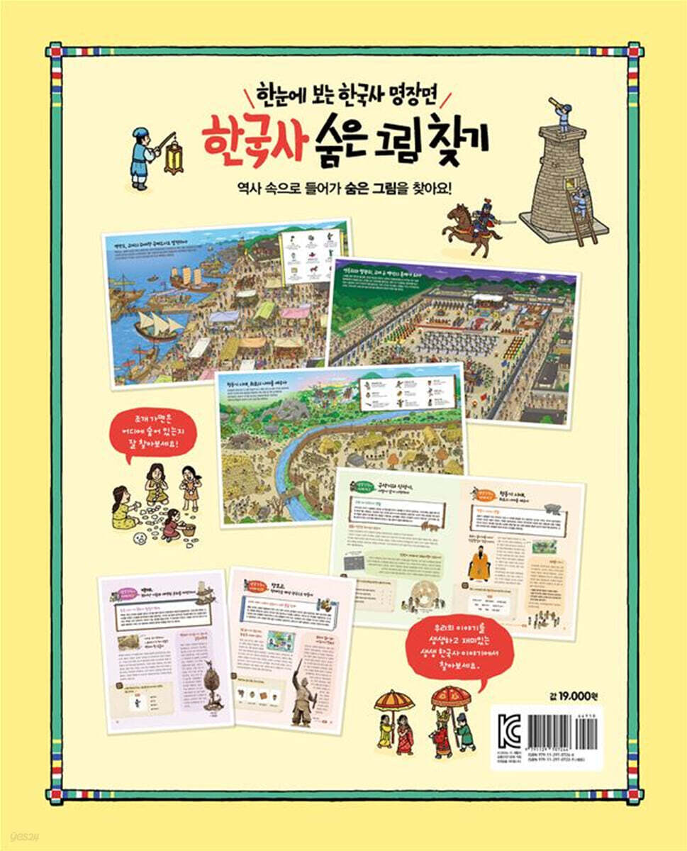 역사적 장면을 담은 일러스트 속 숨은 그림을 찾다보면 자연스럽게 한국사 지식도 얻을 수 있어요. 1. 장면 설명을 읽고 숨은 그림 찾기! 그림에서 표현하고 있는 역사적 사건이나 시대의 설명이 수록되어 있어요. 제목과 함께 글을 먼저 읽어요. 당시 사람들의 생활 모습과 문화, 사건의 배경 등을 알 수 있어요. 그런 다음 그림을 살펴보면 좀 더 그림이 눈에 잘 들어오고, 보다 쉽게 이해할 수 있어요. 또, 그림 속에는 유적이나 유물, 또는 역사적 인물이 숨어 있어요. 당시 모습이 생생하게 담긴 장면 속에서 숨어 있는 그림을 찾으며 재미있게 한국사 공부를 할 수 있어요. 2. 생생 한국사 이야기 읽고 한국사 지식 쌓기! 각 장면의 시대적 배경에 대한 설명이에요. 앞에서 읽은 내용보다 조금 더 넓고 자세한 역사 정보를 알 수 있어요. 시대의 중요한 인물, 유물이나 유적과 관련된 재미있는 이야기를 어린이의 눈높이에 맞춰 풀어냈어요. 또 정답 코너를 통해 숨어 있는 그림들을 잘 찾았는지 확인할 수 있어요. 3. 자유롭게 이야기하며 상상력 키우기! 원하는 장면을 펼친 다음 어떤 일이 일어나고 있는지 친구나 부모님과 이야기를 나누어 보세요. 그림의 다양한 요소를 활용해 상상력을 발휘하여 새로운 이야기를 꾸며 볼 수 있어요. 그림 속 장면들로 여러 번 이야기를 짓다 보면 그림을 볼 때마다 새로운 광경이 눈에 들어올 거예요. |