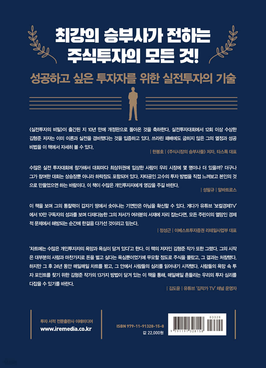 2021년 최신 개정판 수록실전수익률대회 12회 수상자의 생생한 투자 기록· 2018년 KB증권 실전투자대회 1억리그 2위(수익률 330%)· 2017년 키움증권 실전투자대회 3천리그 1위(수익률 150%)· 2016년 미래에셋 실전투자대회 1억리그 1위(수익률 173%)· 2014년 키움증권 실전투자대회 3천클럽 3위(수익률 113%)· 2011년 미레에셋 실전투자대회 1위(수익률 295%)· 2010년 키움증권 실전투자대회 3천리그 3위(수익률 140%)· 2010년 미래에셋 실전투자대회 1천리그 3위(수익률 190%)· 2009년 키움증권 실전투자대회 300리그 1위(수익률 429%)· 2009년 미래에셋 실전투자대회 2천리그 우수상(수익률 170%)· 2008년 CJ투자증권 실전투자대회 청군리그 2위(수익률 338%)· 2007년 CJ투자증권 실전투자대회 2위(수익률 728%)· 2006년 CJ투자증권 실전투자대회 3위(수익률 300%)코로나19로 인한 팬데믹 이후로 한국 증시는 가장 뜨거운 시기를 지나고 있다. 요즘 들어 투자의 고수들이 쓴 책이 많이 출간되고 있는데, 진정한 트레이더는 오직 실력과 실적만으로 말할 수 있다. 이 책은 2009년 키움증권 왕중왕전 실전투자대회에서 수익률 429%로 1위를 비롯하여 2011년과 2016년 미래에셋증권 실전투자대회 1위, 2017년 키움증권 실전투자대회 1위를 포함해 총 4회의 1위 수상, 그리고 각종 수익률대회에서 총 12회 이상 수상한 저자가 자신의 생생한 경험담과 매매 툴을 그대로 드러낸 투자서다. 특히 약 10만 명의 구독자를 보유한 ‘보컬경제TV’의 저자의 《실전투자의 비밀》이 10년 만에 개정판으로 돌아왔다. 이 책이 절판되었던 시기에 중고 시장에서 7만 원 이상의 가격에 거래될 정도로 대단한 인기를 자랑했다. 왜 여전히 그의 책은 인기 있는 것일까?실전투자대회 우승할 때 사용했던 13가지 매매 기법 최초 공개!실전투자대회에서 12회 이상 수상한 저자는 이미 이론과 실전을 겸비했다는 것을 입증하고 있다. 장세의 도움으로, 또는 우연히 자신의 기법이 잘 먹히는 시장 상황의 도움으로 한 번쯤 우승할 수 있다. 하지만 몇백 퍼센트의 수익률을 꾸준히 기록하며 계속해서 수상했다는 것은 객관적으로 그 실력을 인정받을 만하다고 할 수 있다. 투자대회 성적뿐 아니라 저자는 자신의 본 계좌에서도 2005년 이후 월간 수익률이 마이너스를 기록한 적이 한 번밖에 없다는 사실에 자부심을 느끼고 있다. 상승장뿐 아니라 2008년 세계적인 폭락장에서도 매월 꾸준히 수익을 쌓아온 것이다.장세에 흔들리지 않으며 지속적으로 수익을 낼 수 있는 저자만의 독창적인 시장관과 실전 수익률대회 우승에 실제 사용했던 매매 기법을 이 책에 자세히 소개했다. 특히 개정판에서는 새롭게 정리한 13가지 매매 기법을 볼 수 있다. 또한 어떤 흐름 속에서 기법이 탄생했는지 시장 이면의 심리는 무엇인지를 세세히 밝힘으로써, 투자자들이 애타게 찾던 성공의 비밀 열쇠를 내놓았다.최강의 승부사가 전하는 주식투자의 모든 것!평범한 직장인이었던 저자는 코스닥 열풍이 불던 1999년, 6개월 만에 1,000퍼센트라는 수익률을 거둔 뒤 겁도 없이 전업투자에 뛰어들었다. 하지만 코스닥이 붕괴됨과 함께 첫 번째 깡통을 찼으며, 이후에도 아무런 기초 없이 주식시장을 상대로 싸우다가 인생의 밑바닥까지 떨어지는 절망적인 시간을 5년이나 보내야 했다. 저자는 자신의 경험을 이 책에 무척 상세하고도 진솔하게 담았다. 주식 시장에 들어오면 누구나 빠질 수밖에 없는 함정을 경계하며 독자들에게 상기시켜준다.뼈아픈 고통과 시행착오를 겪으면서도 ‘여기서 살아남지 못하면 갈 곳이 없다’는 절박한 마음으로 포기하지 않았던 저자는, 배우고 연구하고 자신의 매매를 복기하면서 시장에 대한 통찰력을 쌓아왔다. 그렇게 그는 수백억 원의 자산을 이루었다. 그에게는 무엇을 어떻게 하라거나, 무엇은 절대 하면 안 된다고 가르쳐주는 스승이 없었다. 오로지 스스로 경험을 통해 모든 것을 배우고 정립해야 했다.지금은 이론과 실전을 겸비한 공인된 고수이지만, 이 자리에 이르기까지 너무나도 한이 맺힌 뼈아픈 시간을 보내야 했다. 바로 그 때문에 주식시장에 들어서는 누구도 자신과 같은 불행한 시간을 겪지 않길 바라는 마음에 모든 것을 이 책에 공개했다.PART 1에서는 저자의 경험을 서술하면서 초보 투자자들이 빠지기 쉬운 함정에는 무엇이 있는지를 알려주고 있다. PART 2에서는 매매 전 갖춰야 할 핵심 분석 능력에 관하여 말하고 있다. 기술적 분석과 기본적 분석은 몰라도 문제지만 너무 많이 알려고 해도 도움이 되지 않는다는 것을 경험으로 터득한 그는 반드시 알아야 할 부분을 뽑아내 알기 쉽게 설명해주었다.PART 3에서는 현재 시장에 가장 잘 들어맞으며 앞으로도 지속해서 발전시켜갈 수 있는 핵심 기법 13가지를 공개하면 독자들이 실전 응용력을 높일 수 있도록 여타의 변수들을 명확히 제시했다. 그리고 PART 4에서는 개별 종목을 넘어 시장 이면에서 일어나는 여러 일이 주가에 영향을 미치는 사례들에 대해 살폈다.주린이뿐 아니라 시장 경험이 있는 투자자들 역시 그동안 열망해왔던 투자의 해법을 이 책에서 발견하게 될 것이다.