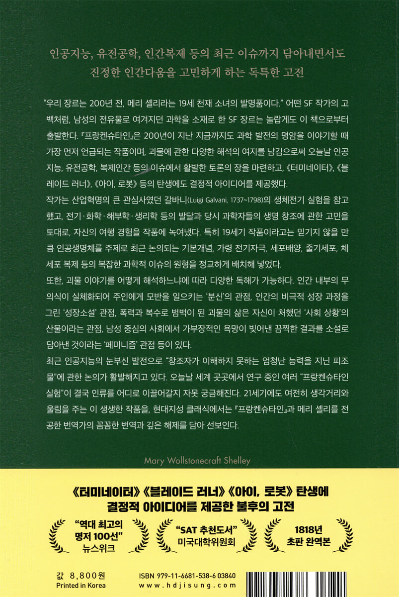 탐보라 화산 대분화 탓에 세계적으로 ‘여름이 사라진 해’로 유명했던 1816년, 연신 내리는 비와 추위로 나들이가 녹록지 않았던 어느 날, 시인 바이런(1788~1824)은 제네바 호숫가의 디오다티 별장에 모인 친구들에게 무서운 이야기를 하나씩 써보자는 흥미로운 제안을 한다. 메리 셸리는 당시 산업혁명의 주제였던 ‘과학적 에너지 활용’, 특히 갈바니의 생체전기 실험에 평소 큰 관심을 보였다. 바이런과 폴리도리 같은 쟁쟁한 ‘별장 친구들’의 천재적인 입담에 경쟁심이 더해, 메리는 며칠 동안 생생한 꿈을 꾸게 된다. 한 과학자가 우연히 시도한 전기 충격으로 시체를 살려내는 짤막한 내용이었다가 거듭되면서는 직접 생명을 만들어내는 끔찍한 악몽으로 디테일하게 확장되었다. 연인 퍼시 셸리(1792~1822)는 이 아이디어를 적극 격려하고 응원했고, 메리 셸리는 1년 정도의 집필 기간을 거쳐, 이전에는 전혀 듣도 보도 못한 새로운 형태의 소설을 탄생시킨다(집필 시작은 19세, 완성은 20세). 『프랑켄슈타인』 출간 후 50년 가까이 지나서야 쥘 베른의 『지구에서 달까지』(1865)가 나왔는데, 사람들은 그제야 비로소, 과학적 가설과 추론에 기초한 장르를 SF(Science Fiction, 1851년에 용어가 처음 등장)로 따로 부르기 시작한다. 그 시작이 되는 작품이 바로 『프랑켄슈타인』이다. 이 작품은 1910년 발명가 에디슨이 만든 초창기 영화(10분 분량의 최초의 공포영화)의 소재가 되었고, 1931년에는 유니버셜 스튜디오에서 동명의 영화(70분 분량)로 제작되어 대중의 뇌리에는 목에 철심을 꽂은 괴물 이미지로 각인된다. 과학 발전의 명암, 그 원형을 엿보다 소설의 배경은 북극이다. 19세기 사람들에게 북극은 오늘날 우주 공간이나 다름없이 미개척지였다. 프랑켄슈타인이라는 이름의 과학자가 시체를 조합해 소위 ‘인조인간’을 만든다는 이야기도 신을 벗어나 생명의 본질을 설명할 수 있다는 새로운 과학적 사고방식의 산물이다. 과학자가 인조인간을 만든 방법도 당시 최신 기술이었던 ‘전기’였다. 메리 셸리는 에라스무스 다윈의 생명체에 대한 가설과 개구리 뒷다리에 전극을 연결해 꿈틀거리게 만든 갈바니의 실험을 알고 있었고, 이를 자기 이야기 속에 집어넣었다. 메리 셸리는 이런 재료를 조합해 과학 발전의 성과를 드러내는 동시에 그 한계 역시 놓치지 않는다. 과학과 이성의 힘으로 만들어낸 새로운 생명체를 보고 당황해 달아나는 주인공의 모습은, 과학기술이 더욱 발전한 미래가 낙관적이지만은 않을 거라는 예감을 보여준다. 프랑켄슈타인은 생명을 탄생시킬 수 있었지만, 그 생명으로 무엇을 어떻게 해야 할지 전혀 몰랐다. 결국, 그는 자신이 창조해낸 피조물에게 가족과 친지와 연인을 잃고 자신도 죽음을 맞는다. 소설에 등장하는 ‘괴물’을 어떻게 해석하느냐에 따라 다양하고 풍성한 독서 경험이 가능하다. 과학자가 괴물을 만들고 그 결과 비참하게 전락해간다는 서사로 『프랑켄슈타인』을 설명하기에는 괴물의 말과 행동이 소설에서 차지하는 비중이 상당히 크기 때문이다. 낭만주의 시대라는 역사적 배경을 주목한 일반적인 해석에 따르면, 이 소설은 인간 내부에 억압되어 있던 무의식이 실체화되어 주인에게 모반을 일으키는 ‘분신’의 이야기를 다룬다고 본다. 결국, 주인공과 괴물은 한 몸에서 나온 두 개의 인격이라는 것이다. 또는 고독한 인간의 비극적 성장 과정을 그린 ‘어둠의 성장소설’로 읽을 수도 있다. 괴물은 내적으로는 순수하고 성장해가는 존재이지만, 사회가 용인하지 못하는 끔찍한 외양 탓에 끊임없이 소외당하고 배척받는다. 또는 당시 산업혁명의 여파로 ‘기계 파괴 운동’(러다이트 운동)이 확산하면서 폭력과 복수로 점철된 괴물의 사연 많은 삶 역시 그가 처한 사회 상황의 직접적 산물이라는 것이다. 그리고 남성 중심 사회에서 가부장적인 욕망이 빚어낸 끔찍한 결과를 소설로 담아낸 것이라는 ‘페미니즘’ 관점 등이 있다. 샬럿 브론테의 『제인 에어』에 숨겨진 주인공이 다락방의 미친 여자인 ‘버사’이듯, 일제 강점기 조선의 아나키스트를 다룬 영화 《박열》의 실제 주인공이 박열이 아니라 ‘후미코’이듯, 『프랑켄슈타인』 속 주인공의 이야기를 뚫고 나오는 소위 ‘괴물’의 이야기에는 제목이 내세우는 주인공을 뛰어넘는 긴박성과 절실함이 있다. 창조자가 통제하지 못하는 피조물의 탄생 부제 “현대판 프로메테우스”가 보여주듯 『프랑켄슈타인』은 현대적 신화나 책임에 대한 우화로 읽을 수 있다. 창조주(신)와 피조물(인간), 부모와 자식, 예술가와 예술 작품, 혹은 과학자와 발명 및 발견 간의 윤리적인 관계에 대한 문제 제기이기 때문이다. 특히 과학자가 자신의 결과물에 대한 책임과 의무를 저버린 탓에 끔찍한 사태가 벌어진다는 설정은 과학자의 사회적 책임을 묻는다는 점에서 시사하는 바가 크다. 오늘날 IT, 핵무기, 유전공학 등 새 기술에 수반되는 끊임없는 위협이 19세기 초에 쓰인 이 소설에 이미 원형으로 제시되어 있는 셈이다. 최근 인공지능의 눈부신 발전으로 “창조자가 이해하지 못하는 엄청난 능력을 지닌 피조물”에 관한