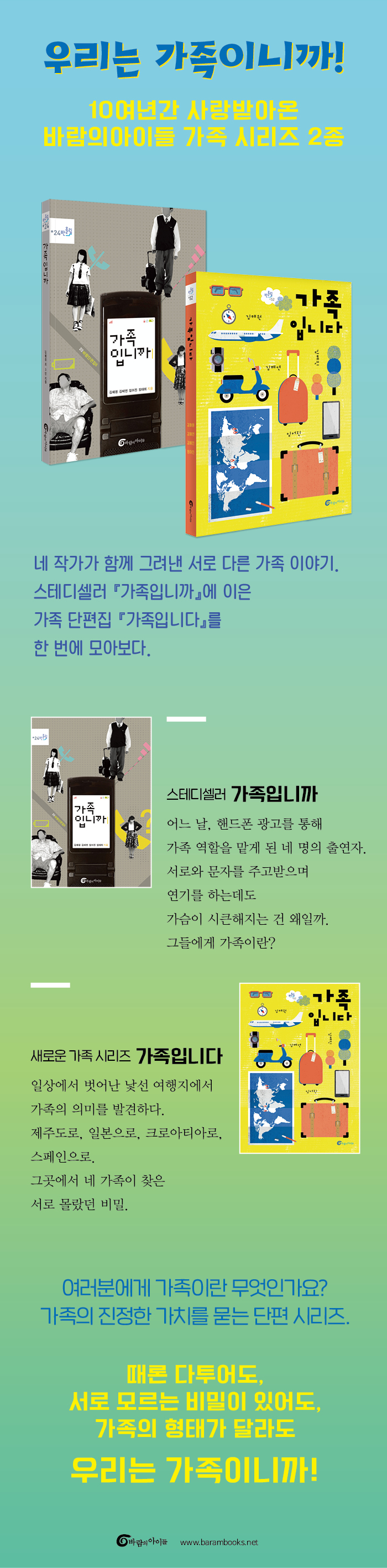 바람의아이들, 그 백 번째 책『가족입니까』 바람의아이들에서 첫 책을 냈거나 신인 시절을 함께 한 작가 네 사람(김해원, 김혜연, 임어진, 임태희)이 공동 작업으로 완성한『가족입니까』는‘가족’에 대한 진지한 질문을 던지는 한편, 문학이라는 가장 개인적인 작업도 다른 사람과 어울려 할 수 있다는 것을 보여준다는 점에서 가족에 대한 또 다른 통찰을 담고 있다. 가족이 뭐라고 생각해? 가족에 대해 대답한다는 것은 어려운 수학 방정식을 푸는 것보다도 까다로운 일이다. 어쨌거나 방정식에는 하나의 정답이 있지만 가족에 대해서는 답하는 사람에 따라 제각기 다른 대답이 나올 수 있으므로. 누군가에게는 따뜻하고 평화롭고 안전한 둥지인 가족이 누군가에게는 올가미나 족쇄, 심지어는 조폭처럼 여겨질 수도 있다. 그러니 가족에 대한 정의만큼 보편적인 설명이 불가능한 것이 또 있을까? 모든 사람은 자기 가족에 대해 이야기할 수 있을 뿐, 다른 이의 가족이나 불특정한 가족에 대해서는 말할 수 없다. 그럼에도 불구하고 우리가 가족에 대해서 물어야 하는 이유는 가장 유력한 정답을 고르기 위해서가 아니라 가족의 진짜 의미가 무엇인지 되새겨보기 위해서다. 더욱이 이제 막 가족이라는 울타리 근처 안과 밖 어딘가에서 서성이고 있을 청소년들에게 가족을 묻는 일은 더더욱 중요하다. 『가족입니까』는 네 명의 작가가 각기 다른 주인공을 내세워 쓴 작품집이지만, 이 주인공들은 서로 만나고 교류한다. 이들의 공통분모는 가족을 콘셉트로 한 핸드폰 광고의 모델들이라는 것. 광고 속에서 각각 엄마, 아빠, 아들, 딸을 연기하는 이들에게는 각자의 가족이 있고 각자의 문제가 있고 각자 걸어가야 할 길이 있다. 자신의 꿈인지 엄마의 꿈인지 모를 연예인이 되기 위해 이리저리 끌려 다니는 예린이, 딱히 큰 문제는 없지만 엄마와 자꾸만 어긋나는 재형이, 잘 나가는 독신여성으로 홀어머니와의 관계가 여의치 않은 안지나 팀장, 언제나 퇴근했을 때면 아내와 딸이 집에 있어주길 바라는 박동화 아저씨. 가족의 형태도 다르고 가족에 대해 기대하는 바도 다르지만 이들은 핸드폰 광고를 찍으며 새삼스럽게 묻게 된다. 가족이 뭐지? 가족에게 나는 뭐지? 가족에 관한 네 편의 이야기, 가족을 바라보는 수많은 시선 가족의 기대를 한 몸에 받고 있건 말썽만 안 피면 충분할 텐데 그걸 못해서 불화를 일으키건 십대 아이들에게 가족은 다소 거추장스러운 존재다. 예린이는 과욕에 불타는 엄마만큼이나 고분고분 희생을 감내하는 아빠와 남동생이 부담스럽고, 재형이 역시 자신의 진심을 몰라주는 엄마가 야속하고 사소한 오해 끝에 가출 아닌 가출을 감행하게 된다. 하지만 예린이가 홀로 의상 가방을 챙겨들고 거리로 나섰을 때, 재형이가 혼자 사는 생활을 꿈꾸며 이모네 집에서 살게 됐을 때, 아이들은 좀 더 거리를 두고 가족을 살피기 시작한다. 가족은 공기나 물처럼 결핍의 순간에만 존재감을 드러내는 것일까? 하지만 그보다는 이 아이들이 보다 넓은 시야를 갖게 되었다고 말하는 편이 옳을 것이다. 가족들과 함께 있을 때면 결코 볼 수 없었던 큰 그림을 볼 수 있으니까. 그리고 또 하나, 핸드폰 광고에 등장하는 이상적인 가짜 가족 또한 묘한 생기를 가져온 듯. 광고회사에 근무하는 39살 독신여성 안지나 팀장이나 1인 출판사를 운영하는 박동화 아저씨에게도 서로를 챙겨주는 광고 속 가족은 낯설고 어색하다. 하지만 광고를 찍는 동안 가족은 폭력이고 야만적이라고 생각하는 안지나 팀장도, 아내와 딸을 집에 딸린 부속물처럼 여기던 박동화 아저씨도, 자신을 돌아보고 차츰 잘못을 깨닫게 된다. 진짜를 이기는 가짜의 힘이랄까? 하지만 가족에 관한 한, 진짜와 가짜의 구분은 의미가 없다. 이들 아마추어 모델들이 광고를 찍다 울컥하는 것처럼 모범답안 같은 가족을 볼 때라도 우리가 떠올리는 건 결국 우리 자신의 가족이니까. 『가족입니까』에 실린 네 편의 소설은 핸드폰 광고를 중심으로 연결되어 있는 만큼 한 편의 소설로 읽어도 무방할 만큼 자연스럽게 서로를 넘나든다. 그런데 네 명의 작가가 쓴 작품들이 어떻게 충돌하지 않고 공존할 수 있었을까? 동일한 시공간 안에서 벌어지는 각기 다른 사건들을 다룬 옴니버스 작품들은 많지만, 이렇게 여러 작가가 공동 작업을 하는 경우는 흔치 않다. 각각의 작품 뒤에는‘작가의 말’이 붙어 있는데, 거기에는 이 공동 작업을 하느라 작가들이 거쳐 온 고난의 행군이 고스란히 담겨 있다. 보통 작가의 말처럼 어떻게 읽어주길 바란다는 당부의 말보다는 작업 과정을 들려주고 있어 작가 노트를 훔쳐보는 것 같은 색다른 재미를 느낄 수 있다. 2. 『가족입니다』 2010년 출간된 『가족입니까』, 그리고 10년 만에 찾아온 새로운 이야기 『가족입니다』 우리에게 가족이란 어떤 의미를 지닐까? 가족은 태어나서 처음으로 만나는 세계다. 엄마, 아빠, 형제자매, 조부모 등으로 확장되는 세계는 어린아이를 보호하고 돌봄을 제공하며 신체적 정신적 성장을 돕는다. 따라서 울타리이자 든든한 버팀목으로써 가족은 아이의 ‘생존템’에 가깝다. 아이가 가족으