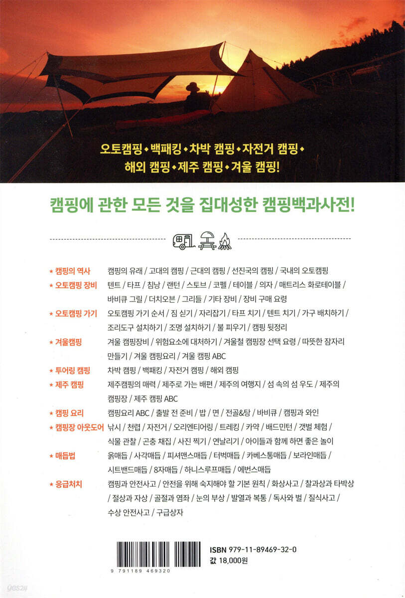 캠핑이란 캠핑의 유래 근대의 캠핑 고대의 캠핑 전쟁과 캠핑장비 오토캠핑의 등장 선진국의 오토캠핑 국내의 오토캠핑 캠핑은 ****이다 챕터2 오토캠핑 장비 텐트-텐트의 역사/텐트의 구성/텐트의 종류/텐트 구입 요령 타프-형태에 따른 구분/타프의 활용/타프 보조장비/타프 구입 요령 침낭-모양에 따른 분류/충전재에 따른 분류/침낭 보조장비/침낭 구입 요령 랜턴-랜턴의 역사/연료에 따른 분류/용도에 따른 분류 스토브-스토브의 역사/스토브의 연료/스토브 구입 요령 코펠-코펠의 구성/재질에 따른 분류 테이블-상판 재질에 따른 분류/테이블의 분류/테이블 구입 요령 키친 테이블-키친 테이블 구성 의자-모양에 따른 분류/기능과 재질에 따른 분류/의자 구입 요령 매트리스-매트리스의 종류 화로-재질과 모양에 따른 분류/부대장비/화로테이블과 구성 바비큐 그릴-바비큐 그릴의 종류/그릴 보조도구 더치오븐-더치오븐 주변 도구 그리들-그리들의 구성/그리들의 재질과 크기/그리들과 스킬렛/그리들을 이용한 요리 기타장비-아웃도어 나이프/야전침대/로프/카라비너/팩/해먹/망치/아이스박스/야전삽/톱/도끼/카고백/새면용품 가낭/진기 장판/모기퇴치용품/전기 릴선/멀티 콘센트/선풍기(서큘레이터)/바람막이/눈가리게&귀마개/라디오/호라라기/식기류/조리도구/양념통/물통/식기건조망/설거지통/쓰레기 분리 수거대/앞치마/집게/토스트기/수납용 박스/서바이벌 키트 장비 구입 요령과 구입 리스트 챕터3 오토캠핑 가기 오토캠핑 가기 순서 짐 싣기-자동차와 수납공간/외장형 캐리어/자동차에 짐 싣기 자리잡기-명당의 조건/캠핑장 아닌 곳에 자리 잡기 캠핑사이트 설계하기-헥사타프+텐트/스크린타프+텐트/사각타프+텐트/사각타프+리빙셸 일체형 텐트/다양한 사이트 구성 타프 치기-사각타프 치기/헥사타프 치기/사이드월 치기/타프 잘 치는 법 텐트 치기-일체형 텐트 치기/터널형 텐트 치기/캐빈형 텐트 치기/티피 텐트 치기/텐트 잘 치는 법/이너 텐트 꾸미기/사각침낭 이불 만들기 가구 배치하기-테이블 배치/콜맨 캡틴 체어 조립하기/야전침대 조립하기/키친 테이블 조립하기/키친 도구 /키친 배치/캠핑장 꾸미기/해먹 설치하기/사각타프 속 가구 배치 조리도구 설치하기-가솔린 스토브 설치하기/가스 스토브 설치하기/부탄가스 알뜰하게 쓰는 법 조명 설치하기-조명의 배치/랜턴을 이용한 날벌레 퇴치법/가솔린 랜턴의 구조/가솔린 랜턴 사용법/가스 랜턴 사용법 불 피우기-화로 설치하기/화로 테이블 설치하기/모닥불 피우기/브리케트 피우기 감성캠핑-감성캠핑 장비/캠핑장 에티켓 캠핑 뒷정리-마무리의 원칙/캠핑용품 관리와 보관 챕터4 겨울캠핑 겨울 캠핑장비-텐트/침낭/이너매트/에어박스/캠핑카&트레일러/난로/난로 사용 시 주의점/서큘레이터/스토브/핫팩 위험요소에 대처하기-눈/불/바람 겨울철 캠핑장 선택 요령 따뜻한 잠자리 만들기-바닥형 잠자리/침대형 잠자리 겨울 캠핑요리-탕&국/바비큐/간식/요리재료 준비/설거지/눈이나 얼음으로 식수 만들기/음식물 보관 겨울 캠핑 ABC 챕터5 투어링 캠핑 차박 캠핑-순수 차박 VS 텐트 차박/차박 캠핑장비/차박 캠핑 장소/차박 캠핑 시 주의점 백패킹-백패킹 VS 오토캠핑/백패킹 주요 장비/백팩 잘 꾸리는 법/백패킹 식량/백패킹 대상지/LNT와 백패킹 수칙 자전거 캠핑-일반 자전거 VS 여행용 자전거/자전거 캠핑용 수납 가방/자전거 여행 대상지/스텔스 캠핑 해외 캠핑-해외 캠핑 여행의 즐거움/ 해외 캠핑 대상지/해외 캠핑장비/캠핑투어의 꽃 캠핑카/캠핑카 종류/C클래스 캠핑카 구조와 편의장치/캠핑카 운전요령 챕터6 제주 캠핑 제주 캠핑의 매력 제주로 가는 배편 제주의 여행지 섬 속의 섬 우도 제주의 캠핑장-모구리킴핑장/돈내코야영장/이호테우해변/화순금모래해변캠핑장/서귀포자연휴양림/함덕서우봉해변야영장/관음사야영장/협재해수욕장 제주 사설 캠핑장-제주베이스캠프/돌하르방캠핑장/어라운드 폴리/휴림/귤빛/비체올린 제주 캠핑 ABC 챕터7 캠핑요리 캠핑요리 ABC 출발 전 준비 밥-밥짓기의 기술/밥의 응급처치/은행밤밥/콩나물밥/야채밥/카레밥/누룽지탕 면-닭칼국수/순두부라면/봉골레스파게티/비빔국수/라볶이/메밀국수 전골&탕-어묵탕/백숙/소고기버섯샤부샤부/부대찌개/콩나물모시조개탕/계란순두부탕 바비큐-바비큐 도구와 스타일/사전준비/꼬치구이/LA갈비구이/조개구이/닭구이/비어치킨/통삼겹살 훈제/전복 훈제/닭다리 훈제/오삼불고기/목살구이/양곱창구이 캠핑과 와인-캠핑과 와인의 궁합/캠핑용 와인은 따로 있다!/음식과 와인의 매치/화이트와인의 재발견/바비큐와 레드와인/파티는 석양에/와인을 빛나게 하는 것들 챕터8 캠핑장 아웃도어 낚시 천렵 자전거 오리엔티어링 트레킹 카약 배드민턴 갯벌 체험 식물 관찰 곤충 채집 사진 찍기 연날리기 아이와 함께 하면 좋은 놀이 챕터9 매듭법 옭매듭 사각매듭 피셔맨스매듭 터벅매듭 카베스통매듭 보라인매듭 시트밴드매듭 8자매듭 하니스루프매듭 에번스매듭 올바른 매듭의 활용 챕터10 응급처치 캠핑과 안전사고 안전을 위해 숙지해야 할 기본 원칙 화상사고 찰고상과 타박상 절상과 자상 골절