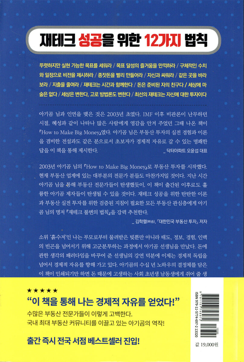 아기곰 님과 닥터아파트가 인연을 맺은 것은 14년 전인 2003년 초였다. IMF 이후 비관론이 난무하던 시절, 혜성과 같이 나타나 많은 사람에게 영감을 안겨 주었던 그 때 나온 책이 『How to Make Big Money』였다. 아기곰 님은 부동산 투자의 실전 경험과 이론을 겸비한 전설과도 같은 분으로서 초보자가 경제적 자유로 갈 수 있는 명쾌한 답을 이 책을 통해 제시한다. - 오윤섭 (닥터아파트 대표)