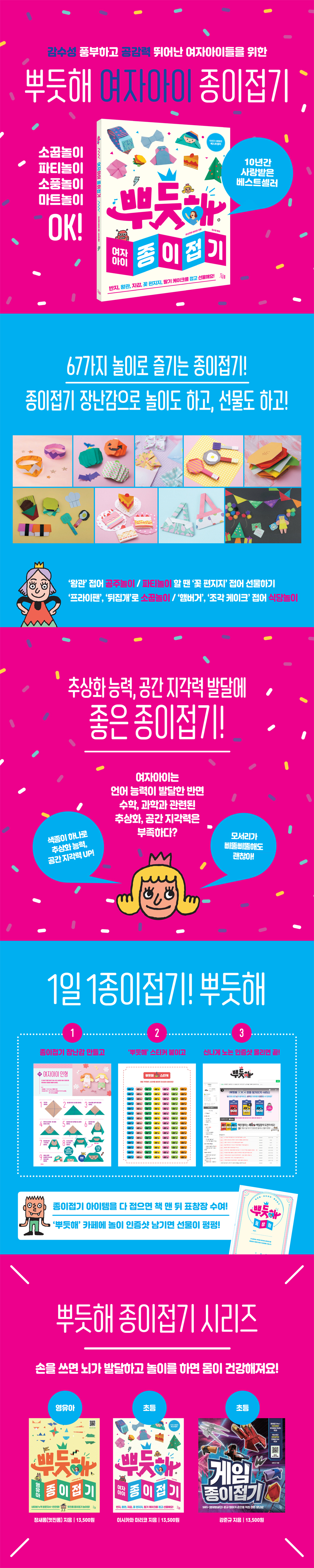 사랑스럽고 귀여운 아이템이 가득! 이 책은 2012년에 처음 출간되어 10년간 사랑받은 베스트셀러를 트렌드에 맞게 새로운 작품을 추가하고, 인기 있는 아이템만 엄선한 개정증보판이에요. 감수성 풍부하고, 공감력 뛰어난 여자아이들이 여러 가지 놀이와 함께 종이접기를 즐길 수 있도록 구성되어 있어요. 특히 여자아이들이 종이접기에 흥미를 가질 수 있도록 사랑스럽고 귀여운 아이템을 엄선했지요. ‘왕관’ 접고 공주 놀이, ‘햄버거’ 접고 식당 놀이! 종이접기 장난감으로 놀이도 하고, 선물도 하고! 아이들은 놀이를 통해 사회성을 발달시켜 나갈 수 있어요. 색종이로 만든 ‘왕관’으로 공주가 되고, 상상 속 친구를 만들어 대화도 해요. 친구와 파티 놀이를 하며 ‘꽃 편지지’에 말로 전하지 못했던 고마움을 담아 선물하고, ‘프라이팬’과 ‘뒤집개’를 접어 아빠와 소꿉놀이를 하며 반찬 투정했던 자신의 모습을 돌아보고 반성도 하겠죠? ‘햄버거’와 ‘감자튀김’을 접어 식당놀이를 하며 음식을 주문하는 연습도 해봐요. 소꿉놀이, 파티놀이, 소풍놀이, 마트놀이, 식당놀이 등 다양한 놀이를 할 수 있게 책 내용을 구성했어요. 책 내용을 쉽게 따라 할 수 있도록 상세한 설명과 함께 실제 접는 사진도 담았지요. 종이접기 아이템을 변형해서 새로운 종이 접기 장난감을 만드는 다양한 팁도 가득 담았으니 여자아이들이 무척 좋아할 거예요. 색종이 하나로 추상화 능력, 공간 지각력 UP! 모서리가 삐뚤삐뚤해도 괜찮아! 아이를 키우다 보면 여자아이와 남자아이의 행동과 능력에 차이가 있다는 사실을 발견하게 되지요. 여자아이는 언어 능력이 뛰어난 반면 사물의 주요 특징을 표현하는 추상화 능력은 다소 떨어진다는 연구 결과도 있어요. 종이접기는 손으로 만지고 머릿속으로 다양한 모양을 상상하며 만들기 때문에 추상화 능력은 물론 공간 지각력도 키울 수 있지요. 이 책은 쉬운 종이접기부터 어려운 종이접기까지 3단계로 난이도를 구분했어요. 종이접기를 하면서 어떻게 접어야 하는지 고민도 하고 시행착오도 겪을 수 있어요. 모서리가 튀어나오고, 가위로 자른 모습이 삐뚤삐뚤하다고 속상해 한다면 괜찮다고 말해 주세요. 아이가 다양한 상상력을 발휘하여 종이접기를 하고, 그 과정을 즐길 수 있도록 응원하고 지켜봐 주세요. 1일 1 종이접기! ‘뿌듯해’ 스티커 붙이고 성취감 뿜뿜! 신나게 놀고, 놀이 인증샷 남기면 추억 만들기 OK! 색종이는 가격도 저렴하고, 언제 어디서나 10분이면 나만의 장난감을 뚝딱 만들 수 있으니 정말 훌륭한 놀잇감이랍니다. 아이가 스스로 놀잇감을 만들면서 창의력과 자신감도 함께 키울 수 있지요. 여기에 추가로 아이가 종이접기를 완성할 때마다 ‘뿌듯해’ 스티커를 붙여 성취감을 확인할 수 있도록 도와주세요. 이 책에 나온 종이접기 아이템을 다 접으며 책 맨 뒤에 있는 표창장도 주시고요. ‘뿌듯해 카페’에 기발한 놀이 인증샷을 올리면 선물을 받는 ON/OFF 시스템도 준비했어요. 다른 친구들은 종이접기 장난감으로 어떻게 노는지 엿볼 수 있지요. 아이들에게 멋진 추억이 될 거예요. |