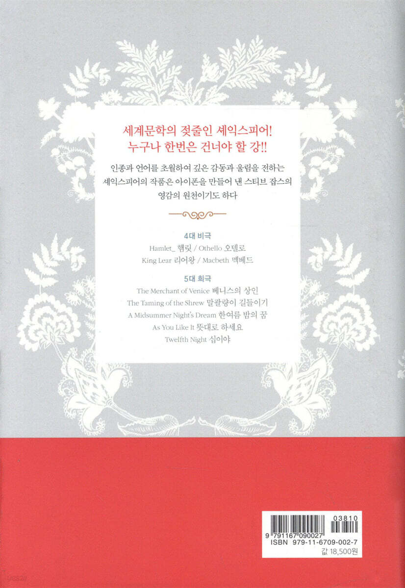 --- 「Hamlet(햄릿)」 중에서 내 아내가 자기를 침실로 어떻게 끌고 갔는지 설명하는 모양이지? 저놈의 코를 당장 잘라내서 개한테 던져 주고 싶은데 개가 보이질 않는군. --- 「Othello(오셀로)」 중에서 알몸으로 하늘의 매서운 시련을 겪느니 차라리 무덤 속에 있는 게 낫겠다. 인간이 겨우 이런 존재밖에 안 된단 말이냐? 이 사람을 보아라. 여기 있는 우리는 모두 자신을 숨기느라 옷을 입고 있는데, 너는 태어날 때의 모습 그대로구나. 옷을 입지 않으면 인간은 모두 너처럼 두 발 달린 짐승에 불과해. 벗어버리자. 이 따위 빌려 입은 옷들은 벗어버리자. 여봐라. 이 단추를 끌러라. --- 「King Lear(리어왕)」 중에서 우리는 독사를 칼로 쳤지만 죽이는 데는 실패한 거요. 독사가 언제 다시 살아나 우리를 물지 걱정하고 있잖소. 이렇게 밤낮으로 불안의 외줄을 타고 악몽의 벼랑을 건널 바에야 차라리 죽은 던컨의 뒤를 따르는 것이 낫지 않겠소. --- 「Macbeth(맥베스)」 중에서 저는 한때 바사니오의 행복을 빌며 이 몸을 저당 잡혔지요. 하지만 부인 남편의 반지를 가져가신 그분이 아니었더라면 전 벌써 죽었을 겁니다. 이번에 다시 제 영혼을 담보로 맹세합니다. 남편께서 앞으로 다시는 맹세를 깨뜨리는 일이 없을 겁니다. --- 「The Merchant of Venice (베니스의 상인)」 중에서 그럼 당신 맘대로 해요. 저는 오늘 같이 가지 않을 거예요. 아니, 내일도, 앞으로도 마찬가지고요. 문은 열려 있으니, 가보세요. 그 장화가 닳아빠질 때까지 실컷 돌아다녀 보시죠. 난 마음이 내킬 때까진 여길 떠나지 않을 작정이니까. --- 「The Taming of the Shrew (말괄량이 길들이기)」 중에서 오, 내 사랑. 라이샌더 도련님. 물론 가야지요. 가고말고요. 큐피드의 가장 강한 활과 황금화살 촉이 달린 멋진 화살에 걸고, 비너스의 수레를 끄는 비둘기들의 그 청순함에 걸고, 영혼과 영혼을 맺어주는 사랑의 여신을 걸고, 도련님께 굳게 맹세합니다. 도련님께서 지금 말씀하신 바로 그 장소에서 내일 어김없이 도련님을 만나 뵐게요. --- 「The Taming of the Shrew (한여름 밤의 꿈)」 중에서 보여준들 어떻겠소. 난 당신을 싫어하고 일부러 혼내 주려고 한 거요. 당신은 성실한 양치기로부터 구애를 받고 있잖소. 그러니 그 사람을 따뜻한 눈길로 받아들여요. 그는 당신을 끔찍이 사랑하니까. --- 「As You Like It (뜻대로 하세요)」 중에서 저로서는 모두 금시초문이에요. 난 당신의 목소리도 들은 적이 없고 얼굴도 전혀 몰라요. 나도 배은망덕이라는 것을 거짓말, 허영심, 수다, 음주벽, 그 밖에 인간의 나약한 심성을 타락시키는 어떤 악덕보다도 증오하는 사람이에요. --- 「Twelfth Night (십이야)」 중에서 |