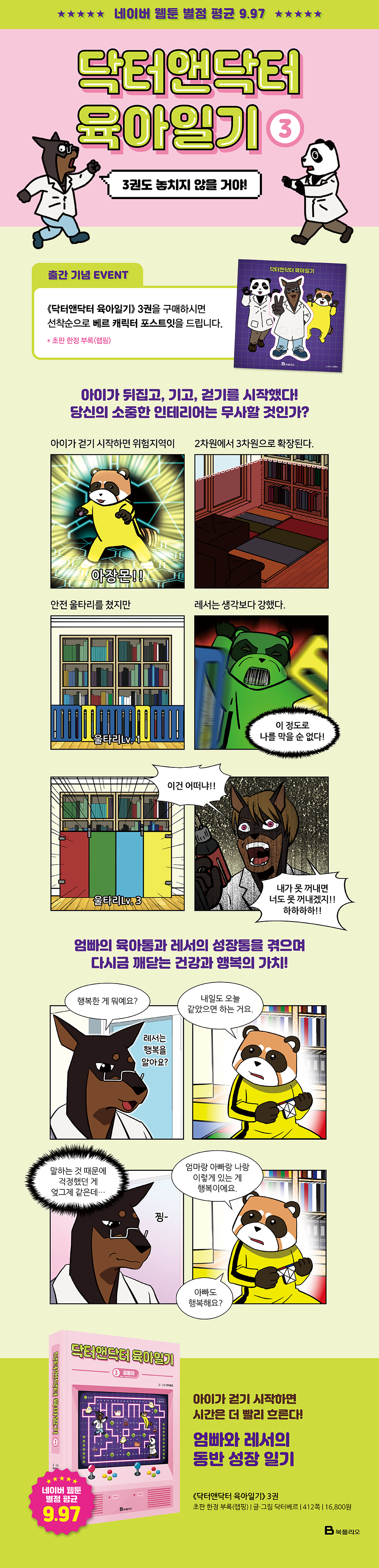 산부인과 의사 엄마의 임신과 출산, 공학박사 아빠의 논문 기반 육아. 완벽할 것만 같은 이들의 앞길은 과연?! 서울대 공학박사가 직접 그리고 쓴 『닥터앤닥터 육아일기』 3권이 출간됐다. 『닥터앤닥터 육아일기』는 공학박사 아빠인 베르와 산부인과 전문의 엄마 안다의 임신·출산·육아 경험을 생생하고 솔직하게 풀어낸, 지금까지 출간됐던 육아 만화들과 차별점이 있는 ‘논문 기반’, 코믹 교양만화다. 영화 속 대사나 인터넷 밈을 패러디하여 기가 막힌 타이밍에 치고 들어오는 센스와 공학도나 알 법한 용어를 개그로 승화시킨 닥터베르 작가 특유의 감각은 육아에 어려움을 겪고 있는 초보 엄마, 아빠는 물론 자녀가 없는 20, 30대 독자들도 충분히 공감하며 만화를 즐길 수 있도록 한다. 아이가 걷기 시작하면 시간은 더 빨리 흐른다! 육아의 새로운 국면에 봉착한 베르와 안다 이번 3권에서는 레서가 뒤집고, 기고, 걷기 시작하면서 겪게 되는 한층 업그레이드된 육아 이야기들을 담았다. 또한 ‘육아빠’로서 베르가 겪은 육아통과 우울감까지 디테일하게 그려내어, 모든 육아 피플들의 힘든 마음에도 폭풍 공감을 불러일으킨다. 아기가 태어나고 누워만 있을 땐 그 모습이 답답해 보이기도 했는데, 막상 기어다니기 시작하니 그야말로 대혼란의 시기다. 처음부터 기어다녔으면 응급실을 가도 몇 번을 갔을 것처럼 바닥의 위험한 요소들이란 요소들은 다 공략하고 다닌다. 따라서 정성껏 꾸민 신혼집 인테리어는 자연스레 붕괴되기 시작한다. 알록달록 매트, 안전 울타리, 안전 잠금장치 등, 이곳이 바로 안전한 육아를 위한 힐링 하우스! 그곳에서 레서는 걸음마를 시작했고, 드디어 말도 하기 시작했다. 레서는 과연 엄마를 먼저 말했을까 아빠를 먼저 말했을까?! 엄빠의 육아통과 레서의 성장통을 통해 다시금 깨닫는 건강과 행복의 가치 어느 날 갑자기 원인 불명의 경련을 겪은 레서. 베르와 안다는 눈앞이 캄캄해지는 충격을 받았고, 두려운 시간을 보냈다. 다행히 레서는 현재 건강한 아이로 성장하고 있고, 당시 그런 일을 겪으며 베르와 안다는 건강이라는 것이 세상 무엇과도 바꿀 수 없는 지고의 가치라는 것을 깨달았다. “아이가 자라면서 할 수 있는 것들은 점점 더 많아지고, 간혹 ‘우리 아들은 천재인가?’ 하는 반짝임을 보일 때면 불쑥 내 마음속의 욕심이 고개를 든다. 그럴 땐, 병원에서 밤을 지새우던 날들을 떠올린다. 적어도 이 시기에 아이들에게 건강하고 행복한 것 이상의 가치는 없다고, 그렇게 내 마음속의 파랑새를 쓰다듬는다.”라고 닥터베르는 말한다. 아이가 처음 걸어서 엄마아빠 품에 안기던 날, 아이가 처음으로 엄마아빠를 말하던 날, 그 순간의 감동을 어떻게 표현할까. 이런 아이들에게 중요한 건 ‘언제’보다 ‘어떻게’가 아닐까. 독자를 위한 특별한 단행본 총 38화를 묶어낸 『닥터앤닥터 육아일기』 3권은 아이가 뒤집고, 기고, 걷기 시작하면서 겪게 되는 또 다른 좌충우돌 에피소드와, 아빠엄마의 육아통과 아이의 성장통을 겪으며 동반 성장하게 되는 이야기들을 담았다. 400페이지가 넘는 방대한 분량을 단행본에 맞게 수정·보완 작업을 거쳤다. |
