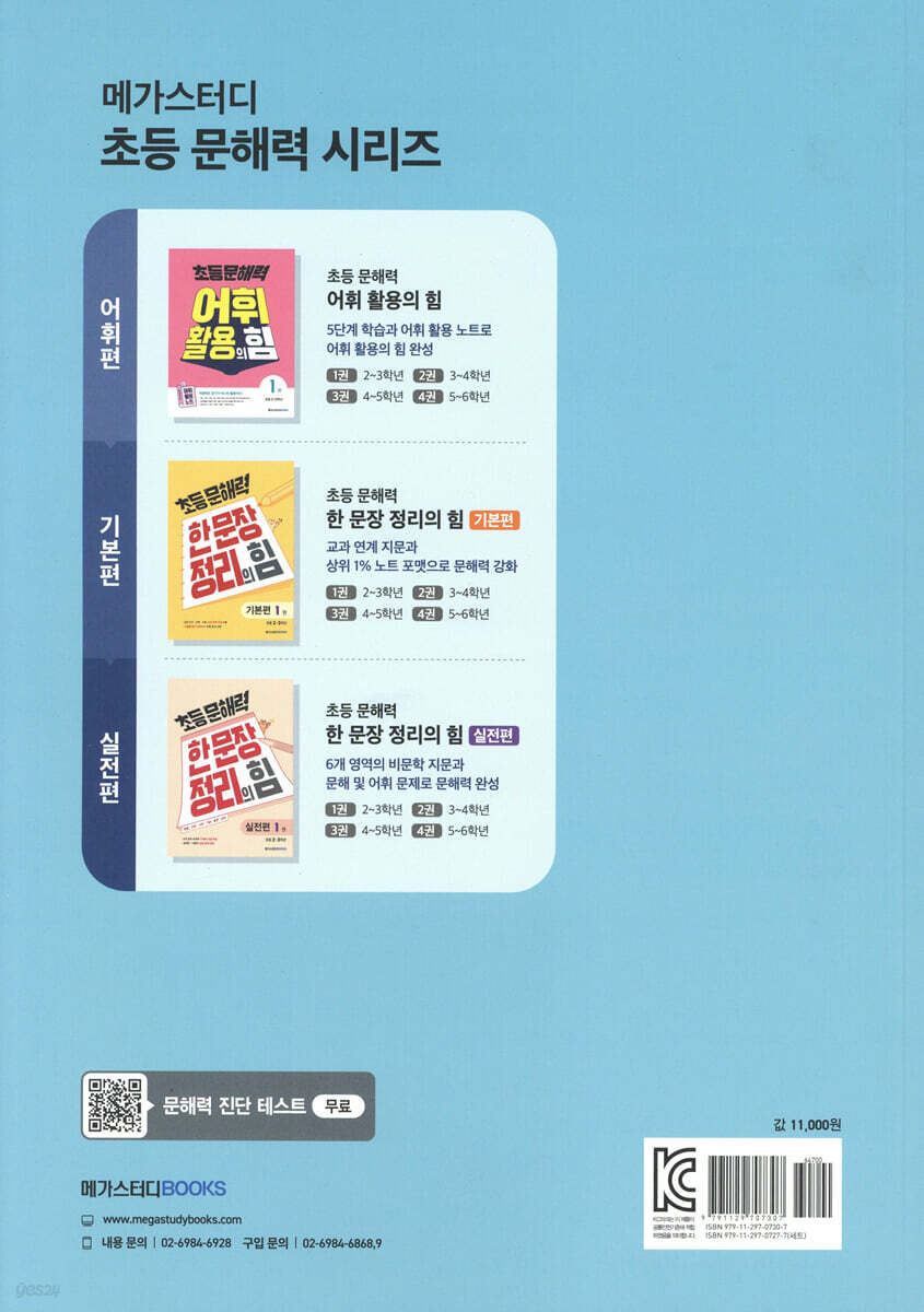 「초등 문해력 한 문장 정리의 힘」이 특별한 이유 3가지! (1) 초등 교과 연계 지문으로 교과 지식과 교양 지식을 한 번에! -초등 국어, 과학, 사회 교과와 연계된 교과 지문과 호기심을 불러일으키는 교양 지문으로 교과 지식과 교양 지식을 동시에 쌓을 수 있습니다. -설명문, 논설문과 같은 비문학 장르부터 문학 장르까지, 다양한 장르로 구성하여 어떤 글도 두려워하지 않는 자신감을 가질 수 있습니다. (2) 차근차근 문해력을 완성해 나가는 3단계 구성! -핵심 내용을 파악하는 기초 단계, 문제 풀이로 적용하는 연습 단계, 노트를 통해 한 문장으로 정리하는 실전 단계의 총 3단계 구성으로 문해력을 차근차근 쌓아 나갈 수 있습니다. (3) 상위 1% 학생들의 코넬 노트 정리 연습! -지문의 핵심 내용을 정리하는 노트 정리법을 통해 상위 1% 학생들의 효율적인 공부 방법과 평생 공부 습관을 익힐 수 있습니다. -‘1일 한 장’ 분량으로 구성된 실전 단계 학습으로 자기 주도적 학습 능력을 키워 나갈 수 있습니다. (4) 어떤 지식도 내 것으로 만드는 한 문장 정리! -글을 읽고 논리적으로 표현하는 한 문장 정리 훈련으로 서술형 평가에 대한 자신감을 기를 수 있습니다. -학년이 올라갈수록 방대해지는 지식을 자신의 지식으로 소화하는 효율적인 학습 방법을 터득할 수 있습니다. |