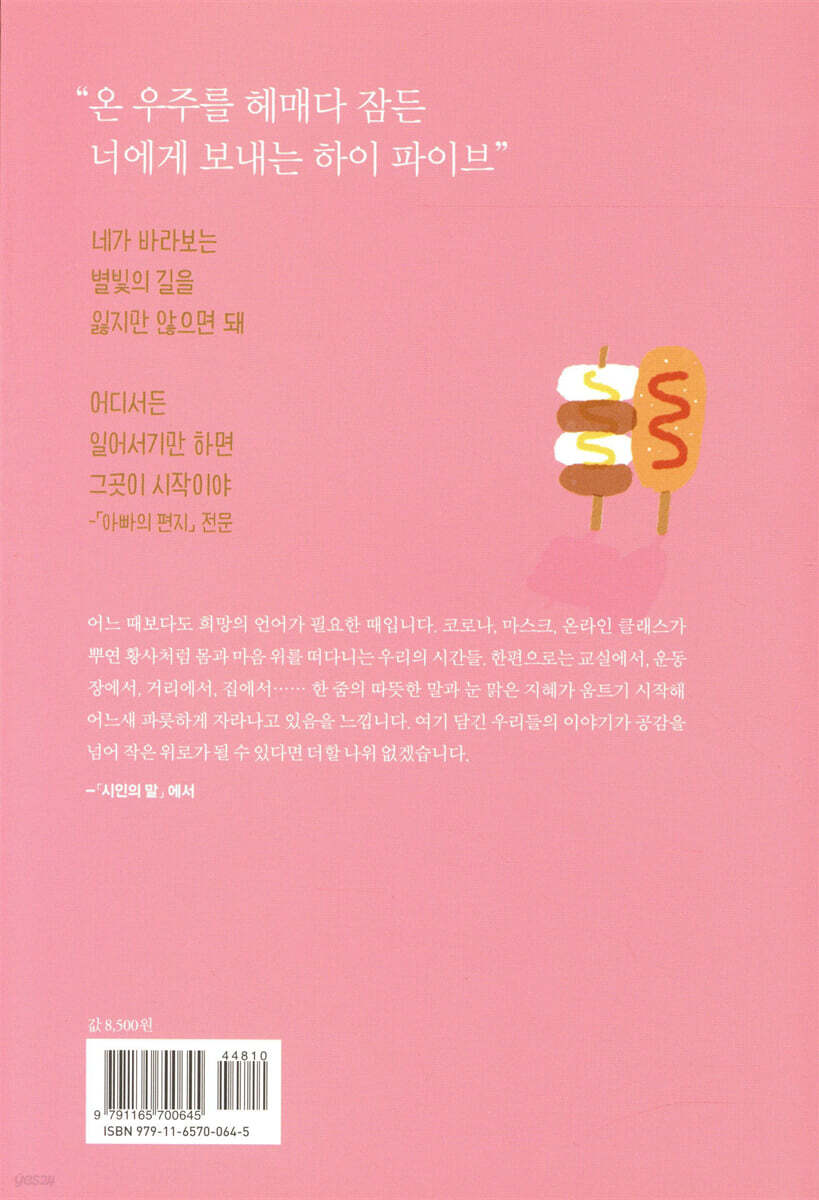 우리도 뭔가 쨍쨍하게 북돋우고 싶어 교실에서든 복도에서든 서로에게 하이 파이브를 하기로 했다 쭈뼛쭈뼛 좀체 손을 내밀지 않던 준형이가 수행 평가 발표문 끝에 파란 볼펜으로 쓴 한 줄 결한 하이 파이브가 필요합니다 --- 「하이 파이브」 ――――――――――――――――― 네가 바라보는 별빛의 길을 잃지만 않으면 돼 어디서든 일어서기만 하면 그곳이 시작이야 --- 「아빠의 편지」 |