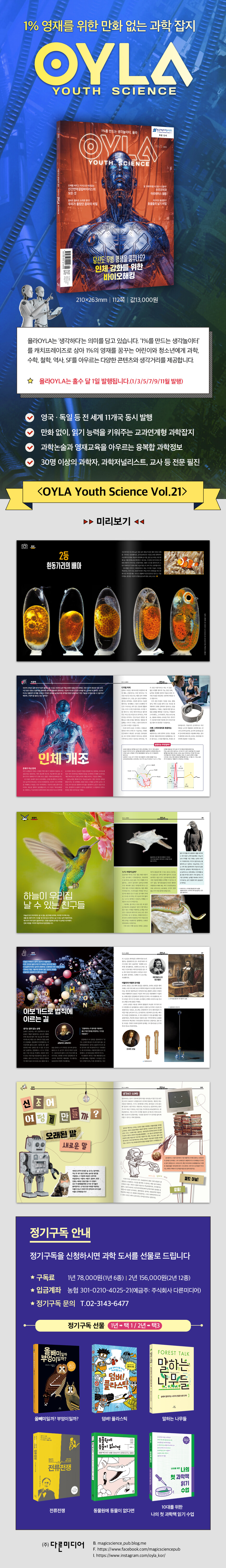 - 만화 없이, 읽기 능력을 키워 주는 교과연계형 과학잡지 - 과학논술과 영재교육을 아우르는 융복합 과학정보 - 30명 이상의 과학자, 과학저널리스트, 교사 등 전문 필진 〈욜라OYLA Youth Science〉는 독일, 영국, 스위스, 오스트리아, 호주, 인도 등에서 동시 발간되는 어린이, 청소년 과학 전문지 〈OYLA〉의 한국어판입니다. 욜라OYLA는 카자흐스탄어로 ‘생각하다’는 의미입니다. 〈OYLA Youth Science〉는 ‘생각하다’는 이름 그대로, 독자들이 자유롭게 생각하고 상상할 수 있는 공간을 제공합니다. 어린이들은 무한한 상상력과 창의력을 발휘할 수 있는 존재입니다. ‘1%를 만드는 생각놀이터’라는 캐치프레이즈 그대로, 독자들이 자유롭게 질문을 주고받고 스스로 답을 찾으며 1%의 영재로 성장할 수 있는 공간을 제공하는 것이 〈OYLA Youth Science〉의 목표입니다. 읽는 즐거움과 철학이 있는 과학정보지 〈OYLA Youth Science〉는 ‘읽는 즐거움이 있는 과학정보지’를 지향합니다. 긴 호흡의 글과 풍부한 도판을 통해 과학, 수학, 공학, 철학, 역사, SF를 아우르는 다양한 콘텐츠와 생각꺼리를 제공합니다. 특히 다양한 분야의 지식을 쉽게 배울 수 있도록 구성한 융합형 기사는 OYLA만의 특장점입니다. 〈OYLA Youth Science〉는 한 번 보고 잊는 책이 아니라 두고두고 읽을 수 있는 오랜 친구가 되어줄 것입니다. |