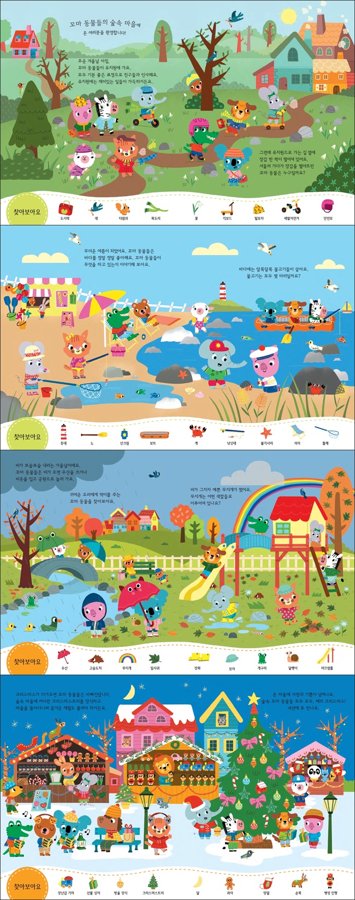 꼬마 동물들은 봄, 여름, 가을, 겨울 사계절 내내 바쁘답니다. 계절마다 해 볼 수 있는 놀이가 많거든요. 숲속 마을 꼬마 동물들과 함께 신나고 즐겁게 계절 놀이를 해 볼까요?