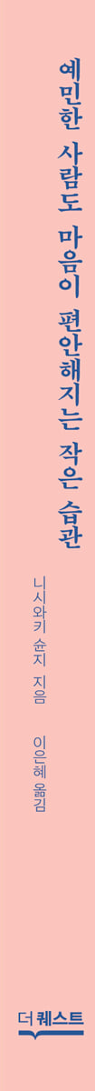 예민한 사람은 무엇을 느낄까? ‘고칠 수 없다’라는 전제에 당신은 만족하는가? 예민함은 결국 ○○에 의해 좌우된다 인간은 태어날 때부터 스트레스를 받는다 왜 사소한 일에 신경이 쓰일까? 효율적인 우선순위를 정한다 ‘TO DO 리스트’ 습관 ‘어려운 순서 정하기’와 ‘긴장’을 해결하는 요령 스몰 스텝을 기본으로 삼자 예민한 사람에게는 ‘필요한 낭비’가 있다 정리는 ‘눈에 보이는 범위만’으로 충분하다 밖을 걸을 때 쓰는 방어 용품 나의 유형을 찾아보자 유형별 싫어하는 것을 버리는 방법 스트레스를 줄이는 식생활 추천 part 2 인간관계의 피곤함을 덜어주는 습관 ‘친절함’과 ‘지나친 배려’가 뒤섞이다!? ‘남의 일’인데 신경 쓰이는 이유 나 외의 모두를 배려하고 있지 않은가? 관점을 바꾼다 ‘인지의 변화’ ‘AI’라 생각하고 편해지자! 타인에게 기대하지 마라 기대를 버리면 적극적으로 변한다!? 상대의 ‘자기중요감’을 채우자 상대를 파악하는 데 도움되는 ‘인간의 세 가지 유형’ 세 가지 유형의 구분법 세 가지 유형의 자기중요감을 채우려면 대화의 긴장을 풀어주는 ‘3번 카메라’ 연습 기분이 그대로 드러나는 사람, 험담꾼……, ‘대하기 힘든 사람’ 대응법 상담받고 싶지만 할 수 없는 이유 많은 사람과 사귀려 하지 않는다 특효! 릴랙스 체조 part 3 나에게 너그러워지는 습관 자신에 대한 지적을 멈추는 간단한 방법 회색지대를 받아들이는 훈련 ‘복리계산’을 이용해서 힘들이지 않고 전진! 궁극의 질문 ‘내 아이에게도 같은 일을 시킬 수 있는가?’ 행복의 5단계 평가하기 ‘인간관계 개혁’을 통한 생활개선 Good & New를 찾아라 타이머로 집중력을 조절하자 ‘시작을 못하는 문제’를 해결하는 방법 마음을 비워(無心) 뇌를 쉬게 하자 청소를 싫어하지만 깔끔한 성격!? ‘심술’에도 다 이유가 있다 섬세하고 민감해도 성공할 수 있다 ‘제2영역’을 의식하면 인생이 풍요로워진다 ‘학습, 건강, 인맥 쌓기’가 키워드 운동 습관으로 걱정을 날려버린다 ‘제2영역 × 5단계 평가’로 유지 part 4 당신의 섬세함을 활용하는 습관 ‘주변과 다르다’는 장점 지금 당신이 가장 많은 시간을 투자하는 일은 무엇인가? 생각의 초점을 내부에서 외부로 바꾼다 환경을 정비하여 더욱 파워업 나쁜 일이 있어도 ‘활짝 웃자’ 넘쳐나는 자극을 어떻게 다뤄야 할까? 막연한 불안과 마주하는 법 위기관리 능력은 이 시대에 강하다 예민한 사람에게 어울리는 직업은? 일은 ‘무엇을 하는가?’보다 ‘누구와 하는가?’가 중요하다 부록│예민한 사람을 위한 고민 상담실 |