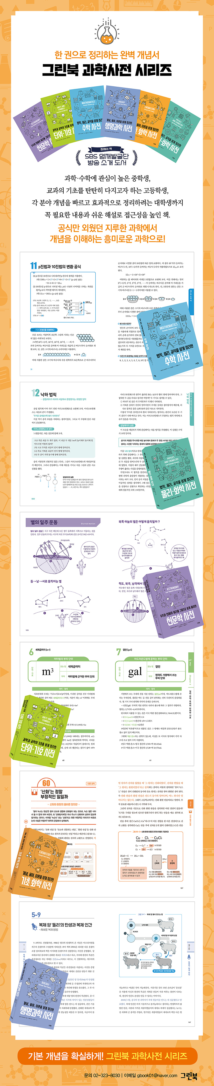 이 시리즈는 일본 환경에서 쓰여진 원고를 보완하기 위해 감수 과정에도 공을 많이 들였다. 우리나라 독자들, 특히 주요 독자인 청소년들이 학교 교과에서 익히는 정보와 충돌하지 않도록 용어와 기호 하나하나에 꼼꼼한 대조와 감수를 거쳤다. 이 작업에는 교육 현장에서 학생들을 가르치는 현직 교사들이 투입되었다. 열한 살 수학 영재가 선택한 단 한 권의 책 2019년 10월, SBS 영재발굴단에 출연한 11살 수학 영재 소년이 화제가 된 바 있다. 초등 4학년 이서진은 수학을 좋아하긴 했지만 선행학습을 하거나 학원에도 한번 다니지 않았다. 그런 아이가 중·고등학교 교과를 스스로 깨우치고 대학 수학까지 거뜬히 풀어낸다. 서진이가 늘 곁에 두고 본 책은 바로 그린북의 《수학 사전》이다. 특히나 여러 권의 수학책을 보는 다른 영재들과는 달리 서진이는 이 책 한 권만을 반복해서 보았다고 한다. 개념을 확실히 이해하고 난 뒤 스스로 문제를 내고 풀었다는 수학 영재 이서진 군의 공부법은, 선행과 고된 학습량에 지쳐 가는 많은 학생들에게 시사하는 바가 크다. 《수학 사전》은 현재 중·고등학교 수학부터 대학 교육 과정의 기초 수학까지 수학의 기본이 되는 개념들을 해설한 수학 개념 사전이다. 수학의 개념을 단계별로 정리하고 예제를 통해 이해를 도우며, 이러한 수학의 개념이 만들어지기까지 그 배경 지식을 담아 흥미를 더한다. 단순한 교과 수학을 넘어, 2000년 전부터 오늘날까지 활약하는 수학 개념들을 통해 다양한 현상과 사건을 수학의 눈으로 볼 수 있는 힘을 기를 수 있다. 앞서 나온 《수학 사전》과 《물리·화학 사전》을 중심으로 ‘과학 사전’ 시리즈 여섯 권에 대한 호평은 독자들 사이에서 빠르게 전파되고 있다. 실제 현장에서 필요로 하는 콘텐츠와 쉬운 해설로 접근성을 높인 구성 방식이 독자들에게 좋은 반응을 얻었기 때문이다. 선행이든 복습이든 목적은 다르지만, 기본 개념을 탄탄히 잡는 자기 주도 학습 방식은 언제나 확실한 결과를 가져다준다. 저마다 다른 출발선에서 마음을 새롭게 다잡는 때에 그린북 ‘과학 사전’ 시리즈가 유쾌한 동행자자 되기를 기대한다. |