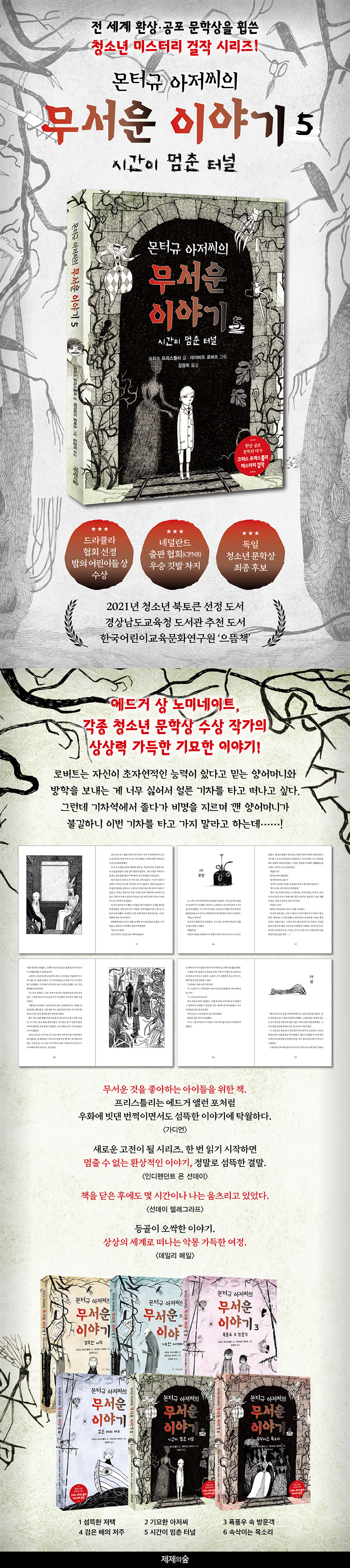 《몬터규 아저씨의 무서운 이야기》 시리즈는 매년 드라큘라 협회에서 선정하는 밤의 어린이들 상을 2009년에 수상했고, 전 세계에 번역 출간되면서 2010년 네덜란드 번역으로 네덜란드 출판 협회(CPNB) 우승 깃발을 차지했으며, 2011년 독일어 번역으로 독일 청소년 문학상 최종 후보작으로 선정되었다. 또한 국내에서는 2021년 청소년 북토큰 도서로 선정되었고, 경상남도교육청 고성도서관 추천 도서, 한국어린이교육문화연구원 '으뜸책’이기도 하다. 이 밖에도 세계 곳곳에 번역 출간된 도서는 큰 호응을 얻으며 공포 동화에 대한 아이들의 호기심을 한껏 채워 줬다. 이번에는 전편에서의 끝나지 않은 공포를 마저 즐겨 보자! 각종 도서 매체에서의 리뷰와 극찬! 『몬터규 아저씨의 무서운 이야기』 시리즈는 각종 도서상 수상뿐 아니라, 유명 도서 매체나 잡지 등의 서평에서도 그 이야기의 흥미로움과 오싹한 일면을 엿볼 수 있다. ·무서운 것을 좋아하는 아이들을 위한 책. 프리스틀리는 에드거 앨런 포처럼 우화에 빗댄 번쩍이면서도 섬뜩한 이야기에 탁월하다. _〈가디언〉 ·새로운 고전이 될 시리즈. 한 번 읽기 시작하면 멈출 수 없는 환상적인 이야기, 정말로 섬뜩한 결말. _〈인디펜던트 온 선데이〉 ·책을 닫은 후에도 몇 시간이나 나는 움츠리고 있었다. _〈선데이 텔레그라프〉 ·진정 전율이 오도록 무섭다. 아주 깔끔하게. _〈인디펜던트〉 ·등골이 서늘한 이야기. _〈더 타임스〉 ·오늘 밤 악몽을 꾸게 되리라는 걸 보장한다. _〈업저버〉 ·등골이 오싹한 이야기. 상상의 세계로 떠나는 악몽 가득한 여정. _〈데일리 메일〉 ·이 고딕풍의 소름 끼치는 이야기는 모두가 들을 수 있게 큰 소리로 읽어야 마땅하다. _〈더 스코츠맨〉 에드거 상 노미네이트, 각종 청소년 문학상 수상 작가가 쓴 잘 짜인 기묘한 이야기! 공포·환상 문학 청소년 문학상 등의 수상 경력에 빛나는 영국 아동 도서 작가이자 일러스트 레이터이다. 〈업저버〉의 일러스트레이터, 〈이코노미스트〉의 만화가로 일했던 그는 독립해 영국 로열 아카데미에서 정기 전시회 등을 여는 등 유명한 만화 작가, 일러스트레이터였다. 그 후 2004년 자신의 두 번째 책이자 첫 번째 공포 이야기인 『죽음과 화살Death and the Arrow』로 에드거 상 최종 후보에 올라 공포·환상 문학 분야에 그 이름을 알렸다. 2006년 『레드울프의 저주Redwulf's Curse』로 랭커셔 환상 도서 상을 수상했고, 이후 『몬터규 아저씨의 무서운 이야기』 시리즈로 전 세계적으로도 많은 상을 받았다. 일러스트레이터였던 만큼 글을 읽을 때도 장면 장면이 생각날 정도로 묘사가 뛰어나고, 처음엔 느껴지지 않던 무서움이 이해가 되는 순간 극대화되는 잘 짜인 기묘한 이야기의 구성이 보는 내내 감탄을 자아내게 한다. |