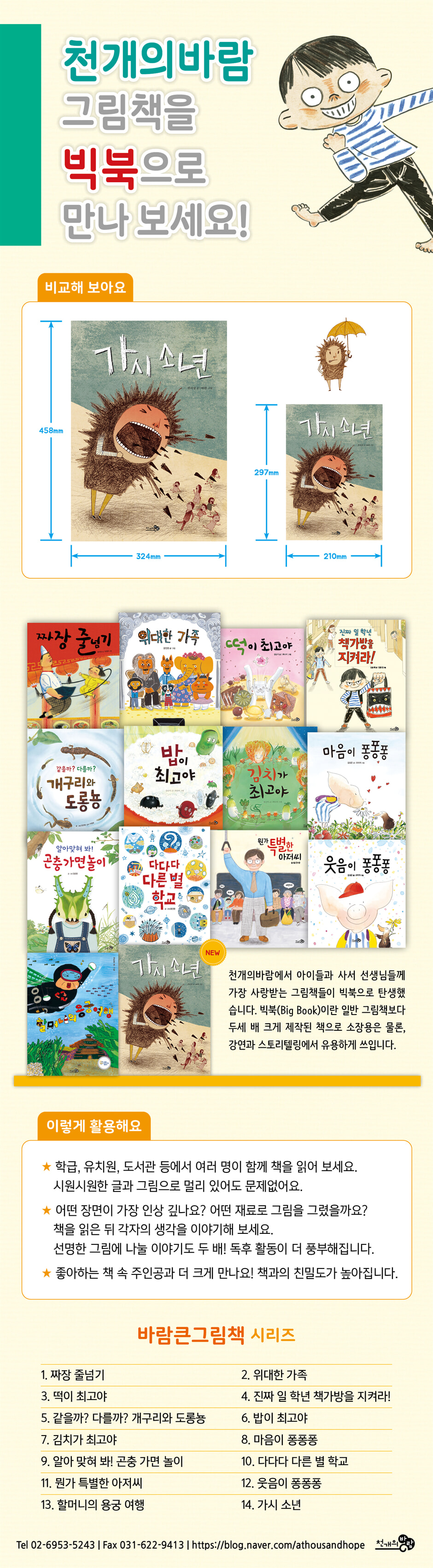 초등 1학년 2학기 국어 10. 인물의 말과 행동을 상상해요 초등 2학년 1학기 국어 3. 마음을 나누어요 가시 소년은 꼭 하고픈 말이 있어요 하지만 들어 주는 사람이 없네요 가시가 없어지면 들어 줄까요? ● 아이들이 좋아하는, 함께 읽기 좋은 큰 그림책 함께 읽기 좋은 국내창작그림책을 엄선하여 크게 만든 ‘바람큰그림책’ 시리즈입니다. 일반 그림책보다 두세 배 크게 제작되었기 때문에 개인 소장용으로 가치가 높을 뿐만 아니라, 강연 자료 및 유치원, 학교, 도서관 등의 기관에서 함께 읽기 자료로도 유용하게 사용할 수 있습니다. ● 가시 소년들의 행복한 성장 『가시 소년』의 첫 문장은 ‘나는 가시투성이야’라는 자기방어로 시작합니다. 가시투성이라서 뾰족하게 말하고, 소리치는 게 당연하다는 거지요. 자신의 감정을 올바르게 표현하지 못하고 날이 서 있는, 아직은 어린아이의 표현이라 할 수 있습니다. 사실은 관심을 받고 싶고 함께 어울리고 싶은데, 어찌 표현해야 할지 몰라 소리를 지르고 거칠게 행동하는 것입니다. 다행스럽게도 아이는 곧 자신의 말과 행동이 올바르지 못하다는 것을 깨닫습니다. 자신이 돋운 가시로 인해 혼자가 되는 외로움을 경험하며, 슬픔을 느끼게 되지요. 이때 아이는 가시를 없애면 어떨까 하고 생각합니다. 그리고 용기를 내지요. 결코 쉽지 않은 결심, 그리고 실행을 통해 아이는 성장하는 모습을 보여줍니다. 아이 삶이 얼마나 행복해질지, 그의 환한 웃음으로 짐작해 봅니다. 『가시 소년』은 이야기를 꾸며 말하지 않습니다. 나는 이런 때가 있다, 너는 이런 적 없니? 라고 어린 독자들에게 다가갑니다. 그리고 아이들이 자신의 행동과 마음을 돌이켜 생각할 수 있도록 하지요. 아이들은 『가시 소년』을 보며 공감하고, 어떻게 행동하는 게 나를 행복하게 만드는지 깨닫게 됩니다. ● 상처 받은 아이의 내면에 공감하는 문장 『가시 소년』의 글은 적습니다. 매 장면마다 한 줄 정도로 짧지요. 이것은 가시 돋친 아이의 내면을 문장으로 담아내고자 한 노력입니다. 상처 입고 화가 난 아이를 떠올려 보세요. 분한 마음에 씩씩거릴 뿐입니다. 혼자 따로 떨어져 웅크리고 있을 뿐입니다. 재잘재잘 말을 하지 않지요. 누군가 다가가 친근하게 물어도 묵묵부답으로 입을 다물고 있거나, 불퉁한 목소리로 짧게 대답할 뿐입니다. 그런 상처 받은 아이의 마음이 짧고 거친 문장으로 고스란히 담겨 있습니다. 그리고 『가시 소년』의 문장들에는 특이하게도 마침표가 없지요. 이는 작가가 의도적으로 뺀 것으로, 거칠고 화난 아이의 마음이 마침표로 인해 차분하게 정제되는 것을 꺼린 것입니다. 『가시 소년』은 단어와 문장으로도 상처를 받은 아이의 감정을 전합니다. ● 책의 이야기를 더욱 확장시키는 그림 『가시 소년』은 불안한 마음을 가시 돋친 표현으로 방어하는 아이의 이야기를 담고 있습니다. 무거운 주제인 만큼 그림이 다채롭고 밝으면 이야기를 가볍게 만들고, 그렇다고 단순하고 짙은 색을 쓰면 이야기가 한없이 무거워질 수 있지요. 아슬아슬한 경계를 과연 어떻게 표현할 수 있을까 라는 생각을 하면서 보면, 『가시 소년』의 그림이 얼마나 잘 구성되었는지를 알 수 있습니다. 매일 가시가 돋는 아이의 모습을 선인장에 빗대어 표현했는데, 이것은 잘라도 다시 자라는 선인장처럼 아이의 마음속 가시가 계속 자란다는 것을 효과적으로 보여줍니다. 또 각각의 장면들은 어지럽게 구성하지 않되 비어 보이지 않도록 패턴을 적절히 사용하고 있습니다. 무엇보다 누구나 가시가 있다는 장면에서, 겉으로 가시를 드러낸 아이와 달리 사람들의 가시는 그림자로 표현하였습니다. 이는 모두가 가시를 가지고 있다는 의미를 전달함과 동시에, 다른 사람들은 겉으로 드러낸 아이의 가시와 달리 속으로 감출 수 있는 가시라는 차별성을 표현하고 있지요. 마지막으로 가시 소년은 치과에 가 입안의 가시를 뽑습니다. 몸에 난 가시도 많은데, 왜 치과에 먼저 갔을까요. 그것은 이 갈이를 통해 한 단계 성장하는 사람의 신체 발달과 정신의 발달을 교차시킨 표현일 수도 있고, 화가 나면 맨 먼저 말부터 거칠어진다는 점을 강조하는 것일 수도 있습니다. 『가시 소년』은 그림의 해석이 다양하여 이야기 나눌 부분이 아주 많은 그림책입니다. |