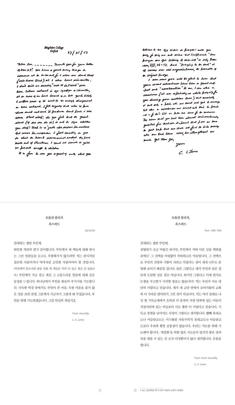 이 책에 실린 편지들은 루이스의 성격에 대한 세간의 속설을 확증해 준다. 그는 저널리즘, 광고, 속물근성, 심리분석에 대해, 틀리고 빤한 생각들에 대해, 또 기계, 소란, ‘관리 행정administration’에 대해, 그리고 개인이나 국가의 자유를 고갈시키는 수많은 사소하고 교묘한 행태들에 지독한 반감을 갖고 있었다. 게다가 편지 쓰는 일도 지독히 싫어했다는 사실도 빠뜨리지 말아야 한다. 자서전에, 행복한 삶의 필수요건으로 “우편물이 거의 오지 않고 우편배달원의 노크 소리가 두렵지 않은 것”을 들었을 정도였으니 말이다. 그러나 여기, 생전에 만나게 되리라 기대하지 않았던, 먼 타국의 한 사람에게 쓴, 족히 책 한 권이 되는 분량의 편지가 있다.
