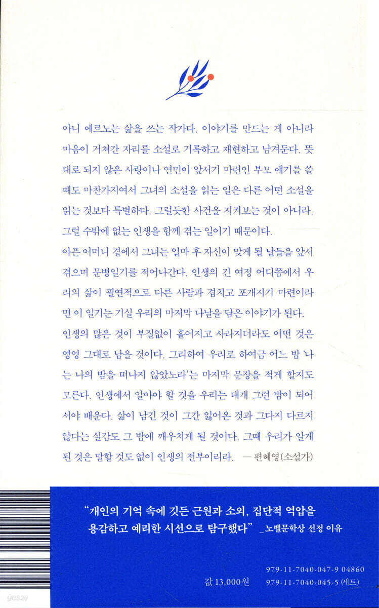 새롭게 선보이는 《열림원 프랑스 여성작가 소설》 이들이 프랑스문학의 반쪽이 아닌 문단의 전모를 보여준다 해도 손색이 없을 것이다. 그래서 처음부터 여성작가만을 모은 것이 아니라 좋은 작품만 추리다 보니 여성작가 소설 시리즈가 되었다고 우기고 싶다. ― 《열림원 프랑스 여성작가 소설》을 기획하며, 이재룡(문학평론가, 前 숭실대 불문과 교수) 1990년대 후반부터 2000년대 초반까지, 프랑스 문단에서 탁월한 문학적 재능을 인정받은 여성작가들의 작품을 모아서 한국 독자들에게 선보였던 《열림원 프랑스 여성작가 소설》이 새롭게 단장하여 돌아온다. 시리즈의 첫 책 『알렉시』가 출간된 지도 24년이라는 시간이 흘렀지만 우리는 여전히 여성들의 이야기를, 재단되고 변형되지 않은 그들의 이야기를 요구하고 있다. 피폐해져가는 어머니의 마지막 모습에 자신을 투영하며 공포를 느끼는 딸, 무능력한 언니들을 부양하며 할머니의 마지막 유산인 호텔을 지키는 손녀, 이혼 후 아들에게 애정과 서운함을 느끼면서 가정의 행복을 지키기 위해 애쓰는 엄마……. 작가들이 묘사하는 소설 속 여성들은 우리 주변에 존재하는 가까운 이들의 얼굴을 떠올리게 한다. 그들의 고단한 일상은 과거부터 현재에 이르기까지 여성들이 지나온 삶을 이어주는 힘 있는 목소리가 된다. 《열림원 프랑스 여성작가 소설》은 세대와 국경을 넘어 프랑스문학의 오늘을 만들어가는 여성작가들을 만나볼 기회가 될 것이다. “우리의 삶이 필연적으로 다른 삶과 겹치기 마련이라면 이 일기는 우리의 마지막 나날을 담은 이야기가 된다.”_편혜영(소설가) “나는 죄의식을 느끼면서 어머니의 생활에 관한 이야기를 쓰기 시작했다.” 프랑스문학의 거장 아니 에르노, 소설과 자전의 경계를 지우는 ‘칼 같은 글쓰기’ 지난 47년간 프랑스문학을 대표하는 작가로 자리해온 아니 에르노. 그녀의 언어는 우리의 삶을 날카롭게 파고들어 생의 가장 깊은 곳에서부터 울려 나온다. “나는 내가 직접 체험하지 않은 허구를 쓴 적은 한 번도 없고 앞으로도 없을 것이다”라고 스스로의 작품세계를 정의했던 것처럼 그녀의 소설은 결코 삶과 분리될 수 없다. 그녀가 삶에서 겪은 상실감과 어떤 존재적 결핍은 언제나 글쓰기를 촉발하는 단서로 작용했다. 『나는 나의 밤을 떠나지 않는다』는 치매에 걸린 어머니를 돌보며 죽음이라는 저항할 수 없는 이별을 마주한 아니 에르노의 처절한 심정을 담은 문병일기다. “‘인생을 살면서 자기 스스로를 방어할 줄 알아야 한다, 강하지 못할 경우에는 악하기라도 해야 한다’고 말하곤 했던” 어머니는 교통사고 이후 얻은 기억상실증이 치매로 이어지면서 “장소들을 기억하지 못했고 사람들과 손자들, 내 전남편 그리고 나조차도 알아보지 못했다.” “정신 나간 여자가 되어 온 집 안을 사방팔방으로 헤매며 돌아다”니는 모습을 보며 ‘나’는 “어머니를 이 지경으로 몰아넣은 사람이 바로 나인 것만” 같은 무력감과 죄책감, 그리고 자신의 미래 또한 그럴 것이라는 두려움에 사로잡혀 그녀의 마지막 나날을 기록으로 남긴다. “나는 글쓰기가 세상을 향한 전진이라고 생각했지만 어머니를 문병하고 있는 현재의 글쓰기를 통해서는 가혹한 피폐 상태를 확인하게 될 뿐이었다”는 말처럼, 그녀는 “자신의 글쓰기를 통해 어머니의 죽음이 더욱 명백한 현실로 규정지어진다는” 극단의 좌절을 경험하지만 이는 역설적으로 그녀의 쓰는 행위에 원동력이 된다. “생전 처음으로 ‘어머니는 돌아가셨다’라는 말을 글로” 적으며 “소설을 쓰면서 결코 이 말을 사용할 수 없게 될” 것이라 짐작하는 작가의 담담한 서술은 더 큰 울림으로 전달된다. “그때 우리가 알게 된 것은 말할 것도 없이 인생의 전부이리라.” 떠나지 않은 ‘밤’에 남아 있는 것들 나는 추호도 어머니 곁에 있었던 순간들을 수정해서 옮겨 적고 싶지 않았다. 그 순간들은 시간의 흐름을 벗어난 순간 ― 아니면 짤막하게 되찾았던 유년시절의 한순간쯤으로 생각해도 좋을 듯하다 ― 오로지 ‘이분은 내 어머니이시다’라는 생각 외에는 다른 모든 것을 망각하며 지냈던 순간들이었다. ― ‘작가의 말’에서 ‘나’에게 세상은 “어딘가 어머니가 존재해 있”을 필연적 공간을 의미했던 만큼 그 빈자리에서 기인하는 슬픔은 쉬이 익숙해지지 않는다. 하지만 “어머니 곁에 있었던 순간들을 수정해서 옮겨 적고 싶지 않았다”는 작가의 말처럼 ‘나’는 치열한 기록 행위를 통해서 어머니가 떠나지 않은 마지막 “밤”을 지키며 “어머니와 화해하려고” 보냈던 이 모든 시간에 종지부를 찍을 것이다. 자신의 삶을 포기하지 않은 어머니를 기록하는 것, 이는 어머니에게 전하는 마지막 사랑이 된다. “나는 나의 밤을 떠나지 않는다”는 ‘나’의 어머니가 글로 쓴 마지막 문장이다. “뭔가 잃어버린 것을 찾는 사람처럼 자꾸만 집을 되돌아보”던 어머니가 남긴 마지막 문장이 떠나지 않겠다는 선언이라는 점은 그녀가 살아온 궤적에 갖는 열렬한 의지를 보여준다. 밤의 거칠고 험상궂은 몰골은 낮과 사뭇 다른 모습이지만, 그 시간
