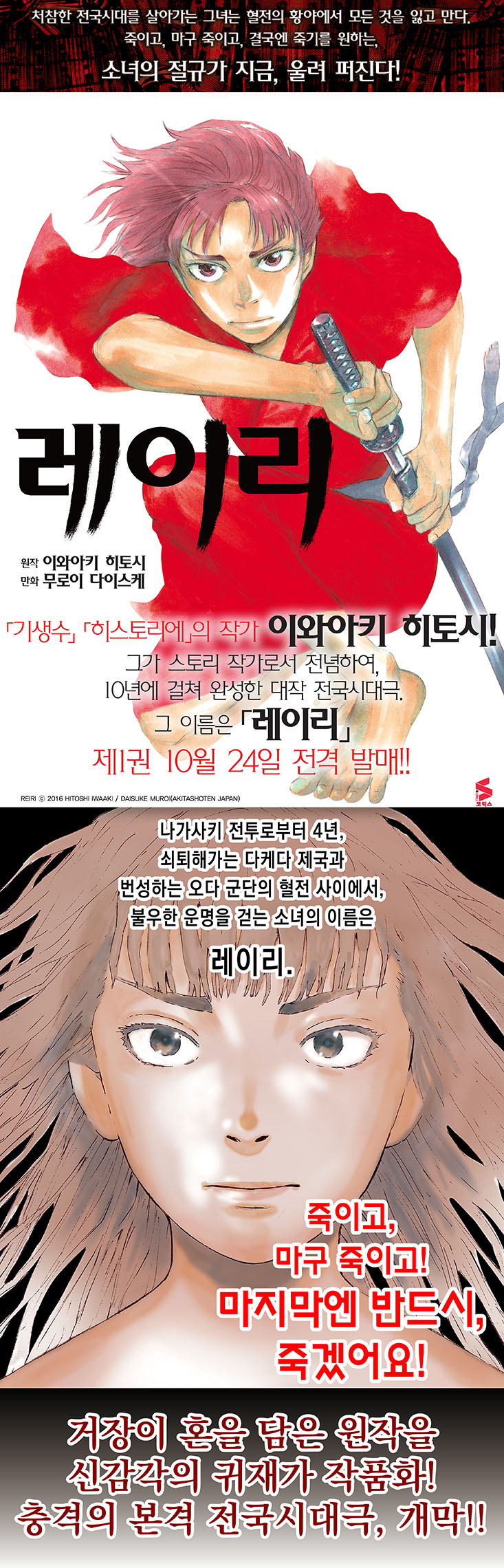 마지막엔 반드시, 죽겠어요! 나가사키 전투로부터 4년, 쇠퇴해가는 다케다 제국과 번성하는 오다 군단의 혈전 사이에서, 불우한 운명을 걷는 소녀의 이름은 레이리. 거장이 혼을 담은 원작을 신감각의 귀재가 작품화! 충격의 본격 전국시대극 개막!! |