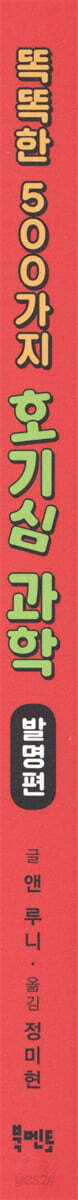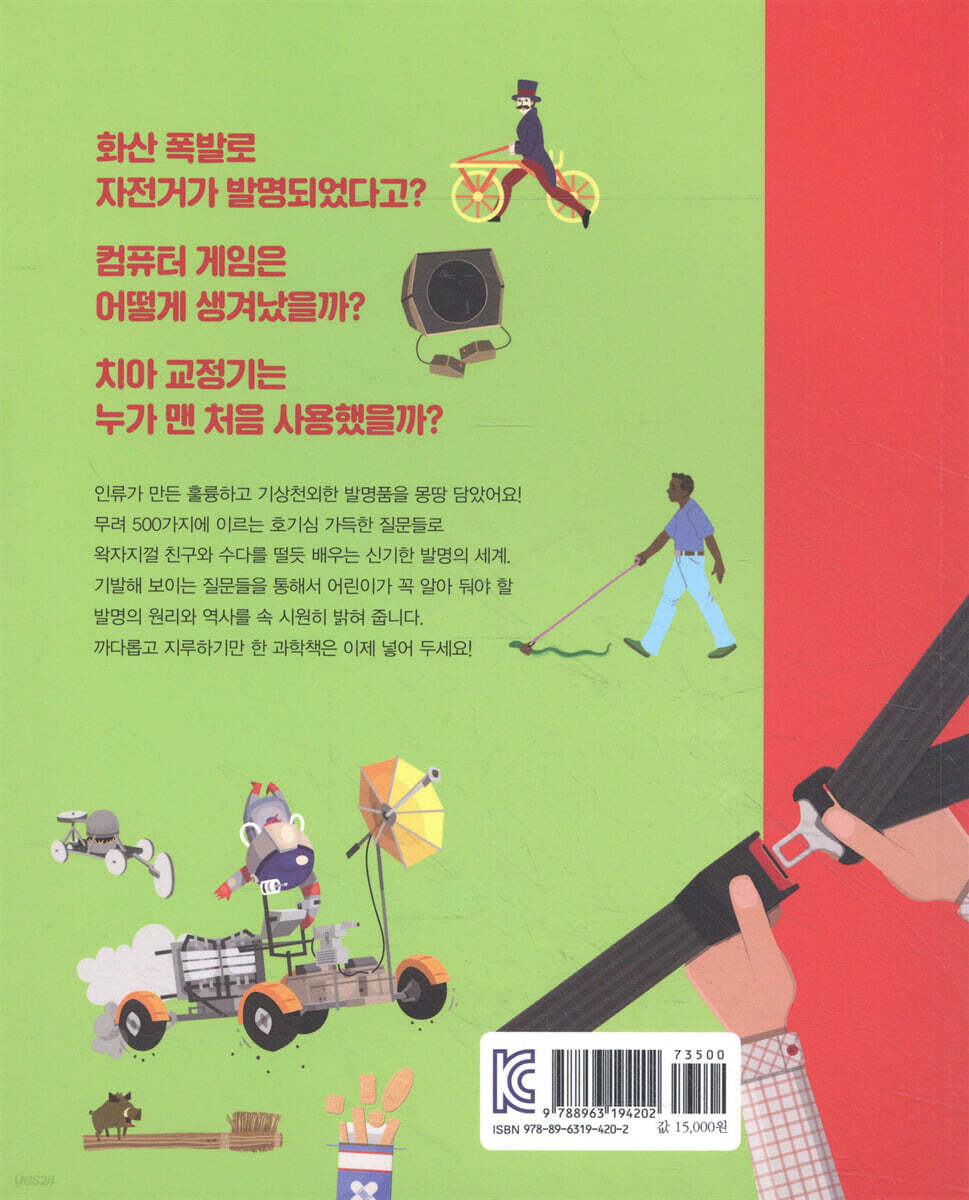 500가지 똑똑한 상식으로 단박에 이해하는 발명의 원리와 역사 화산 폭발로 자전거가 발명되었다고? 최초의 컴퓨터 마우스는 나무로 만들어졌다고? 지금 필통 속을 보세요. 연필 한 자루가 들어 있나요? 너무 흔해서 우리 주변에 있는지조차 잊어버리고 살 정도로 여기저기 많이 사용되는 연필. 그런 연필은 누가 언제부터 만들어 쓰기 시작한 걸까요? 처음에 연필이 만들어질 때부터 지금과 같은 모양이었을까요? 우리는 의식하지 못하고 살지만, 사실은 연필도 처음 등장했을 당시에는 획기적인 발명품 중에 하나였답니다. 누군가가 흑연을 글씨 쓰는 데 이용한 뒤로 더 편리한 연필을 만들기 위해서 많은 사람들이 머리를 맞댄 결과, 탄생한 것이 바로 오늘날 우리가 사용하는 연필인 것이지요. 우리가 일상생활에서 사용하는 거의 모든 물건들은 사실 그 물건이 탄생해서 발전하기까지 자기만의 역사를 가지고 있어요. 혹시 자전거가 화산 폭발로 인한 기후 변화 때문에 발명되었다는 사실을 알고 있나요? 도넛은 왜 가운데에 구멍을 뚫어서 만들게 되었을까요? 최초로 백신 주사를 발명한 사람은 누구일까요? 최초의 컴퓨터 마우스가 나무로 만들어졌다는 사실을 아나요? 이 책 《똑똑한 500가지 호기심 과학-발명편》에는 이 모든 질문에 대한 답이 들어 있습니다. 우리 일상생활 모든 곳에 숨어 있는 발명품의 원리와 역사를 가르쳐 주지요. 500가지가 넘는 발명에 대한 다양한 질문들은 평소 기발한 발명품들과 과학 상식에 관심이 많은 어린이들을 만족시키기에 부족함이 없을 거예요. 더 나아가서, 어려운 발명 지식도 마치 친구와 왁자지껄 떠들듯이 유쾌하게 가르쳐 주기 때문에 지루하지 않게 발명에 대한 500가지 과학 상식을 머릿속에 쏙쏙 넣을 수 있답니다. 발명에 대한 500가지 호기심을 과학적으로 알려 주다 유쾌하고 직관적인 그림을 통해 배우는 발명의 역사 이 책 《똑똑한 500가지 호기심 과학-발명편》에는 초등학교 어린이가 상식으로 알아 두어야 할 500가지 발명 이야기가 실려 있습니다. 자동차, 비행기, 기차 등과 같은 탈것의 발명부터, 라디오, 신문, 전화, 우편, 스마트폰에 이르는 전달 매체의 발명, 사람의 목숨을 살리는 의료 기술의 발명, 치즈와 팝콘, 커피와 같은 음식과 관련된 식품 기술의 발명, 전구나 컴퓨터, 보온병 같은 생활 기구의 발명, 그 밖에 엉뚱하고 이상한 발명품들에 이르기까지 온갖 발명품을 다 모았지요. 이 책을 읽고 나면 발명에 대한 거의 모든 것을 안다고 자부할 수 있을 거예요. 또한 이 책의 가장 큰 특징은 자칫 복잡할 수 있는 과학 지식을 한 페이지 안에서 알기 쉽게 핵심만 설명한다는 점이에요. 어느 페이지를 펼치든 알토란같은 지식을 빠르고 재미있게 이해할 수 있어서 어린이들이 지식에 손쉽게 접근할 수 있는 점이 큰 장점이지요. 거기에 더해진 유쾌하고 직관적인 그림들은 발명품의 구조를 빠르게 이해할 수 있게 하고, 그 원리를 단박에 깨우치게 해 줍니다. 발명품의 원리를 설명하는 데 그치지 않고 그 발명품이 발전해 온 역사까지 알려 주기 때문에 어린이로 하여금, 평범한 물건들도 어떻게 하면 더 좋게 바꿀 수 있을지 고민해 보게 하는, 발명가적인 시각도 심어 줄 수 있지요. 이 책이 부디 더 많은 어린이들에게 있어 과학의 꿈을 키우는 기회가 되고, 미래의 우리 삶을 바꿀 수 있는 위대한 계기가 될 수 있기를 바라 봅니다. 교과 연계 ★ 5-1 과학 1. 온도와 열 ★ 5-1 과학 2. 태양계와 별 ★ 5-2 과학 3. 물체의 빠르기 ★ 5-2 과학 4. 우리몸의 구조와 기능 ★ 6-1 과학 3. 렌즈의 이용 ★ 6-1 과학 4. 여러 가지 기체 ★ 6-2 과학 2. 전기의 작용 ★ 6-1 과학 4. 연소와 소화 |