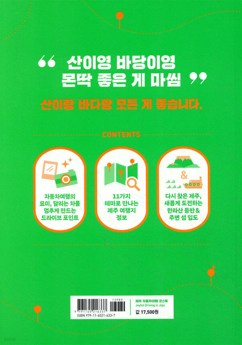 마음은 가뿐하고 하루는 알차게 제주 자동차여행을 떠나자! 1. 22가지 핵심 도로 코스 중 당신에게 맞는 도로를 찾아 즐겁게 여행하세요. 제주도 여행에서 이제 떼려야 뗄 수 없는 렌터카. 더욱 프라이빗하고 안전하게 자동차로 이동하는 여행을 제안합니다. 일주도로 따라 제주 바닷길을 돌아보거나, 중산간도로 따라 제주 깊숙한 곳으로 들어가 보십시오. 제주를 사랑하는 작가가 여행자들의 효율적인 여행 동선을 위해 핵심 도로를 22가지 구간으로 나누었어요. 당신이 머물 숙소의 위치를 기준으로 그 주변 도로를 골라 즐거운 제주 자동차여행을 시작해보는 건 어떨까요? 2. 각 코스별 드라이브 포인트를 사진으로 먼저 만나세요. 자동차로 슝 하고 그냥 지나가 버릴 수도 있는 도로 위 드라이브 포인트를 미리 알려줍니다. 목적지를 향해 달려가는 차 안이지만, 알고 보면 창밖 너머 멋진 풍경을 마주할 수 있지요. 작가가 직접 차를 달리고 멈추고를 반복하며 드라이브 포인트를 사진으로 기록했어요. 책 속에서 사진으로 만난 그 장면을 여러분이 방문한 제주에서 꼭 발견해보시길 바랍니다. 3. 한 번쯤 가보았고 들어봤을 여행 명소, 그곳에 관해 덜 알려졌거나 더 집중해볼 만한 인문학적·실용적 내용을 더했어요. 여행 명소에 따라 깊이 있게 들여다볼 이야기가 있는 경우, 익스플로링(Exploring) 페이지로 따로 구성했어요. 제주 4.3사건에 관한 이야기부터 미술관 속 놓치지 말아야 할 전시물, 트레킹 명소 등 다양한 주제로 이야기를 풀어냈어요. 4. 다시 찾은 제주라면 이번엔 조금 색다른 코스 어떨까요? 유명 명소가 궁금한 여행자도 많지만 고즈넉한 자연 속 숨 고르기를 위해 제주라는 아름다운 섬으로 입도하는 사람들도 꽤 있습니다. 그들을 위해 한라산의 등산로 코스 정보를 꼼꼼히 담았으며 등산로마다 각기 다른 풍경을 사진으로 수록했습니다. 더욱이 제주와는 사뭇 다른 매력이 있는 추자도와 대한민국 최남단에 위치한 마라도 등 제주 본섬에 비해 한적하고 여유롭게 머무를 수 있는 주변 섬 정보도 간결하게 담았습니다. 5. 여행을 풍요롭게 하는 테마별 공간을 소개합니다. 구간별 도로 주변마다 함께 방문해보면 좋은 곳들을 소개합니다. 아늑한 동네 책방부터 아이 혹은 동행자 혹은 홀로 가보기 좋은 곳, 맛있는 음식과 달콤한 디저트가 있는 곳까지. 당신이 보낼 제주에서의 하루를 더욱 풍성하게 만드는 공간입니다. 취향에 따라 골라 가세요! |