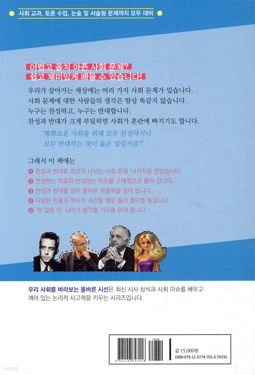 인간이 인간을 벌하는 방법 … 사형 제도에 대해 ‘사생활’과 ‘공공의 이익’, 뭐가 중요해? … 개인 정보 보호에 대해 인간만 소중한가? … 동물 실험에 대해 공정한 사회의 의미 … 사회적 배려에 대해 죽음을 결정할 수 있는 권리 … 안락사에 대해 ‘다양성’은 ‘혼란’의 다른 이름일까? … 다문화에 대해 창작에 관한 권리를 바라보는 시선 … 저작권 보호에 대해 빠르고 편리한 것을 좇는 현대인 … 패스트푸드에 대해 국가를 위해 아이를 낳으라고? … 출산 장려에 대해 외모도 경쟁력이라고 말하는 시대 … 외모 지상주의에 대해 우리나라가 최고인가? … 애국심에 대해 정말 ‘우리의 소원은 통일’일까? … 통일에 대해 ‘자유’와 ‘방종’의 아슬아슬한 줄타기 … 언론 자유에 대해 박수받을 자격, 격려받을 자격 … 일등주의에 대해 |