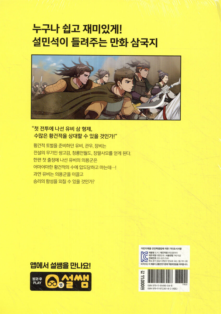 삼국지를 난생 처음 읽는 독자를 위해, 방대한 내용을 핵심적으로 담았습니다. 복잡한 이름, 반복되는 사건은 간결하게 정리하여 삼국지를 그 누구보다 쉽고 재미있게 설민석 선생님이 들려드립니다. 2. 눈길을 사로잡는 색다른 그림 웹툰 명가 ‘재담미디어’ 산하의 『스튜디오 담』이 각색과 작화에 참여하여, 새로운 스타일의 만화 『삼국지 대모험』이 탄생했습니다. 생동감 넘치는 캐릭터와 그림이 요즘 어린이의 눈길을 사로잡습니다. 3. 놀라운 상상력으로 탄생한 새로운 인물 ‘유비, 관우, 장비’ 같은 영웅뿐만 아니라, 삼국 시대를 살았던 평범한 사람들이 이름을 가지고 등장합니다. 상상력으로 탄생한 새로운 인물을 지켜보며 이야기에 더욱 공감하고 몰입해 보세요. 4. 이야기 속의 또 다른 이야기! 삼국지 이야기를 실감나게 들려주는 ‘마람카’, 그 이야기에 점점 빠져드는 어린 황제 ‘아자드’! 마람카와 아자드에게 무슨 일이 벌어지고 있는 걸까요? 두 사람의 긴장감 넘치는 이야기는 또 다른 기대를 불러일으킵니다. 5. 꼼꼼하게 담은 권말 역사 정보 삼국지의 배경이 되는 실제 인물과 사건 등 배경 지식과 정보를 꼼꼼하고 정확하게 담았습니다. 『삼국지연의』와 비교하여 이 책에서만 볼 수 있는 이야기도 살펴볼 수 있습니다. 또한 『정사 삼국지』 내용까지 간략하게 비교한 표를 수록하여, 방대한 내용의 삼국지 정보를 한눈에 볼 수 있습니다. |