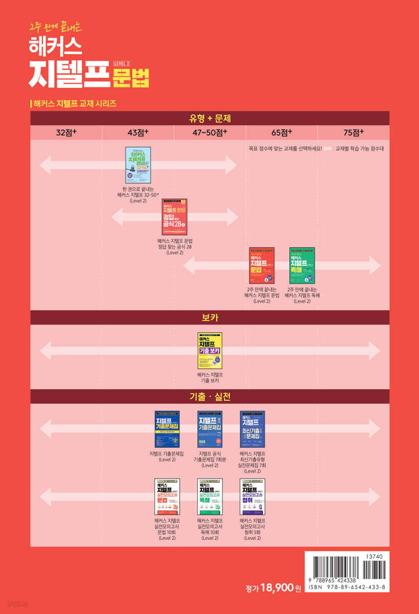 기초이론부터 실전모의고사까지 한 권으로 완성! [이런 분에게 추천합니다] 1. G-TELP 독해 영역을 완벽하게 대비하고 싶은 분들 2. 연습문제+실전문제 13회분으로 G-TELP 독해를 충분히 연습하고 싶은 분들 3. G-TELP 독해 출제 패턴을 통해 단기에 목표 점수를 달성하고 싶은 분들 [해커스 교재만의 특장점] 1. G-TELP 최신 기출경향을 100% 반영한 최신개정판! 2주 만에 끝내는 지텔프 독해 (Level 2) 1) 지텔프 시험 정보부터 점수 잡는 비법까지 수록한 지텔프 코리아 공식 지정 독해 기본서입니다. 2) 지텔프 최신 출제경향 빅데이터를 완벽하게 분석 및 반영하여 전략적인 학습이 가능합니다. 3) '수준별 맞춤 학습플랜'을 통해 2주 만에 지텔프 독해 영역 단기 완성이 가능합니다. 2. 기초부터 실전까지 학습 가능한 체계적인 4단계 구성! 1) [문제 유형 공략하기 〉 PART별 출제 패턴 〉 Hackers Practice/Hackers Test 〉 실전모의고사]로 이어지는 단계별 학습이 가능합니다. 2) 지텔프 독해 영역을 충분히 연습해볼 수 있는 13회분의 풍부한 문제를 수록하여 실전 감각을 기를 수 있습니다. 3) 체계적인 4단계 구성을 통해 짧은 문단부터 긴 지문까지 쉽게 독해할 수 있는 실력을 갖출 수 있습니다. 3. 한눈에 정답이 보이는 [독해 출제 패턴] & [문제 유형별 핵심 전략] 1) 정답의 단서를 쉽고 빠르게 찾을 수 있는 'G-TELP 독해 출제 패턴'을 제시하였습니다. 2) 예제와 함께 수록된 ‘문제 유형별 핵심 전략’을 통해 어떤 지문이 나와도 빠르게 풀이 가능합니다. 4. 반드시 학습해야 하는 [필수 어휘] & [기출 유의어 리스트] 수록 1) 각 파트별 핵심 키워드 표현과 지텔프 독해 필수 어휘를 학습할 수 있는 ‘필수 어휘’ 리스트를 수록하였습니다. 2) 각 지문의 흐름과 단서를 끌고 오는 핵심 표현을 통해 빈출 단서 표현을 효율적으로 학습할 수 있습니다. 3) 부록 ‘기출 유의어 리스트’와 함께 수록된 예문으로 헷갈리는 유의어를 수월하게 파악하고 암기할 수 있습니다. 5. [단서 표시]와 [오답 분석]까지 포함한 상세한 해설! 1) 해석 부분에 정답의 단서를 별색 표시하여 각 파트별 및 문제 유형별 출제 패턴을 효과적으로 학습할 수 있습니다. 2) 오답 분석을 통해 실수를 줄이고 약점을 극복하여 실전에 완벽하게 대비할 수 있습니다. [빠른 목표 달성을 위한 해커스만의 추가 혜택] 1. 해커스인강(HackersIngang.com) 1) G-TELP 공식 기출문제 동영상강의 2) G-TELP 필수 단어암기장 및 단어암기 MP3 2. 해커스영어(Hackers.co.kr) 1) 무료 G-TELP 단기 고득점 비법강의 및 학습자료 2) 무료 지텔프/공무원/세무사 시험정보 및 후기 3. 해커스공무원(gosi.Hackers.com) 1) 군무원/공무원 무료 기출해설강의 2) 공무원 무료 동영상강의 4. 해커스 경영아카데미(cpa.Hackers.com) 1) 회계사/세무사/경영지도사 기출자료 및 무료 동영상강의 |