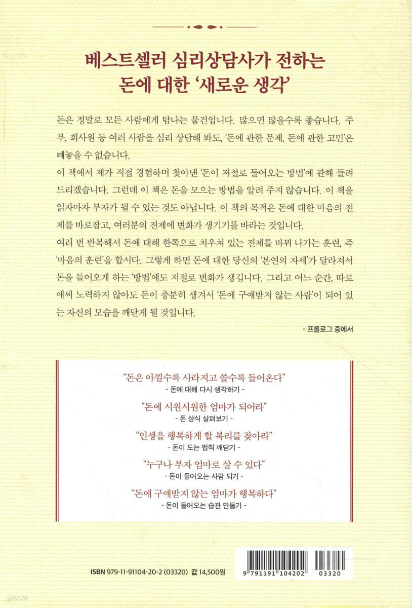 돈은 항상 ‘있다’고 생각하면 있는 돈이 저절로 따른다!” 돈 걱정에서 벗어나고, ‘돈 복’이 따르는 사람이 되는 법 이 책은 돈에 걱정 많은 엄마, 항상 ‘돈, 돈’ 하며 돈 걱정이 끊이지 않는 사람들을 위한 책이다. 갖고 싶은 것, 하고 싶은 것이 많지만 돈 때문에 참기만 하는 사람, 어쩌다 돈이 들어오기라도 하면 금세 없어질까 봐 쩔쩔매는 사람, 돈이 없어 사람 만나기 겁나고 돈 문제로 관계가 자주 틀어지는 사람들에게 평생 돈에 구애받지 않고 자유롭게 사는 방법을 알려 준다. 《돈이 따르는 엄마 돈에 쫓기는 엄마》는 돈을 어떻게 벌고, 모아야 하는지에 대한 ‘방법’이 아니라 돈을 어떻게 대하는지에 대한 마음에 관한 ‘자세’를 말한다. 심리상담사가 말하는 돈 이야기인 만큼 이 책은 ‘재테크서’가 아니라 ‘돈 심리서’라고 하는 편이 정확하다. 저자는 사람들이 돈에 관해 가지고 있는 ‘고정관념을 깨는 것’에서부터 시작해 돈을 대하는 ‘사람’을 바꾸는 것을 목표로 한다. 사람을 바꾸면 운명이 바뀐다고 믿기 때문이다. 돈에 대한 생각을 뒤집어야 돈이 따른다 돈이 따르는 엄마처럼 살려면 지금까지 ‘돈이 없다’, ‘부자가 되는 사람은 따로 있다’, ‘돈은 아껴야만 잘사는 것이다’라는 생각과 태도에 전부 반대로 행동해야 한다. 돈에 쪼들리는 사람은 항상 돈이 ‘없다’고 생각하면서 들어오는 돈을 무의식적으로 거부한다. 하지만 풍족한 사람은 돈은 항상 ‘있다’고 생각하면서 의식적으로 돈을 끌어당긴다. 살면서 우리의 인생을 바꾸고 싶을 때, 우리는 가정 먼저 생각부터 바꿔야 한다. 부정적인 생각은 우리의 삶을 더욱 곤란하고 힘들게 만들기 때문이다. 돈에 대한 생각 역시 마찬가지이다. 우리에게 부정적으로 각인된 돈에 대한 마음 버릇을 고쳐야만, 돈에 대한 태도가 바뀌어 돈에 휘둘리거나 지배당하지 않고, 돈에 구애받지 않으면서 자유로운 삶을 누리게 될 것이다. 돈이 도는 법칙을 깨달았을 뿐인데 인생이 바뀐다 책 속에는 인생을 풍요롭게 만드는 돈에 대한 생각을 어떻게 바꿀지 여러 방법을 제시해 준다. 예컨대, 돈을 공기처럼 생각하라는 생각이 그렇다. 숨을 많이 쉰다고 공기가 없어지지 않는 것처럼, 돈을 쓴다고 돈이 사라지지 않기 때문이다. 공기가 늘 채워지듯, 돈도 늘 채워진다. 그렇기에 돈을 많이 쓸수록 많이 들어온다. 또 혼자 아무리 노력해 봐야 돈은 기껏 자기 능력만큼만 얻을 수 있을 뿐이라는 이야기도 그렇다. 우리는 자력으로 혼자서 힘쓰는 것보다 타력을 활용하면 그 수 배, 수십 배, 수백 배 성과를 낼 수 있다. 이 막강한 힘을 가진 타력을 이용하는 방법은 오직 하나, 혼자 노력하는 것을 멈추는 것이다. 나의 존재 가치를 믿는 것만큼 타인의 능력을 믿으며 편안해지면 돈은 따라온다. 이렇게 돈이 도는 법칙을 깨달았을 뿐인데 왠지 모르게 마음이 편안해지고, 저절로 돈이 들어오는 사람처럼 살고 싶도록 마음이 바뀐다. 돈에 관한 책이지만, 세상과 인생을 보는 눈에 관한 책이기도 하다. 돈이 들어오는 습관 만들어 따르면 누구나 부자로 살 수 있다 ‘돈은 아껴야 잘산다’라는 말을 평생 믿었다면 그 신념을 거스르면서 반대로 산다는 것은 쉬운 일이 아니다. 마음속에서 저항이 일고, 기껏 실천하려 해도 주위에서 방해하고, 한두 번 시도했다가도 다시 원상태가 된다. 고정관념에 사로잡힌 사람들이 새로운 생각을 받아들이지 못하고 거부 반응을 보이는 이유다. 하지만 그래서는 인생을 바꾸기 어렵다. 따라서 우선은 ‘반대로’ 믿어 보는 것, 그리고 조금씩이라도 지속적으로 변해 가는 것이 중요하다. 그러려면 변하겠다는 다짐과 용기가 필요하고, 다짐과 용기를 꾸준히 행동으로 옮기는 훈련이 뒷받침되어야 한다. 그러한 훈련을 위해 책 전반에는 반복적으로 돈이 들어오는 사람의 마음 자세가 갖춰져야 돈이 들어오는 방법도 달라진다고 이야기한다. ‘돈이 따르는 존재’가 되려면 일종의 ‘마음 훈련’이 필요하기 때문이다. 이것이 더 이상 돈 걱정하지 않고, 평생 돈에 구애받지 않는 진짜 비결이다. 저자가 직접 경험해 돈을 모은 방법이고, 그의 강의를 듣고 수많은 사람이 효과를 검증한 비법이니 믿고 실행해 보길 바란다. |
