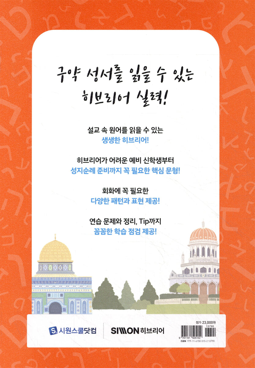 이 책의 구성과 특징 이스라엘은 어떤 나라? 현대 히브리어와 성서 히브리어 히브리어의 특징 이것만은 꼭! 미리 알기 Part 1. 대명사를 이용한 현재형 문장 만들기 - 사물, 과일 이름 말하기 UNIT 01 이것은 물고기이다. UNIT 02 이것은 무엇인가요? UNIT 03 네, 이것은 대추야자예요. 쉬어가기 평화의 도시 예루살렘 Part 2. 인칭 대명사를 이용한 현재형 문장 만들기 - 직업, 신분 말하기 UNIT 04 나는 학생이다. UNIT 05 당신은 여행객이다. UNIT 06 그녀는 군인이다. UNIT 07 나는 한국인이다. 쉬어가기 사해 사본이 있는 이스라엘 박물관 Part 3. 형용사를 활용해 문장 만들기 - ‘좋은’, ‘아름다운’ 표현하기 UNIT 08 좋은 아침이에요! UNIT 09 당신은 아름다워요. UNIT 10 나는 건강하다. 쉬어가기 이스라엘 여행 추천 기념품 Part 4. 숫자를 학습하고 응용하기 - 무언가를 요청하고 감사 표현하기 UNIT 11 하나, 둘, 셋 UNIT 12 물고기 한 마리 UNIT 13 팔라펠 한 개 부탁해요. 쉬어가기 이스라엘의 화폐 단위 Part 5. 유무와 위치 묻고 답하기 - ‘있다’, ‘없다’ 표현하기 UNIT 14 나에게 시간이 있다. UNIT 15 화장실은 어디에 있나요? 쉬어가기 저절로 몸이 뜨는 호수 사해 Part 6. 복수 형태로 현재형 문장 만들기 - ‘기쁜’, ‘지혜로운’ 표현하기 UNIT 16 이것들은 새롭다. UNIT 17 우리는 기쁘다 UNIT 18 당신들은 지혜롭다. UNIT 19 누구시죠? 쉬어가기 유대교의 전통 음식법 코셔 Part 7. 일반동사를 사용해 문장 말하기 - ‘공부하다’, ‘질문하다’ UNIT 20 나는 탈무드를 공부한다. UNIT 21 그녀는 책을 읽는다. UNIT 22 질문이 있어요. 쉬어가기 안식일에는 샤바트 샬롬! Part 8. 파알 동사 학습하기 - ‘사랑하다’, ‘보다’ 표현하기 UNIT 23 나는 당신을 사랑해요. UNIT 24 우리는 피타를 후무스와 함께 먹는다. UNIT 25 그녀는 산을 본다. UNIT 26 그는 예루살렘에 거주한다. 쉬어가기 아름다운 항구 도시 텔아비브 Part 9. 피엘 동사 학습하기 - ‘말하다’, ‘연주하다’ 표현하기 UNIT 27 나는 히브리어를 말한다. UNIT 28 당신은 기타를 연주한다. 쉬어가기 부림절의 유래와 풍습 Part 10. 다양한 동사 학습하기 - ‘원하다’, ‘할 수 있다’ 표현하기 UNIT 29 나는 원한다. UNIT 30 나는 할 수 있다. 쉬어가기 하누카의 유래와 풍습 [부록] 히브리어 따라쓰기 강의 시원스쿨 히브리어 BEST 샘플강의 미리보기 (온라인 제공) |