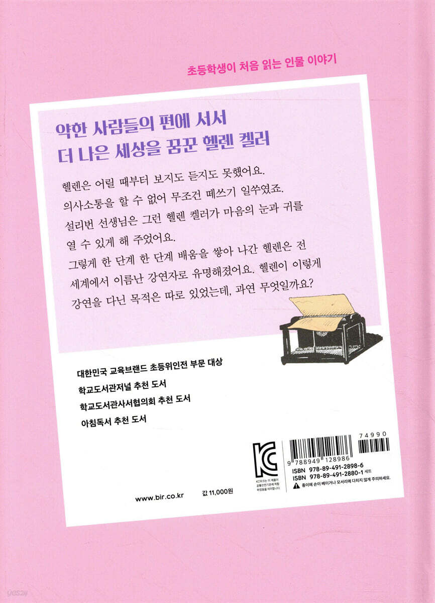 이 책은 장애인으로서 사회를 변화시켜 나간 운동가 헬렌 켈러의 일생을 그린 책이다. 심하게 앓은 후 보지도 듣지도 못하게 된 어린 시절부터 암흑 같았던 삶을 송두리째 바꿔 준 설리번 선생님과의 만남, 사회적으로 소외된 사람들을 대변했던 행보 등을 생생하게 담았다. 이 책은 ‘장애 극복의 아이콘’이 아닌 여성과 장애인 같은 사회적 약자들의 인권을 위해 평생을 바친 ‘사회 운동가’로서의 헬렌 켈러를 집중 조명한다. 그들을 위해 전 세계를 돌며 강연하고, 기금을 모으며, 신문과 잡지에 생각을 알리던 모습을 비중 있게 다뤘다. 그리하여 모두가 존중받는 더 나은 세상을 위해 직접 나서서 ‘행동’하고 ‘실천’하는 삶이 무엇인지 보여 준다. 부록에서는 점자의 탄생 과정을 비롯해 헬렌 켈러의 삶에서 빼놓을 수 없는 앤 설리번의 생애 등을 소개한다. 장애인을 위한 현대 사회의 여러 노력들 역시 소개하여 ‘누구도 소외되지 않는 사회’에 대해 생각해 볼 수 있게 한다. | 시리즈 특징 | ·어린이 눈높이에 꼭 맞는 만듦새! 그림책에서 읽기 책으로 넘어가는 초등 저학년 어린이들의 눈높이에 맞게 글의 분량과 수준을 맞추었고, 딱딱한 설명글이 아닌 동화처럼 술술 읽히는 이야기로 표현했으며, 유머러스하고 친근한 그림으로 보는 맛까지 충족시킨다. 또한 한 손에 쏙 들어오는 아담한 판형과 장정으로 어린이가 혼자 들고 보기에도 딱 좋게 만들었다. ·교과서 인물부터 교양과 상식을 넓히는 인물까지 총망라! [교과서 인물] 초등 교과서 등장인물 35명 초등 교과서 인물들을 필수적으로 소개한다. ‘국어 4-2 6. 본받고 싶은 인물을 찾아봐요’에 수록된 『정약용』, ‘국어 4-1 9. 자랑스러운 한글’과 ‘국어 6-2 1. 작품 속 인물과 나’에 수록된 『주시경』뿐 아니라, 국어, 사회, 과학, 통합교과, 도덕, 음악 등 교과서에 등장하는 인물들의 전 생애를 이 시리즈로 만나 볼 수 있다. [공간별 인물] 한국 인물 35명, 세계 인물 27명 한국 인물과 세계 인물을 고대 인물부터 현대 인물까지 고루 담았다. 건국 신화의 주인공 주몽부터 현대 예술가 백남준까지, 고대 이집트의 클레오파트라부터 현대 동물행동학자 제인 구달까지…… 공간별, 시대별로 주목해야 할 인물과 사건을 훑을 수 있어 어린이들의 상식 범위를 크게 넓힌다. [분야별 인물] 한국사 25명 세계사 8명 과학 9명 사회 11명 예술 9명 어느 한 분야 인물에 치우치지 않도록 했다. 단지 인물의 일대기뿐 아니라, 인물과 관련된 역사, 정치, 사회, 과학, 예술의 기초 지식을 자연스럽게 터득할 수 있다. 어린이들이 자기 관심 분야 인물들을 만나는 경험을 통해 롤 모델을 세울 수도 있을 것이다. ·국내외 대표 어린이 책 작가 총출동! 우리나라를 대표하는 동화 작가들과 일러스트레이터들이 참여한 창작물과 영국 Franklin Watts 출판사의 「Famous People Famous lives」 시리즈의 번역물로 구성되었다. 동화 작가23명, 일러스트레이터 33명, 번역가 8명을 포함해, 참여 작가만 무려 총 64명! 우리나라에서는 평균 십수 년 동안 어린이를 위한 글쓰기에 매진해 온 국내 대표 동화 작가들이 참여했다. 한국어린이도서상, IBBY(국제아동청소년도서협의회) 어너리스트 수상 작가 유은실, 한국문화예술진흥원 올해의 예술상 수상 작가 남찬숙, 황금도깨비상 수상 작가 김종렬 등이 우리 말맛을 리듬감 넘치게 표현해 냈다. 어린이 눈높이에 맞는 고급스러운 어휘들을 풍성하게 담아 독해력과 문학적 표현력을 키워 준다. 또한 한국 안데르센상 수상 작가 곽성화, 부천만화대상 어린이 만화상 수상 작가 김홍모 등 일러스트와 만화 분야에서 종횡무진 하는 대표 작가들이 익살스러운 그림으로 친근감을 더했다. 유영번역상, 한국출판문화상 수상 번역가 정영목 등 국내 최고 번역가들의 번역은 신뢰도를 높인다. ·사진과 연표로 보는 역사 부록 인물의 이야기를 더욱 입체적으로 알 수 있게 하는 두 가지 부록을 곁들였다. 하나는, ‘사진으로 보는 인물 이야기’이다. 실감 나는 사진과 함께 인물과 관련된 다양한 정치, 경제, 사회, 과학 지식을 소개함으로써 인물에 대한 깊이 있는 이해를 돕는다. 또 하나는 ‘비교하면 더 재밌는 역사의 순간’ 연표이다. 특별히 이 연표는 인물의 역사와 시대의 역사를 견주어 살필 수 있도록 구성했다. 역사의 흐름을 읽어 낼 수 있는 유용한 시각 자료가 될 것이다. |