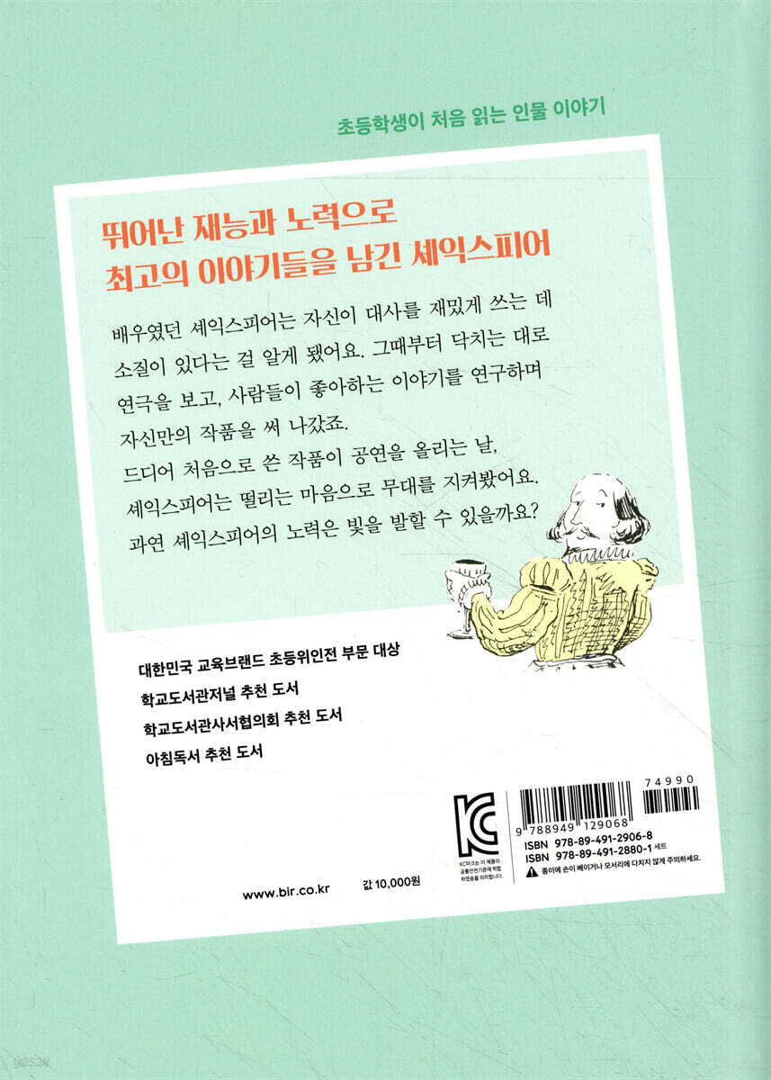 이 책은 시대를 넘어선 세계적인 극작가 셰익스피어의 일생을 담았다. 극작가로서의 재능을 발견하게 된 배우 시절부터 「헨리 6세」를 시작으로 써 나간 위대한 희곡들, 당시 영국 여왕이었던 엘리자베스 1세와의 인연 등 셰익스피어의 삶에서 중요한 흐름들을 하나하나 살펴본다. 이 책은 재능은 처음부터 타고나는 것이 아니라 찾아가는 과정에서 또렷해질 수 있음을 알려 준다. 셰익스피어는 어릴 때부터 연극을 좋아했지만 처음엔 극작가가 아닌 배우의 길을 택했다. 배우로서 대사를 연구하다 보니 대본을 쓰는 데 소질이 있다는 걸 알게 되었고, 뒤늦게 자신의 작품을 써서 큰 성공을 거뒀다. 자신에게는 꿈도 재능도 없는 것 같다며 염려하는 아이들에게 용기를 불어 넣어 준다. 부록에는 셰익스피어 시대에 연극 무대를 표현한 방법과, 당시 배우와 관객들의 모습 등을 소개한다. 또한 꾸준히 공연되고, 연구되고 있는 그의 독창적인 연극 세계를 함께 살펴볼 수 있다. | 시리즈 특징 | ·어린이 눈높이에 꼭 맞는 만듦새! 그림책에서 읽기 책으로 넘어가는 초등 저학년 어린이들의 눈높이에 맞게 글의 분량과 수준을 맞추었고, 딱딱한 설명글이 아닌 동화처럼 술술 읽히는 이야기로 표현했으며, 유머러스하고 친근한 그림으로 보는 맛까지 충족시킨다. 또한 한 손에 쏙 들어오는 아담한 판형과 장정으로 어린이가 혼자 들고 보기에도 딱 좋게 만들었다. ·교과서 인물부터 교양과 상식을 넓히는 인물까지 총망라! [교과서 인물] 초등 교과서 등장인물 35명 초등 교과서 인물들을 필수적으로 소개한다. ‘국어 4-2 6. 본받고 싶은 인물을 찾아봐요’에 수록된 『정약용』, ‘국어 4-1 9. 자랑스러운 한글’과 ‘국어 6-2 1. 작품 속 인물과 나’에 수록된 『주시경』뿐 아니라, 국어, 사회, 과학, 통합교과, 도덕, 음악 등 교과서에 등장하는 인물들의 전 생애를 이 시리즈로 만나 볼 수 있다. [공간별 인물] 한국 인물 35명, 세계 인물 27명 한국 인물과 세계 인물을 고대 인물부터 현대 인물까지 고루 담았다. 건국 신화의 주인공 주몽부터 현대 예술가 백남준까지, 고대 이집트의 클레오파트라부터 현대 동물행동학자 제인 구달까지…… 공간별, 시대별로 주목해야 할 인물과 사건을 훑을 수 있어 어린이들의 상식 범위를 크게 넓힌다. [분야별 인물] 한국사 25명 세계사 8명 과학 9명 사회 11명 예술 9명 어느 한 분야 인물에 치우치지 않도록 했다. 단지 인물의 일대기뿐 아니라, 인물과 관련된 역사, 정치, 사회, 과학, 예술의 기초 지식을 자연스럽게 터득할 수 있다. 어린이들이 자기 관심 분야 인물들을 만나는 경험을 통해 롤 모델을 세울 수도 있을 것이다. ·국내외 대표 어린이 책 작가 총출동! 우리나라를 대표하는 동화 작가들과 일러스트레이터들이 참여한 창작물과 영국 Franklin Watts 출판사의 「Famous People Famous lives」 시리즈의 번역물로 구성되었다. 동화 작가23명, 일러스트레이터 33명, 번역가 8명을 포함해, 참여 작가만 무려 총 64명! 우리나라에서는 평균 십수 년 동안 어린이를 위한 글쓰기에 매진해 온 국내 대표 동화 작가들이 참여했다. 한국어린이도서상, IBBY(국제아동청소년도서협의회) 어너리스트 수상 작가 유은실, 한국문화예술진흥원 올해의 예술상 수상 작가 남찬숙, 황금도깨비상 수상 작가 김종렬 등이 우리 말맛을 리듬감 넘치게 표현해 냈다. 어린이 눈높이에 맞는 고급스러운 어휘들을 풍성하게 담아 독해력과 문학적 표현력을 키워 준다. 또한 한국 안데르센상 수상 작가 곽성화, 부천만화대상 어린이 만화상 수상 작가 김홍모 등 일러스트와 만화 분야에서 종횡무진 하는 대표 작가들이 익살스러운 그림으로 친근감을 더했다. 유영번역상, 한국출판문화상 수상 번역가 정영목 등 국내 최고 번역가들의 번역은 신뢰도를 높인다. ·사진과 연표로 보는 역사 부록 인물의 이야기를 더욱 입체적으로 알 수 있게 하는 두 가지 부록을 곁들였다. 하나는, ‘사진으로 보는 인물 이야기’이다. 실감 나는 사진과 함께 인물과 관련된 다양한 정치, 경제, 사회, 과학 지식을 소개함으로써 인물에 대한 깊이 있는 이해를 돕는다. 또 하나는 ‘비교하면 더 재밌는 역사의 순간’ 연표이다. 특별히 이 연표는 인물의 역사와 시대의 역사를 견주어 살필 수 있도록 구성했다. 역사의 흐름을 읽어 낼 수 있는 유용한 시각 자료가 될 것이다. |
