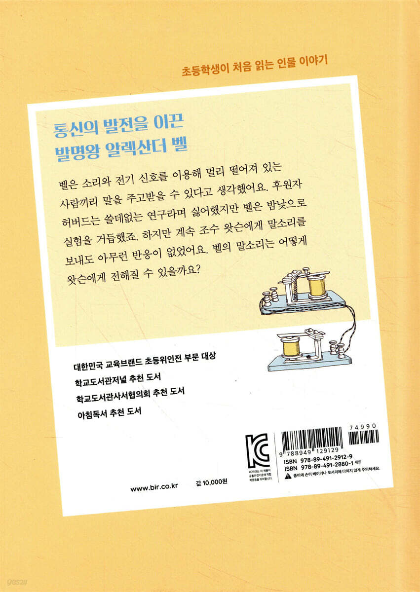 발명왕 알렉산더 벨 이 책은 전화기로 세상을 바꾼 미국의 발명가 알렉산더 벨의 일생을 그린 책이다. 다중 전신기와 전화기, 비행기와 수중익선 등 새로운 발명품을 만들기 위해 끊임없이 노력했던 벨의 열정 가득한 삶을 볼 수 있다. 이 책은 벨이 수많은 발명품을 통해 통신의 획기적인 발전을 이끌게 된 계기가 청각 장애인 교육 때문이었음을 조명한다. 청각 장애인들의 언어를 연구하고, 더 쉽게 의사를 밝힐 수 있는 방법을 연구하다 보니 자연스럽게 ‘소통’에 관심을 갖게 되고, 그 관심이 수많은 발명품들을 낳을 수 있었다. 부록에서는 ‘청각 장애인들의 선생님’이라고 불린 벨의 이야기와 벨이 청각 장애인들에게 가르친 ‘보이는 언어’를 소개한다. 벨의 다양한 발명품들 역시 생생한 사진과 함께 만날 수 있다. | 시리즈 특징 | ·어린이 눈높이에 꼭 맞는 만듦새! 그림책에서 읽기 책으로 넘어가는 초등 저학년 어린이들의 눈높이에 맞게 글의 분량과 수준을 맞추었고, 딱딱한 설명글이 아닌 동화처럼 술술 읽히는 이야기로 표현했으며, 유머러스하고 친근한 그림으로 보는 맛까지 충족시킨다. 또한 한 손에 쏙 들어오는 아담한 판형과 장정으로 어린이가 혼자 들고 보기에도 딱 좋게 만들었다. ·교과서 인물부터 교양과 상식을 넓히는 인물까지 총망라! [교과서 인물] 초등 교과서 등장인물 35명 초등 교과서 인물들을 필수적으로 소개한다. ‘국어 4-2 6. 본받고 싶은 인물을 찾아봐요’에 수록된 『정약용』, ‘국어 4-1 9. 자랑스러운 한글’과 ‘국어 6-2 1. 작품 속 인물과 나’에 수록된 『주시경』뿐 아니라, 국어, 사회, 과학, 통합교과, 도덕, 음악 등 교과서에 등장하는 인물들의 전 생애를 이 시리즈로 만나 볼 수 있다. [공간별 인물] 한국 인물 35명, 세계 인물 27명 한국 인물과 세계 인물을 고대 인물부터 현대 인물까지 고루 담았다. 건국 신화의 주인공 주몽부터 현대 예술가 백남준까지, 고대 이집트의 클레오파트라부터 현대 동물행동학자 제인 구달까지…… 공간별, 시대별로 주목해야 할 인물과 사건을 훑을 수 있어 어린이들의 상식 범위를 크게 넓힌다. [분야별 인물] 한국사 25명 세계사 8명 과학 9명 사회 11명 예술 9명 어느 한 분야 인물에 치우치지 않도록 했다. 단지 인물의 일대기뿐 아니라, 인물과 관련된 역사, 정치, 사회, 과학, 예술의 기초 지식을 자연스럽게 터득할 수 있다. 어린이들이 자기 관심 분야 인물들을 만나는 경험을 통해 롤 모델을 세울 수도 있을 것이다. ·국내외 대표 어린이 책 작가 총출동! 우리나라를 대표하는 동화 작가들과 일러스트레이터들이 참여한 창작물과 영국 Franklin Watts 출판사의 「Famous People Famous lives」 시리즈의 번역물로 구성되었다. 동화 작가23명, 일러스트레이터 33명, 번역가 8명을 포함해, 참여 작가만 무려 총 64명! 우리나라에서는 평균 십수 년 동안 어린이를 위한 글쓰기에 매진해 온 국내 대표 동화 작가들이 참여했다. 한국어린이도서상, IBBY(국제아동청소년도서협의회) 어너리스트 수상 작가 유은실, 한국문화예술진흥원 올해의 예술상 수상 작가 남찬숙, 황금도깨비상 수상 작가 김종렬 등이 우리 말맛을 리듬감 넘치게 표현해 냈다. 어린이 눈높이에 맞는 고급스러운 어휘들을 풍성하게 담아 독해력과 문학적 표현력을 키워 준다. 또한 한국 안데르센상 수상 작가 곽성화, 부천만화대상 어린이 만화상 수상 작가 김홍모 등 일러스트와 만화 분야에서 종횡무진 하는 대표 작가들이 익살스러운 그림으로 친근감을 더했다. 유영번역상, 한국출판문화상 수상 번역가 정영목 등 국내 최고 번역가들의 번역은 신뢰도를 높인다. ·사진과 연표로 보는 역사 부록 인물의 이야기를 더욱 입체적으로 알 수 있게 하는 두 가지 부록을 곁들였다. 하나는, ‘사진으로 보는 인물 이야기’이다. 실감 나는 사진과 함께 인물과 관련된 다양한 정치, 경제, 사회, 과학 지식을 소개함으로써 인물에 대한 깊이 있는 이해를 돕는다. 또 하나는 ‘비교하면 더 재밌는 역사의 순간’ 연표이다. 특별히 이 연표는 인물의 역사와 시대의 역사를 견주어 살필 수 있도록 구성했다. 역사의 흐름을 읽어 낼 수 있는 유용한 시각 자료가 될 것이다. |