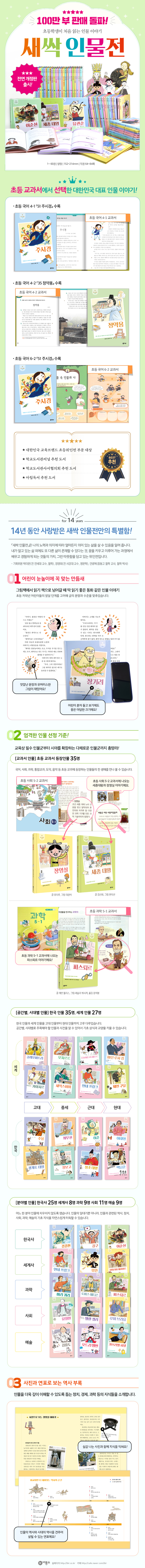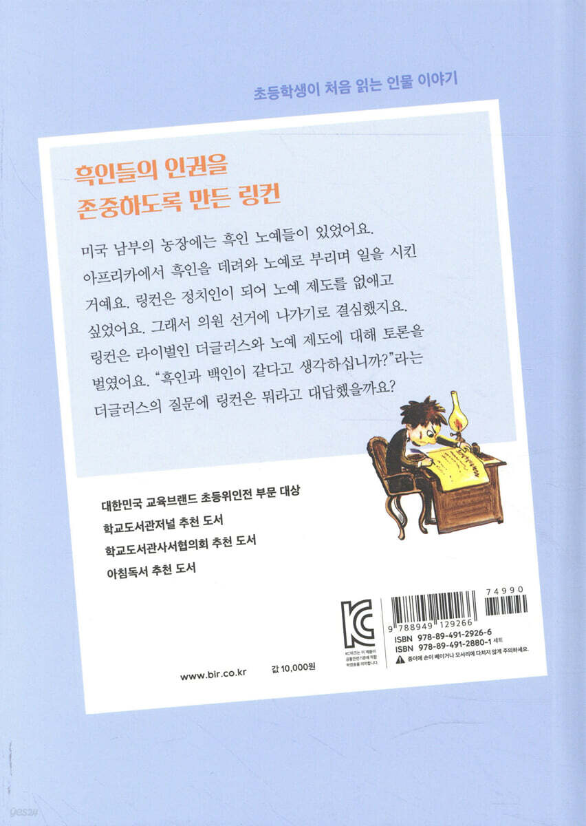 존중하도록 만든 링컨 이 책은 노예 해방을 이룬 미국의 제16대 대통령 링컨의 이야기가 펼쳐진다. 링컨은 뱃사공, 가게 점원, 우편집배원 등으로 일하면서 가난하고 억울한 사람을 돕는 정치인이 되겠다는 꿈을 품었다. 특히 쇠사슬에 묶인 채 끌려가는 흑인 노예들을 본 경험은 오래도록 링컨의 가슴에 남아 노예 해방, 자유와 평등이라는 가치관을 세우는 데 큰 영향을 주었다. 이 책은 눈앞의 이익에 휘둘리지 않고 자신의 가치관에 따라 정치를 펼친 링컨의 모습을 조명한다. 미국에 이익이 된다면 다른 나라의 땅을 빼앗아도 된다고 생각하던 사람들의 비난을 받으면서도 전쟁을 멈춰야 한다고 외쳤고, 노예 제도에 찬성하는 사람들의 위협에도 굴하지 않고 흑인 노예들을 해방시켰다. “국민의, 국민에 의한, 국민을 위한 정부”라는 링컨의 명연설은 민주주의의 정신이 무엇인지, 자유와 평등이 얼마나 값진 것인지를 생각하게 한다. 부록에서는 링컨이 주목했던 미국 노예의 역사를 소개하고, 노예 제도와 미국 남북 전쟁과의 관계를 알아본다. 이어서 민주주의 가치를 일깨우며 링컨을 훌륭한 연설가로 기억하게 한 ‘게티즈버그 연설’에 얽힌 역사를 돌아본다. 또 우리나라 국회와 미국 국회의 공통점과 차이점을 통해서 국회가 어떻게 구성된 기관인지도 살펴볼 수 있다. | 시리즈 특징 | ·어린이 눈높이에 꼭 맞는 만듦새! 그림책에서 읽기 책으로 넘어가는 초등 저학년 어린이들의 눈높이에 맞게 글의 분량과 수준을 맞추었고, 딱딱한 설명글이 아닌 동화처럼 술술 읽히는 이야기로 표현했으며, 유머러스하고 친근한 그림으로 보는 맛까지 충족시킨다. 또한 한 손에 쏙 들어오는 아담한 판형과 장정으로 어린이가 혼자 들고 보기에도 딱 좋게 만들었다. ·교과서 인물부터 교양과 상식을 넓히는 인물까지 총망라! [교과서 인물] 초등 교과서 등장인물 35명 초등 교과서 인물들을 필수적으로 소개한다. ‘국어 4-2 6. 본받고 싶은 인물을 찾아봐요’에 수록된 『정약용』, ‘국어 4-1 9. 자랑스러운 한글’과 ‘국어 6-2 1. 작품 속 인물과 나’에 수록된 『주시경』뿐 아니라, 국어, 사회, 과학, 통합교과, 도덕, 음악 등 교과서에 등장하는 인물들의 전 생애를 이 시리즈로 만나 볼 수 있다. [공간별 인물] 한국 인물 35명, 세계 인물 27명 한국 인물과 세계 인물을 고대 인물부터 현대 인물까지 고루 담았다. 건국 신화의 주인공 주몽부터 현대 예술가 백남준까지, 고대 이집트의 클레오파트라부터 현대 동물행동학자 제인 구달까지…… 공간별, 시대별로 주목해야 할 인물과 사건을 훑을 수 있어 어린이들의 상식 범위를 크게 넓힌다. [분야별 인물] 한국사 25명 세계사 8명 과학 9명 사회 11명 예술 9명 어느 한 분야 인물에 치우치지 않도록 했다. 단지 인물의 일대기뿐 아니라, 인물과 관련된 역사, 정치, 사회, 과학, 예술의 기초 지식을 자연스럽게 터득할 수 있다. 어린이들이 자기 관심 분야 인물들을 만나는 경험을 통해 롤 모델을 세울 수도 있을 것이다. ·국내외 대표 어린이 책 작가 총출동! 우리나라를 대표하는 동화 작가들과 일러스트레이터들이 참여한 창작물과 영국 Franklin Watts 출판사의 「Famous People Famous lives」 시리즈의 번역물로 구성되었다. 동화 작가23명, 일러스트레이터 33명, 번역가 8명을 포함해, 참여 작가만 무려 총 64명! 우리나라에서는 평균 십수 년 동안 어린이를 위한 글쓰기에 매진해 온 국내 대표 동화 작가들이 참여했다. 한국어린이도서상, IBBY(국제아동청소년도서협의회) 어너리스트 수상 작가 유은실, 한국문화예술진흥원 올해의 예술상 수상 작가 남찬숙, 황금도깨비상 수상 작가 김종렬 등이 우리 말맛을 리듬감 넘치게 표현해 냈다. 어린이 눈높이에 맞는 고급스러운 어휘들을 풍성하게 담아 독해력과 문학적 표현력을 키워 준다. 또한 한국 안데르센상 수상 작가 곽성화, 부천만화대상 어린이 만화상 수상 작가 김홍모 등 일러스트와 만화 분야에서 종횡무진 하는 대표 작가들이 익살스러운 그림으로 친근감을 더했다. 유영번역상, 한국출판문화상 수상 번역가 정영목 등 국내 최고 번역가들의 번역은 신뢰도를 높인다. ·사진과 연표로 보는 역사 부록 인물의 이야기를 더욱 입체적으로 알 수 있게 하는 두 가지 부록을 곁들였다. 하나는, ‘사진으로 보는 인물 이야기’이다. 실감 나는 사진과 함께 인물과 관련된 다양한 정치, 경제, 사회, 과학 지식을 소개함으로써 인물에 대한 깊이 있는 이해를 돕는다. 또 하나는 ‘비교하면 더 재밌는 역사의 순간’ 연표이다. 특별히 이 연표는 인물의 역사와 시대의 역사를 견주어 살필 수 있도록 구성했다. 역사의 흐름을 읽어 낼 수 있는 유용한 시각 자료가 될 것이다. |