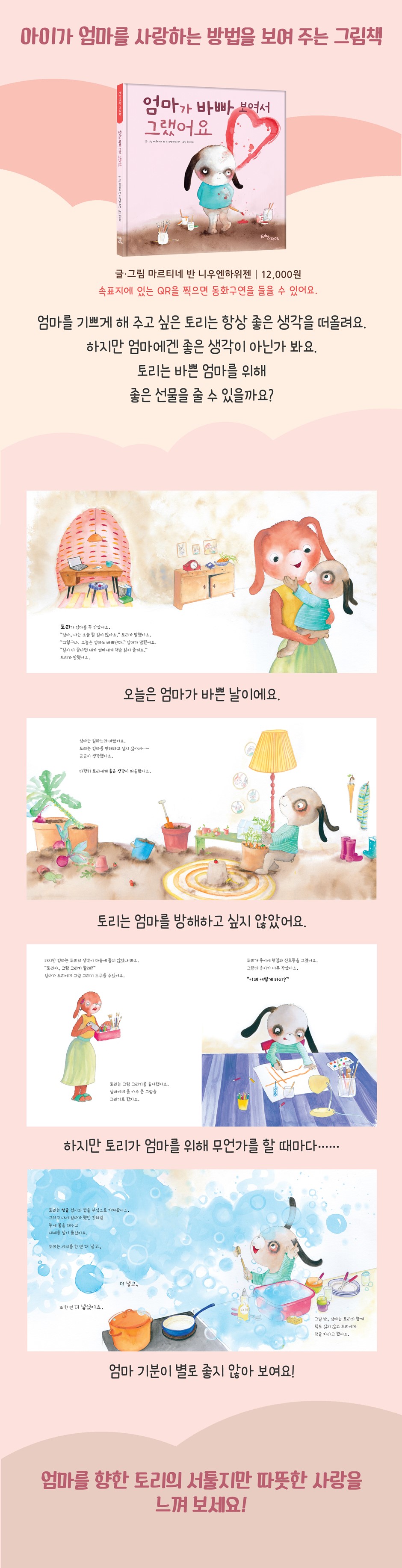 『엄마가 바빠 보여서 그랬어요』는 아이들의 모습을 잘 묘사한 그림책입니다. 아이들은 의도치 않은 사고를 치곤 합니다. 아직 어른처럼 몸을 움직이지 못해 무언가를 엎지르기도 하고, 뒷일을 생각하지 못하고 일을 벌이기도 하지요. 아이들은 엄마를 위한 일을 하려다 사고를 치는 토리의 모습에 공감할 거예요. 그리고 함께 읽는 어른들은 엄마를 위해 혼자서 곰곰이 생각하는 토리의 모습에 슬며시 미소가 지어질 거예요. 바쁜 엄마를 배려하는 아이의 사랑 토리는 엄마가 바쁘다는 걸 알고 있었어요. 엄마를 방해하고 싶지 않았던 토리는 먼저 할 일이 많다고 이야기하지요. 엄마에게 주려고 모래 케이크를 만들고, 커다란 그림을 그리는 등 내내 토리는 엄마 생각뿐이에요. 의도하지 않게 사고를 쳤지만, 엄마를 생각하는 토리의 사랑은 엄마에게 큰 힘이 되어 줍니다. |