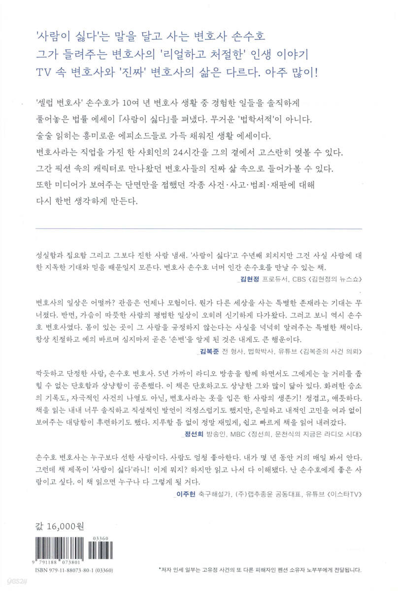 세상 깍듯하고 단정한 사람, 손수호 변호사. 5년 가까이 라디오 방송을 함께 하면서도 그에게는 늘 거리를 좁힐 수 없는 단호함과 상냥함, 상반된 느낌이 공존했다. 이 책은 단호하고도 상냥한 그와 많이 닮아 있다. 화려한 승소의 기록도, 자극적인 사건의 나열도 아닌, 변호사라는 옷을 입은 한 사람의 처절한 생존기! 정겹고, 애틋하다. 책을 읽는 내내 너무 솔직하고 직설적인 발언이 걱정스럽기도 했지만, 은밀하고 내적인 고민을 여과 없이 보여주는 저자의 대담함이 후련하기도 했다. 지루할 틈 없이 정말 재밌게, 쉽고 빠르게 책을 읽어 내려갔다. - 정선희 (방송인, MBC [정선희, 문천식의 지금은 라디오 시대])