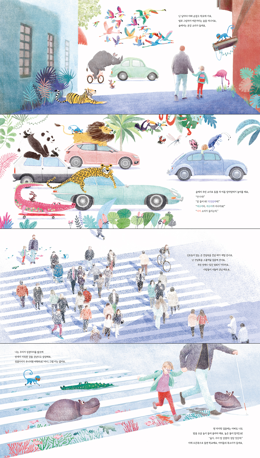아빠랑 나는 시각 장애인이에요. 난 조금은 볼 수 있고, 아빠는 하나도 못 봐요. 아빠는 조금은 볼 수 있는 나를 ‘길잡이별’이라고 부르지만, 사실 나를 이끄는 사람은 아빠랍니다. 아빠는 눈이 안 보이지만 나보다도, 세상 누구보다도 훨씬 더 많은 걸 보거든요. 아빠는 나를 안전하게 지켜 주는 ‘수호천사’예요. 아침마다 아빠는 커다란 손으로 조그만 내 손을 감싸고 학교에 데려다줘요. 학교 가는 길에 우리는 동물 차 이름 알아맞히기 놀이도 하고, 지팡이를 두드리며 리듬에 맞춰 노래를 부르기도 하죠. 제일 짜릿한 건 신호등이 있는 건널목을 건널 때예요. 흐릿한 빨간불이 흐릿한 파란불로 바뀌면, 우린 출발해요. 가슴이 두근거려요! 잘 건널 수 있을까요? 아빠와 함께하는 등굣길, 신나는 놀이이자 모험 이 책은 딸의 목소리로 시각장애인 부녀의 등굣길 여정을 독자에게 찬찬히 들려줍니다. 집에서 학교에 가는 지극히 평범한 일상이지만, 이 부녀의 등굣길 여정은 신나는 놀이이자 모험입니다. 아빠와 함께라면 학교 가는 길은 숲이 되고, 차도를 쌩쌩 달리는 자동차는 숲을 질주하는 동물들이 되죠. 흰지팡이는 악기가, 건널목은 징검다리가 되고요. 두 사람은 손을 꼭 잡고 빛과 그림자가 어른거리는 숲을 지나고, 동물들 이름을 알아맞히고, 징검다리를 한 발 한 발 밟으며 안개가 자욱한 강을 건넙니다. 딸은 눈이 하나도 보이지 않아도 길을 걷다 옆을 스쳐 간 사람의 슬픔을 알아채고, 다가오는 이웃에게 인사하고, 바다의 아름다움을 이야기하는 아빠가 너무나도 놀랍고 자랑스러워요. 그리고 세상 누구보다도 훨씬 더 많은 걸 보고 언제나 든든하게 자신을 지켜 주는 아빠에게 무한한 신뢰를 보내죠. 실화를 바탕으로 한 이야기, 텍스트의 의미를 풍부하게 하는 섬세한 그림 그동안 다양한 작품에서 장애, 난민, 소수민족, 빈곤 등 더불어 사는 사회에 꾸준히 관심을 기울여 온 글 작가 곤살로 모우레가 이번에는 서로의 길잡이별이 되고 수호천사가 되는 시각 장애인 부녀의 이야기를 아름답게 풀어 놓았습니다. 스페인 라스팔마스에서 한쪽 눈에 안대를 하고 두꺼운 안경을 쓴 소녀와 흰지팡이를 든 아빠가 손을 꼭 잡고 학교 가는 모습을 보고 이 이야기를 떠올렸다고 해요. 여러 글 작가들과 협업하며 텍스트의 의미를 한층 넓고 풍부하게 해 온 그림 작가 마리아 히론은 특유의 섬세한 표현과 포근한 색감으로 주인공들이 느끼는 세상을 독자들의 눈앞에 펼쳐 놓았습니다. 덕분에 아빠와 딸의 꼭 잡은 두 손과 끈끈한 사람이 고스란히 전해지고, 현실 장면과 천연덕스럽게 어우러진 상상 장면이 기분 좋은 감동을 선사하죠. 장면마다 등장하는 파란 원숭이가 웃음을 자아내고요. 이 책은 해마다 스페인 콰트로가토스Cuatrogatos 재단이 스페인, 남미 등 스페인어 권역에서 출간된 스페인어 책 중 단 20권에게 수여하는 문학상을 수상하였고, 뉴욕 공립 도서관 베스트북에 선정되었습니다. *흰지팡이의 의미 길거리에서 지팡이를 들고 보행하는 시각장애인을 마주친 경험이 있을 것입니다. 그런데 시각장애인의 지팡이가 흰색이라는 사실, 알고 있었나요? 지체장애인이나 노인의 지팡이와 구별하기 위해 시각장애인이 아닌 사람이 흰지팡이를 사용하는 것을 금하고 있어요. 흰지팡이는 시각장애인에게 장애물의 위치와 지형의 변화를 알려주어 예상치 못한 상황에서도 신속하게 대응할 수 있도록 돕는 도구로, 시각장애인의 표지이자 시각장애인의 독립성을 상징합니다. *2021 스페인 콰트로가토스Cuatrogatos 재단 어워드 수상 도서 *2020 뉴욕공립도서관 베스트북 |