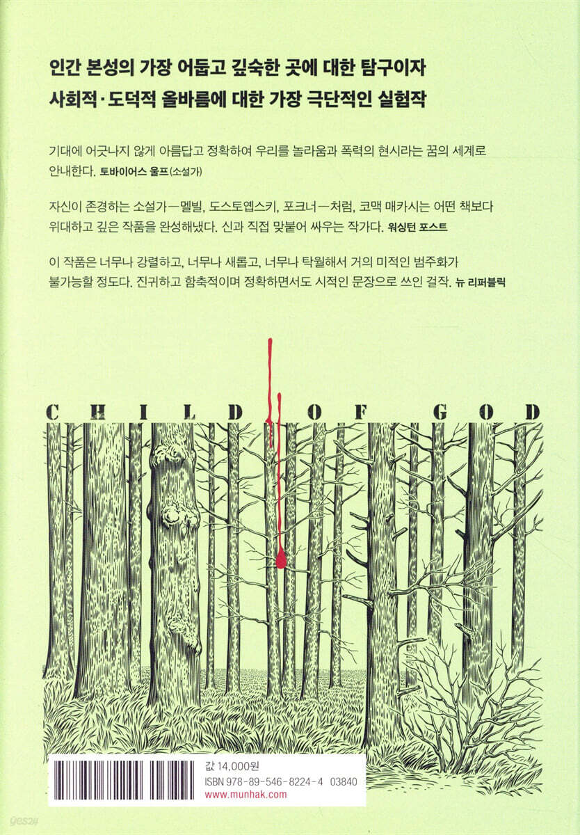 우리를 놀라움과 폭력의 현시라는 꿈의 세계로 안내한다.” -토바이어스 울프(소설가) 인간의 타락과 삶의 가장 추악한 면을 조명하는 거장의 강렬하고 독보적인 시선 1960년대 테네시주 서비어 카운티. 스물일곱의 레스터 밸러드는 살던 집을 경매로 잃고 황량한 오두막을 무단으로 점거해 지내고 있다. 어린 시절 어머니가 도망가고 아버지가 목매달아 죽은 모습을 목격한 후 그는 가족이나 가까운 친구 없이 대체로 혼자 지내며 때때로 폭력적인 성향을 내보인다. 밤에 도로에 혼자 구부정하게 웅크리고 있거나 산속을 어슬렁거리는 밸러드의 손에는 늘 라이플이 들려 있고, 그는 감자로 끼니를 때우거나 물고기나 새, 토끼 같은 짐승을 사냥해 먹으며 하루하루를 살아간다. 어느 날 밸러드는 한적한 산의 공터에서 차를 세워놓고 섹스를 하는 커플을 발견한다. 차 안을 훔쳐보며 자위를 하던 그는 커플에게 그 모습을 들키고, 남자의 위협에 이 “엉뚱한 곳에 들어선 사랑 없는 유인원의 형체”는 허둥지둥 도망을 친다. 그리고 얼마 뒤 밸러드는 같은 장소를 지나다, 이번에는 차 안에서 섹스를 하는 도중 사망한 남녀를 발견한다. 남자의 지갑을 훔친 뒤 잠시 망설이던 그는 여자의 시신을 강간하고 급기야 시체를 집으로 가져간다. 다음날 그는 훔친 돈으로 시내에서 여자 옷과 속옷을 구입해 시신에 입히고, 시체는 줄로 묶어 사다리를 이용해 다락에 올렸다 내리며 보관한다. 그러다 어느 추운 밤 오두막에 불이 나 집 전체가 흔적도 없이 타버리고, 밸러드는 시체를 구하려 애쓰지만 실패한다. 오두막마저 잃은 그는 이제 동굴에서 지낸다. 그의 행동은 점점 더 흉포해지고 과감해져서, 트럭을 세워놓고 데이트를 하던 남녀를 총으로 쏴 죽인 다음 여자의 시체를 가지고 동굴로 가거나, 알고 지내던 가족의 여자를 죽이고 집을 불태우기도 한다. 그렇게 혹독한 겨울을 보내고 큰 홍수를 견디고 난 뒤 봄이 찾아왔을 때쯤, 밸러드의 악행도 서서히 끝을 향해 가기 시작한다. “아마도 당신과 다를 바 없을 하느님의 자녀”이자 “섬뜩한 짓을 벌이는 자, 시간제로 시체를 먹는 악귀” 작품의 주인공 레스터 밸러드는 이 작품을 집필할 당시 테네시주에 살던 코맥 매카시가 신문에서 본 이야기를 토대로 만든 캐릭터로, 작가는 이 인물에게 왠지 모를 연민을 느꼈다고 한다. 하지만 그렇다고 독자에게 그의 용서를 바라거나 그의 행동을 설명할 만한 사회적 · 심리적 이론을 제시하려는 것은 아니다. 실제로 작품 속에서 극단으로 치닫는 레스터의 행동은 섬뜩하고 혐오스러우며 작가 또한 그를 “가짜 복사(服事) 또는 살균된 중범죄자, 섬뜩한 짓을 벌이는 자, 시간제로 시체를 먹는 악귀”로 묘사한다. 하지만 한편으로 부모로부터 버림받고 얼마 되지 않는 유대관계에서도 떨어져나온 레스터가 문명과 사회를 뒤로하고 철저하게 혼자가 되면서 느끼는 외로움과 불행이 독자에게 생생하게 전달되기도 한다. 그리고 어쩌면 이 작품의 핵심일, “아마도 당신과 다를 바 없을 하느님의 자녀”라는 구절은, 혐오감과 부정적인 감정에도 불구하고 밸러드의 이야기를 끝까지 읽을 수밖에 없게 만든다. 사회질서 바깥에서 존재하기 위한 한 인물의 처참한 시도를 그린 이 소설은 서술 방식 또한 전통적인 규범과 스타일에서 벗어나 있다. 애초에 단독 서술자라는 개념 자체가 존재하지 않아서, 시점도 말하는 이가 누구인지 알 수 없는 일인칭과 삼인칭을 왔다갔다한다. 인물 사이의 대화는 따옴표 없이 쓰였고, 무미건조한 서술이 이어지는가 하면 지극히 시적인 묘사가 불쑥 등장해 작품 전체에 특유의 아름다우면서도 강렬한 분위기를 드리운다. ‘신의 아이’라는 제목에서 짐작할 수 있듯 소설은 상징과 암시가 가득해 우화나 신화, 혹은 구약 성경의 에피소드처럼 읽히기도 한다. 그리고 내용 면에서나 형식 면에서나 기존의 관습적인 틀에 얽매이지 않으면서도 그 자체로 탁월한 완성도를 보여준다. 마흔의 나이에 쓴 세번째 작품에서, 이 시대의 거장 코맥 매카시는 이미 자신만이 구현할 수 있는 독자적인 작품 세계를 확고하게 구축한 것이다. 자신이 존경하는 소설가―멜빌, 도스토옙스키, 포크너―처럼, 코맥 매카시는 어떤 책보다 위대하고 깊은 작품을 완성해냈다. 신과 직접 맞붙어 싸우는 작가다. -워싱턴 포스트 이 작품은 너무나 강렬하고, 너무나 새롭고, 너무나 탁월해서 거의 미적인 범주화가 불가능할 정도다. 진귀하고 함축적이며 정확하면서도 시적인 문장으로 쓰인 걸작. -뉴 리퍼블릭 매카시는 아슬아슬한 웅변, 복잡한 운율과 놀라운 정확성을 결합해 최고의 남부 스타일을 선보인다. (…) ‘신의 아이’는 결코 헛된 제목이 아니다. 주인공 밸러드는 당신과 나 그리고 작가이며, 우리는 이 책을 잊지 못할 것이다. -뉴욕 타임스 매카시는 종교적 감정을 다루는 소설가이다. 우리 시대의 문학적, 지적 요구에 자신의 뜻을 굽히지 않고 또 완고하게 거부한다. -뉴요커 코맥 매카시는 주인공이 얼마나 끔찍한 행동을 하든 공감을 이끌어낼 수 있는 막강하고 비범한 작가다. -선데이 타임스 매카시는 열정과 애정