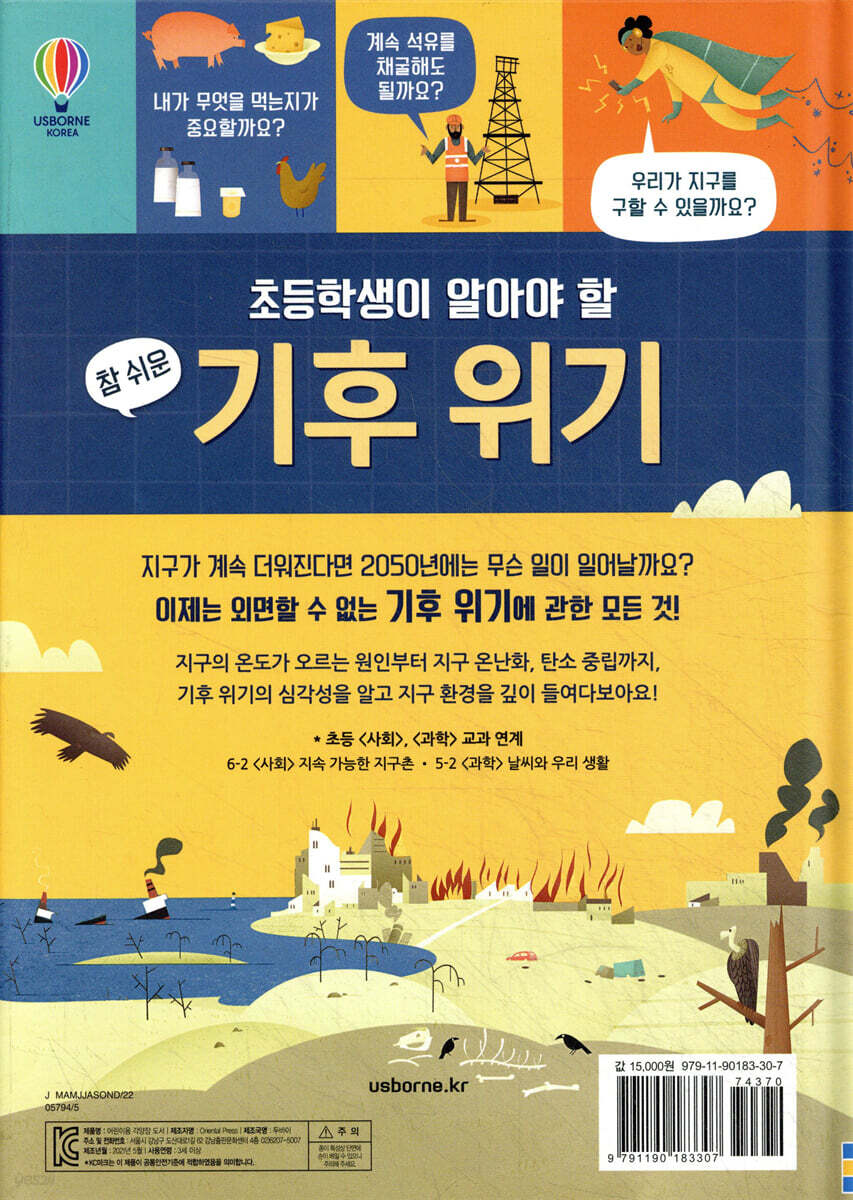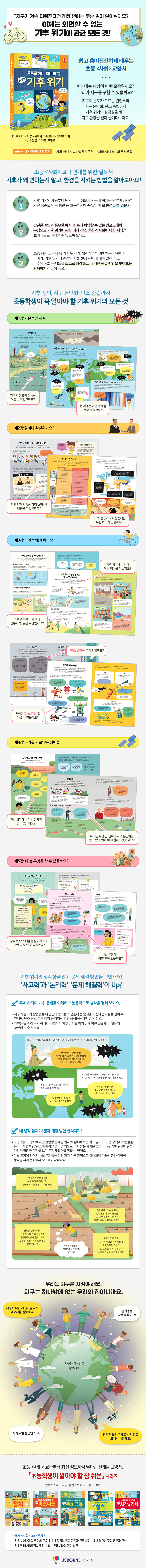 초등학생이 꼭 알아야 할 기후 위기의 모든 것 *초등 〈사회〉, 〈과학〉 교과 연계 〈사회〉 6-2 지속 가능한 지구촌 〈과학〉 5-2 날씨와 우리 생활 총 다섯 장으로 구성된 이 책은 지구의 온도가 오르는 이유, 기후 위기가 우리 삶에 미치는 영향, 환경을 지키는 방법을 조목조목 풀어나간다. 기후 위기의 개념부터 더워지는 지구의 실상, IPCC, 기후 정의, 탄소 중립에 대해 살펴본다. 기후 위기란 인간이 하는 행동들 때문에 지구의 기후가 계속 더워지는 현상이라는 정의부터 알려 준 다음, 기후 위기가 얼마나 큰 문제인지 알아본다. 제1장에서는 기후 위기의 ‘기본적인 사실’은 사람들이 이산화탄소를 많이 배출해서 지구의 기온이 올라 기후가 변했다는 사실을 설명한다. 제2장에서는 ‘IPCC’의 보고서를 토대로 기후 변화가 정말 일어나고 있는지, 탄소가 어디서 배출되고 있는지 알아본다. 이어서 제3장에서는 개인이나 기업, 정부가 ‘기후 위기 해결을 위해 해야 할 일’을 살펴본다. 제4장에서는 왜 기후 위기를 막기 위한 적극적인 대응이 일어나지 않는지, 환경을 지키려는 변화에 어떤 ‘장애물’이 있는지를 다룬다. 마지막으로 제5장에서는 ‘나 자신이 할 수 있는 일’에 대해 두루 살펴본다. 가능한 한 비행기를 타지 않기, 사회 운동 참여하기, 기후 위기에 대해 사람들과 이야기하기 등 환경을 지키는 방법을 생각해 본다. 기후 위기의 심각성을 알고 난 다음에는 이러한 사회에 관심을 기울이고 환경에 관한 생각을 정리해 본다. 기후 위기의 원인부터 기온이 상승했을 때의 문제점, 개인, 기업, 정부가 해야 할 일까지 아우르며 자세하고 구체적으로 기후 위기의 개념을 익혀 가는 과정에서 합리적이고 종합적으로 사고하는 능력을 갖출 수 있게 도울 것이다. 기후 위기의 심각성을 알고 문제 해결 방안을 고민해요! ‘사고력’과 ‘논리력’, ‘문제 해결력’이 Up! 이 책은 지구의 온도가 상승했을 때 인간과 동식물의 생존에 큰 영향을 미친다는 사실을 짚어 주고, 알베도, 탄소 중립, 기후 정의 등 다양한 환경 상식들을 함께 알려 준다. 또한 개인은 물론 각 국의 정치인, 사업가가 기후 위기를 막기 위해 어떤 일을 할 수 있는지 고민해 볼 수 있다. ‘기후 변화도 중요하지만 전염병 문제를 먼저 해결해야 하는 건 아닐까?’, ‘어떤 정책이 사람들을 움직이게 할까?’, ‘탄소 배출량을 줄이면 역으로 피해 받는 사람은 없을까?’ 등 기후 변화를 위한 질문들에 대한 답을 찾는 과정을 통해 기후 위기에 관한 다양한 입장과 관점을 소개한다. 어린이들은 대화에서 이어지는 문제를 해결하기 위해 자신의 의견을 스스로 정리하고 의견을 뒷받침할 근거도 생각해 볼 수 있을 것이다. 또한 공정한 기후 위기 해결책은 무엇이 있는지, 개인의 선택이 시장과 환경에 어떤 영향을 주는지, 세계 지도자들이 가장 많이 모인 파리 회의에서는 어떤 약속을 했는지 등 어린이들이 사회를 이해하기 위해 반드시 알아야 할 기후 위기와 관련된 사회 이슈도 제시하고 있다. 기후 위기에 대해서 친구, 가족, 선생님과 이야기해 보는 과정을 통해 사고력과 논리력, 문제 해결력을 기를 수 있을 것이다. 초등 눈높이에 꼭 맞는 친절한 설명과 유머러스한 그림 만화, 지도, 인포그래픽 등 다양한 형식의 알록달록하고 아기자기한 그림이 아이들의 시선을 사로잡는다. 기후 위기와 관련된 여러 개념을 만화 형식과 결합한 인포그래픽 방식으로 한눈에 보여 주어 관련 내용을 보다 효과적으로 이해하도록 돕는다. 기후 위기라는 개념을 처음 접하는 아이들도 누구나 이해할 수 있도록, 이야기의 흐름에 맞는 구체적인 그림과 명확한 설명을 통해 핵심 주제와 개념을 설명해 준다. 덕분에 아이들은 낯설고 어려운 용어도 막힘없이 받아들일 수 있다. 실제 일어났던 상황 예시와 그림은 기후 위기와 관련된 사건과 개념을 쉽게 이해하고, 기후 위기와 관련된 사회 현상까지 알 수 있다. 말풍선 속 대화는 마치 만화를 보듯이 이야기에 푹 빠져들게 해 지식을 효과적으로 익힐 수 있게 도와준다. |